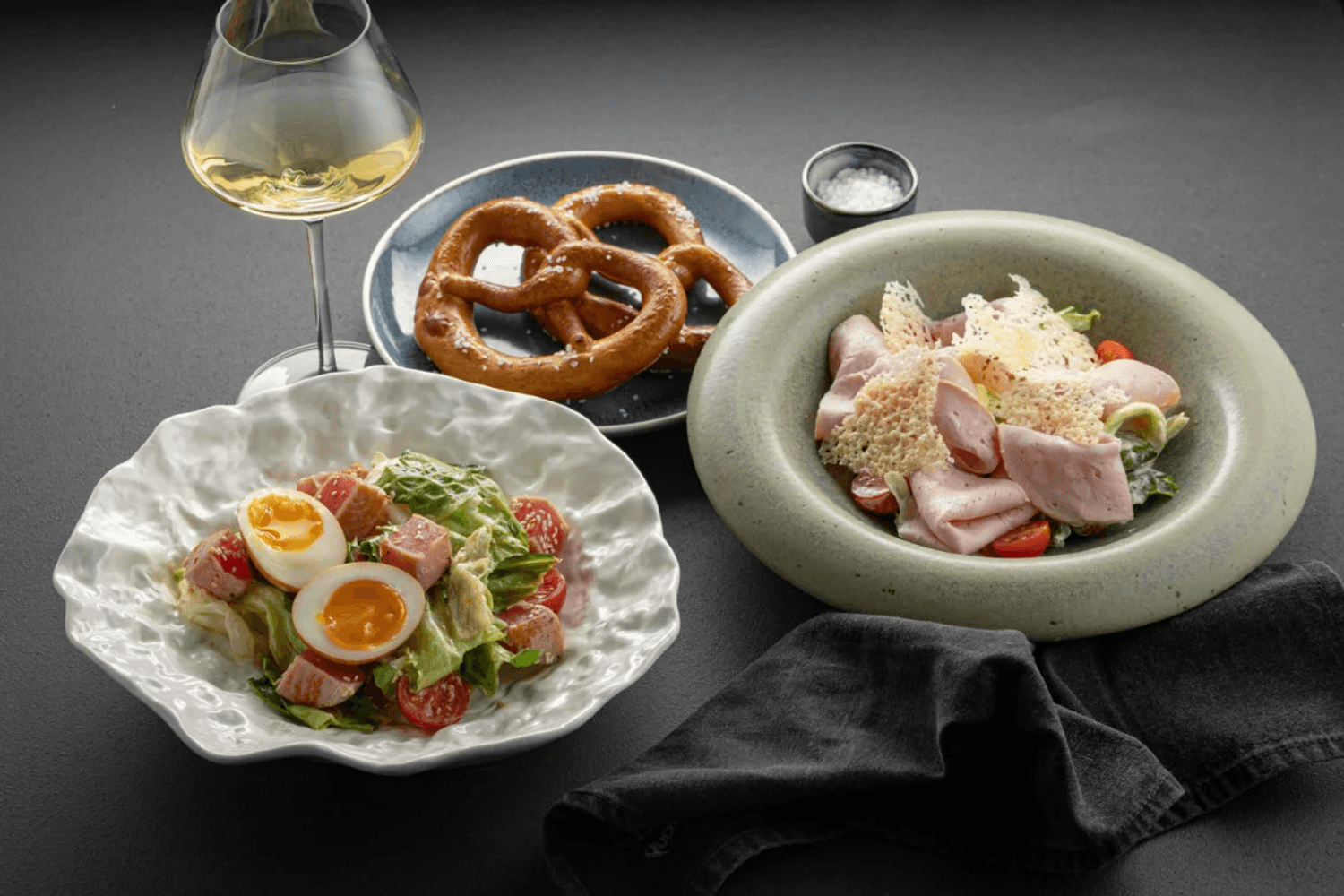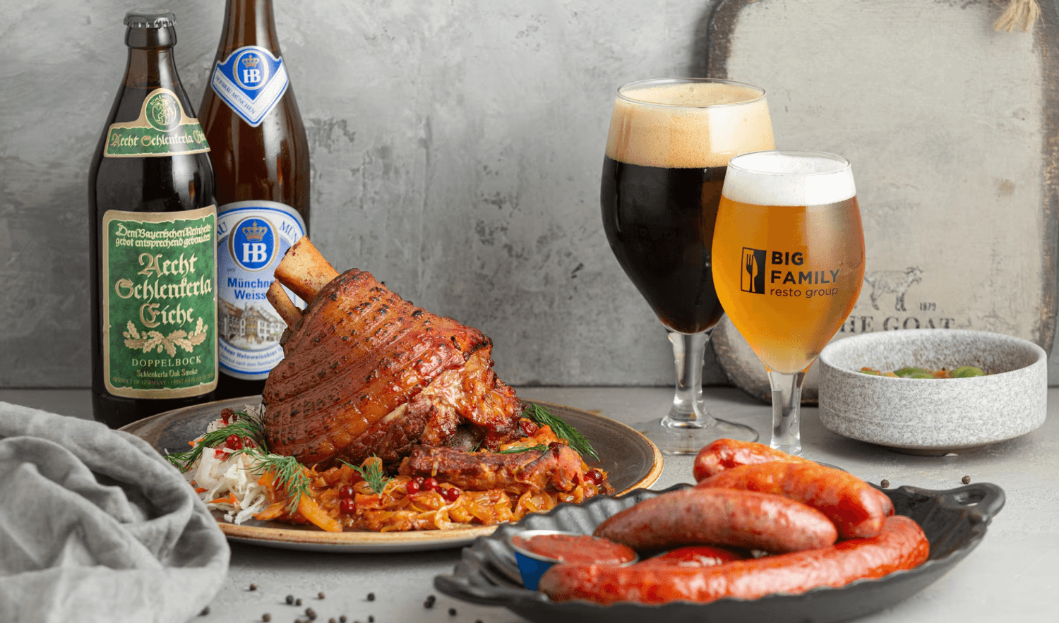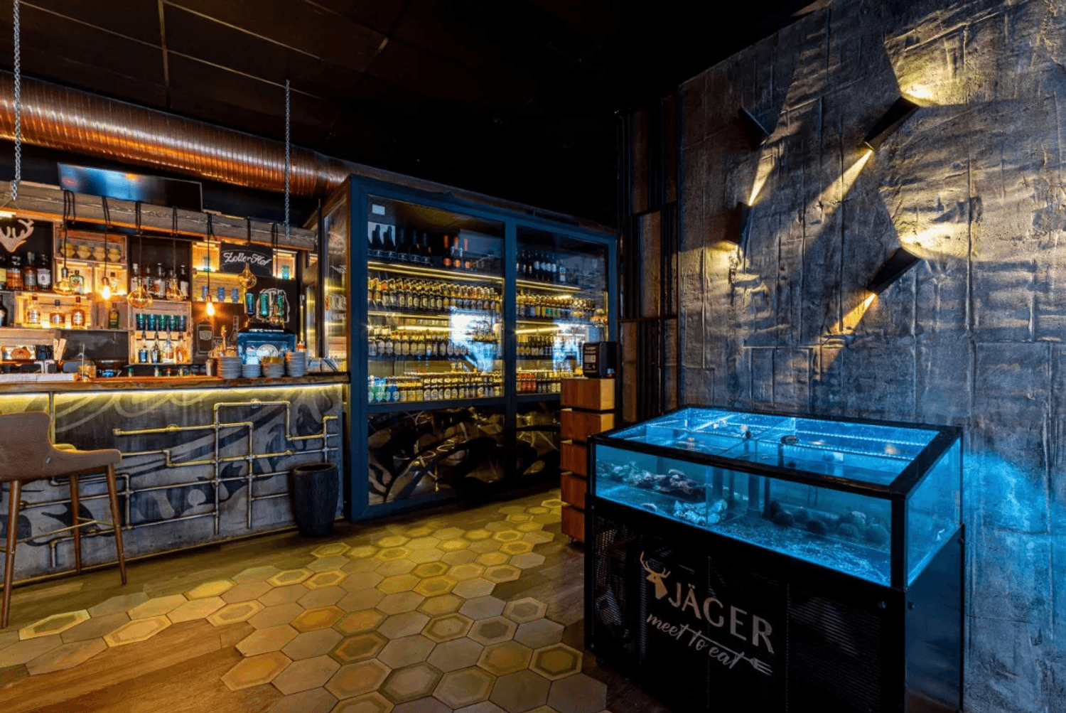 Еда и напитки. В меню — немецкие блюда: пепперони колбаски, стейк скерт с битыми огурцами и соусом блэк пеппер, свиные ребра в соусе барбекю и рыба по-баварски в слоеном тесте. Готовят пиццу том-ям с морепродуктами, маргариту с соусом песто и грибную с пряной курой, а на десерт дубайский шоколадный ганаш и штрудель из ревеня с мороженым.