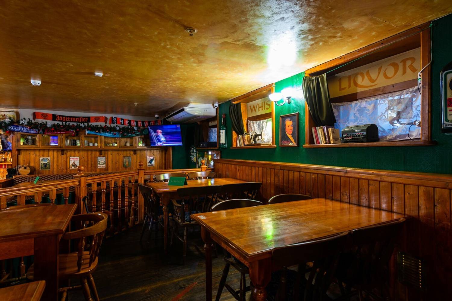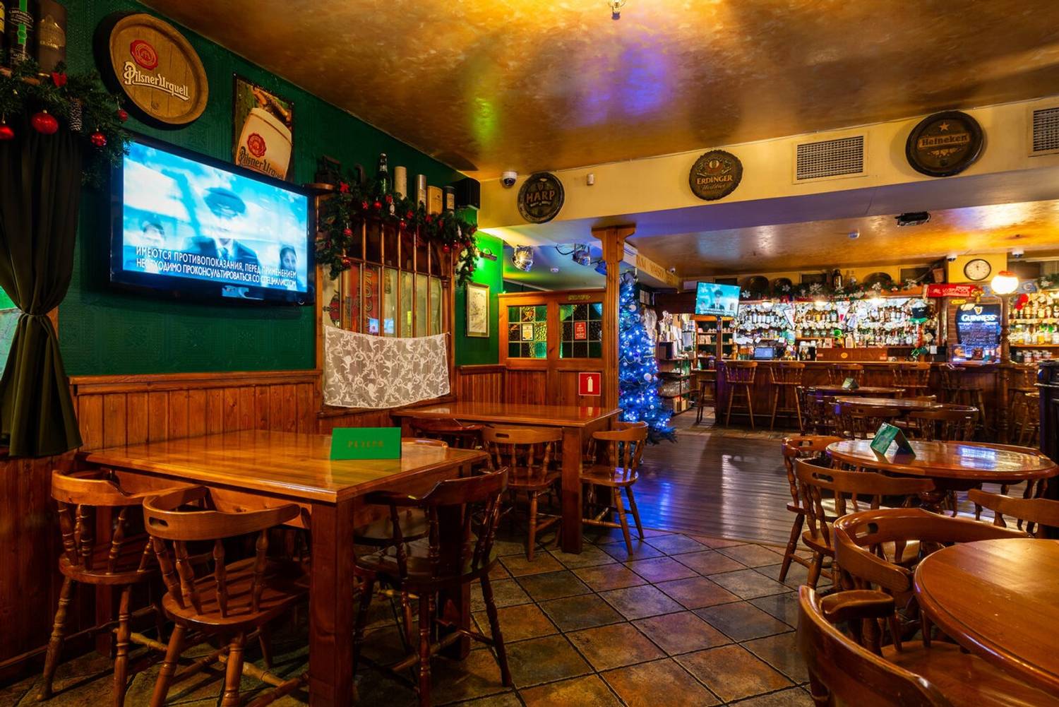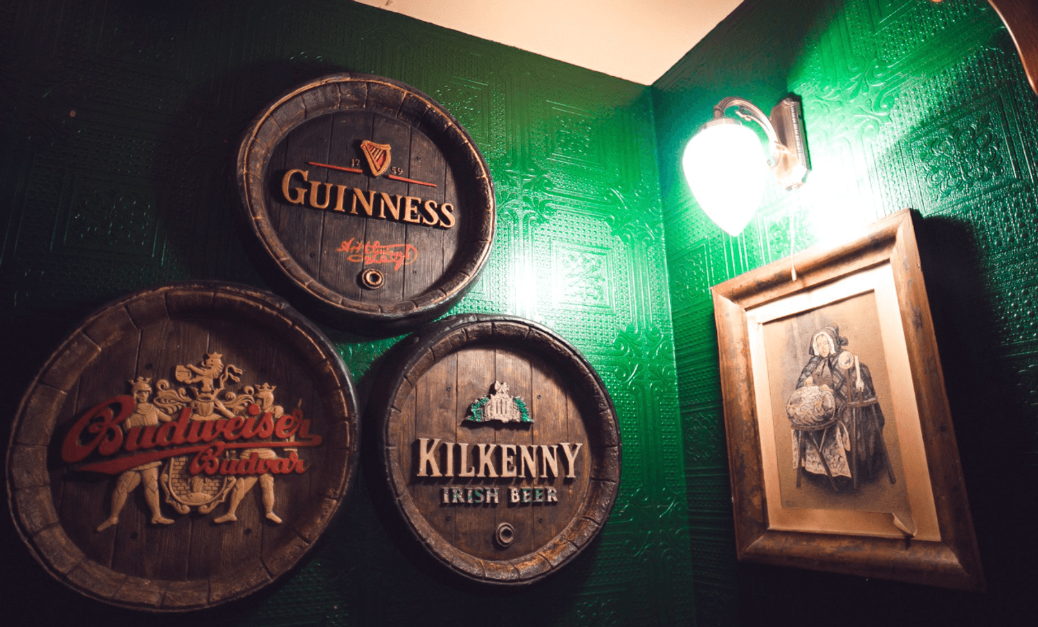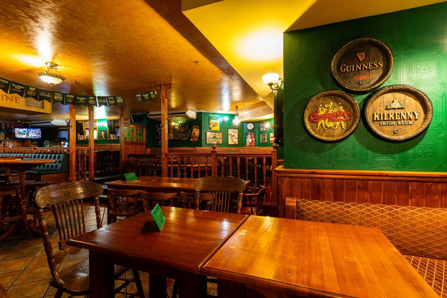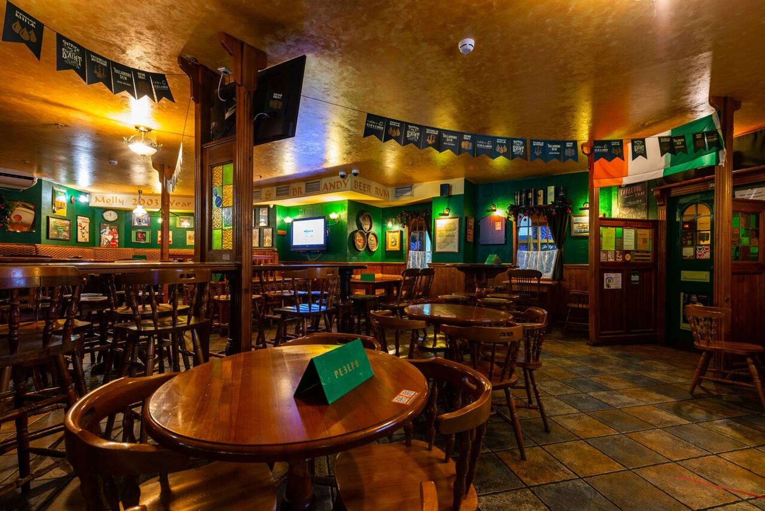 Атмосфера. Здесь оформили заведение по традициям ирландского паба: на стенах развешаны футбольные шарфы, постеры, ирландский флаг и декоративные крышки от пивных бочонков с названиями сортов пива. Здесь за кружкой разливного пива собираются спортивные фанаты, чтобы вместе смотреть трансляции матчей.