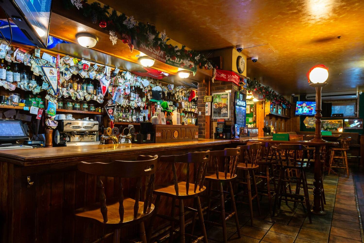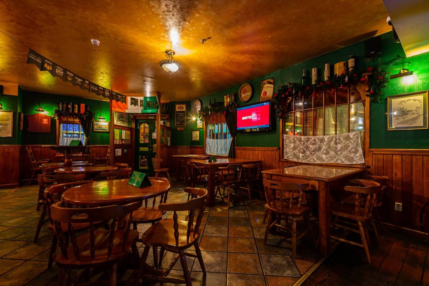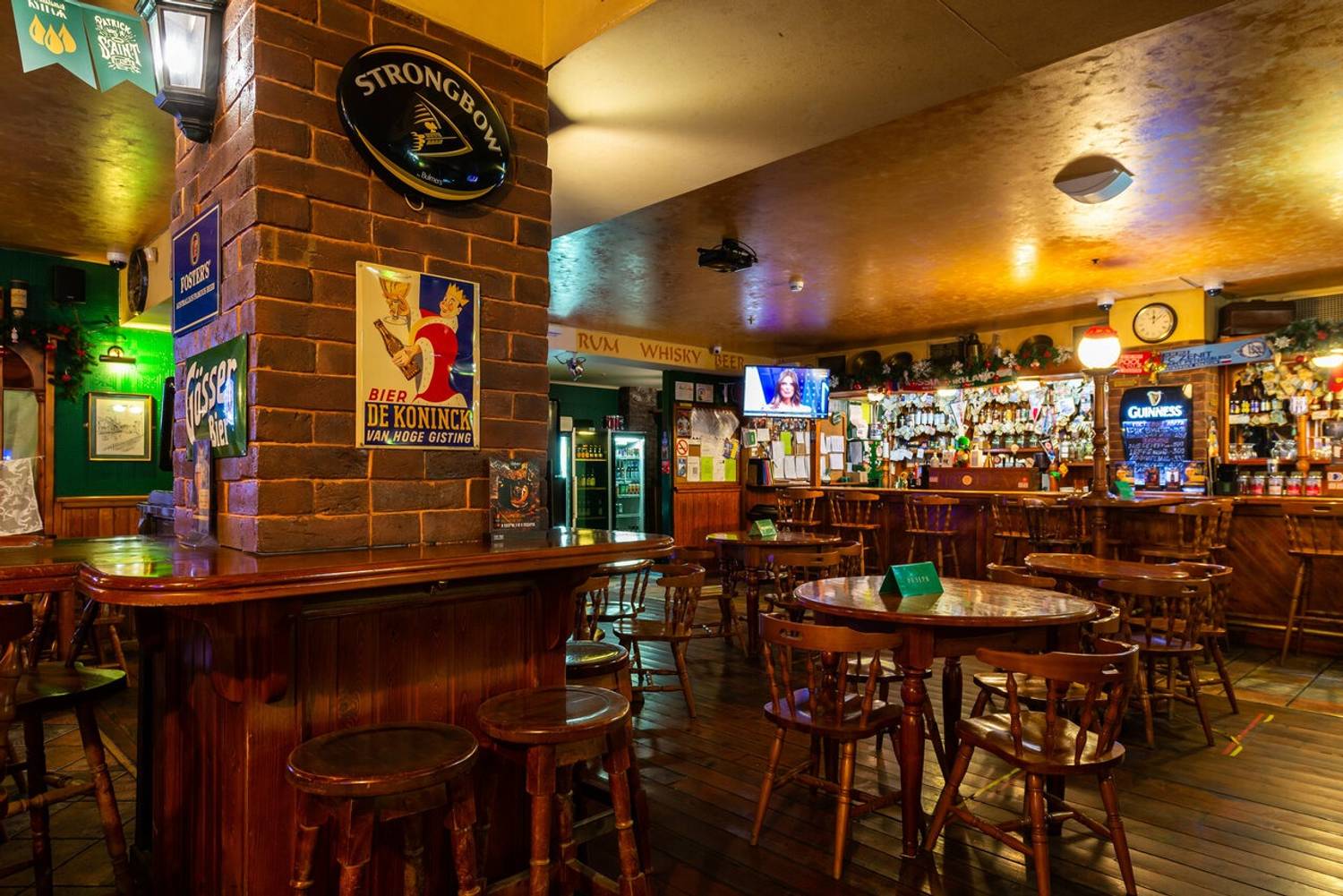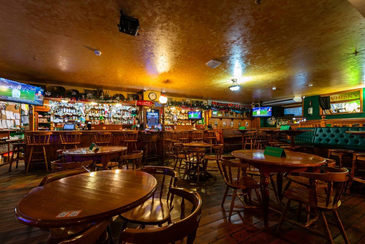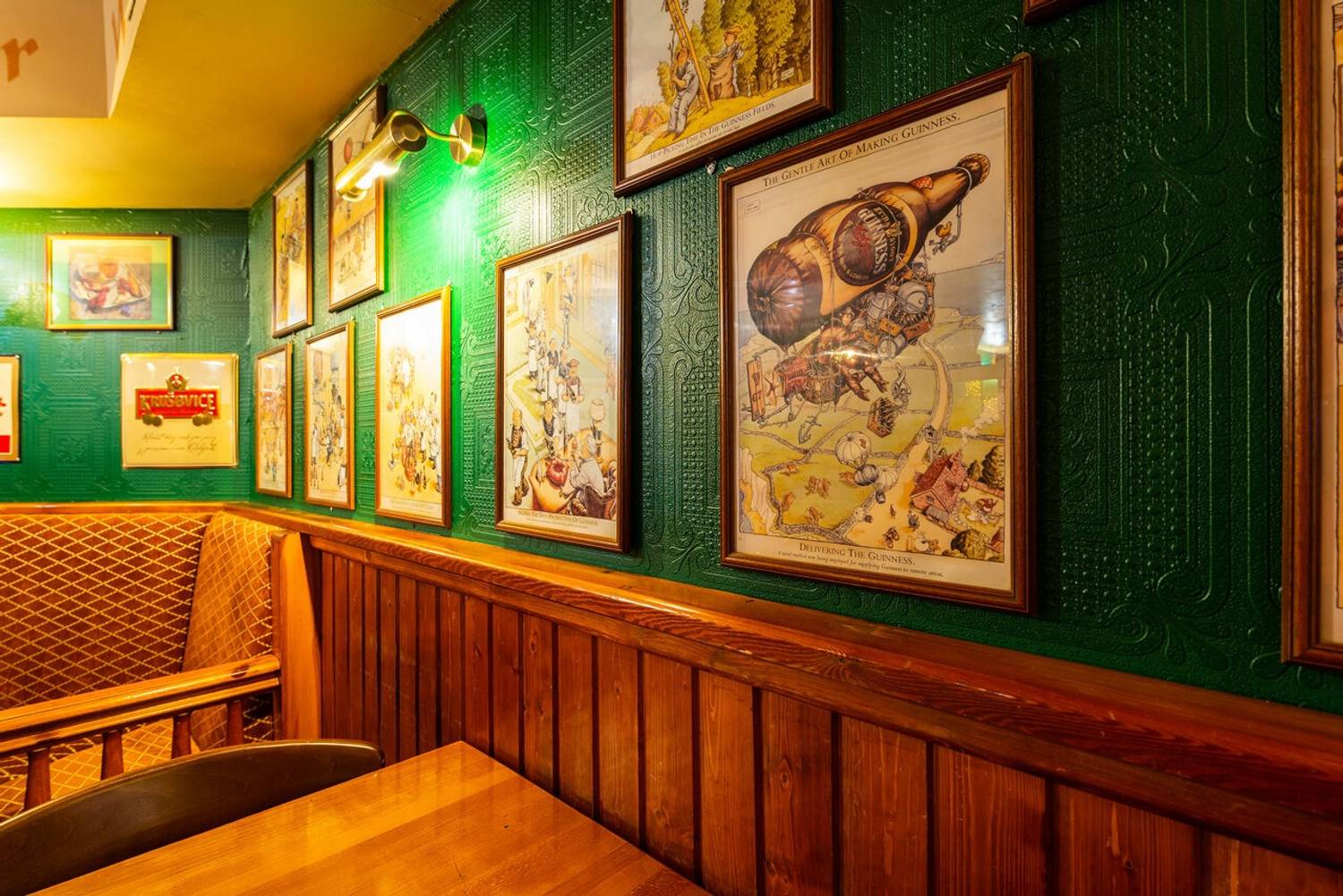 Атмосфера. Здесь оформили заведение по традициям ирландского паба: на стенах развешаны футбольные шарфы, постеры, ирландский флаг и декоративные крышки от пивных бочонков с названиями сортов пива. Здесь за кружкой разливного пива собираются спортивные фанаты, чтобы вместе смотреть трансляции матчей.