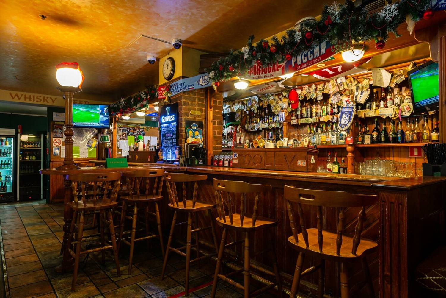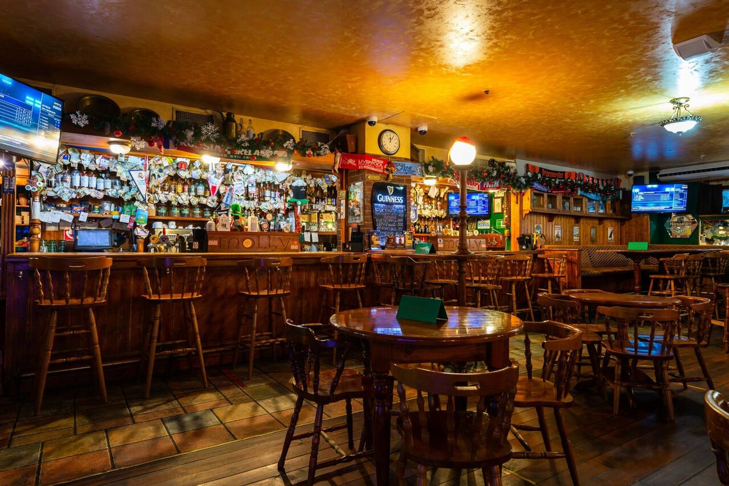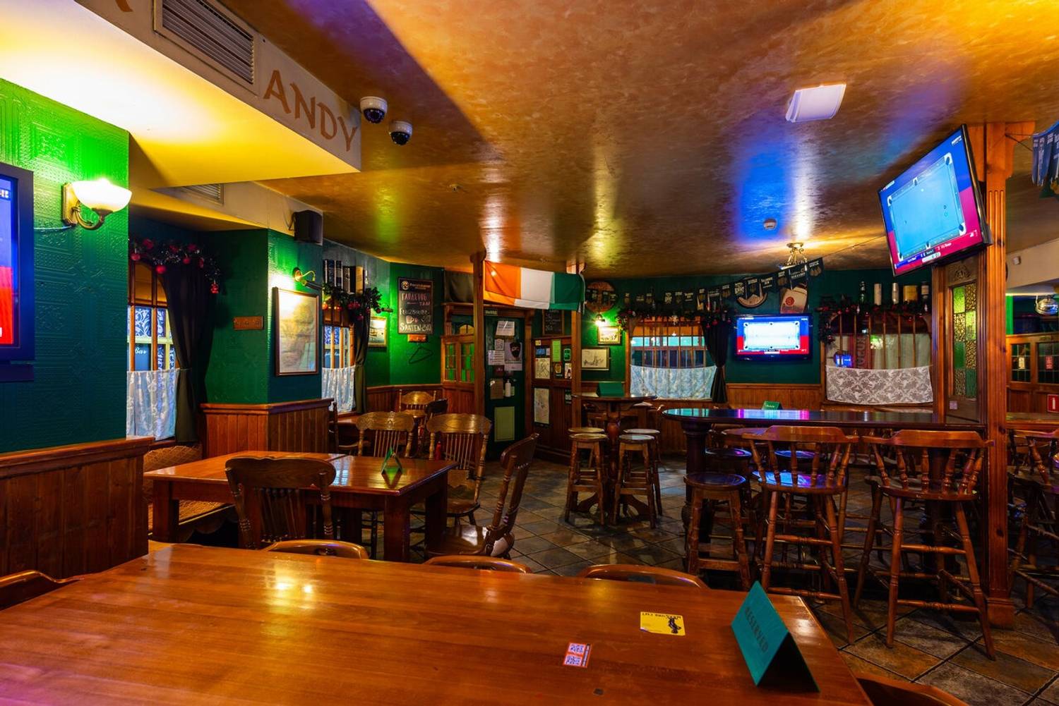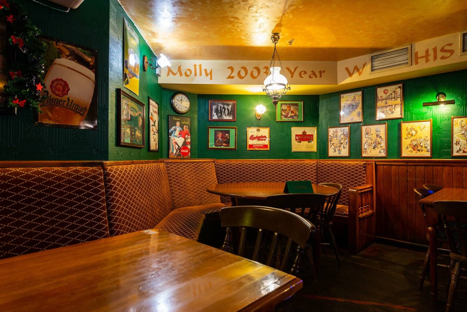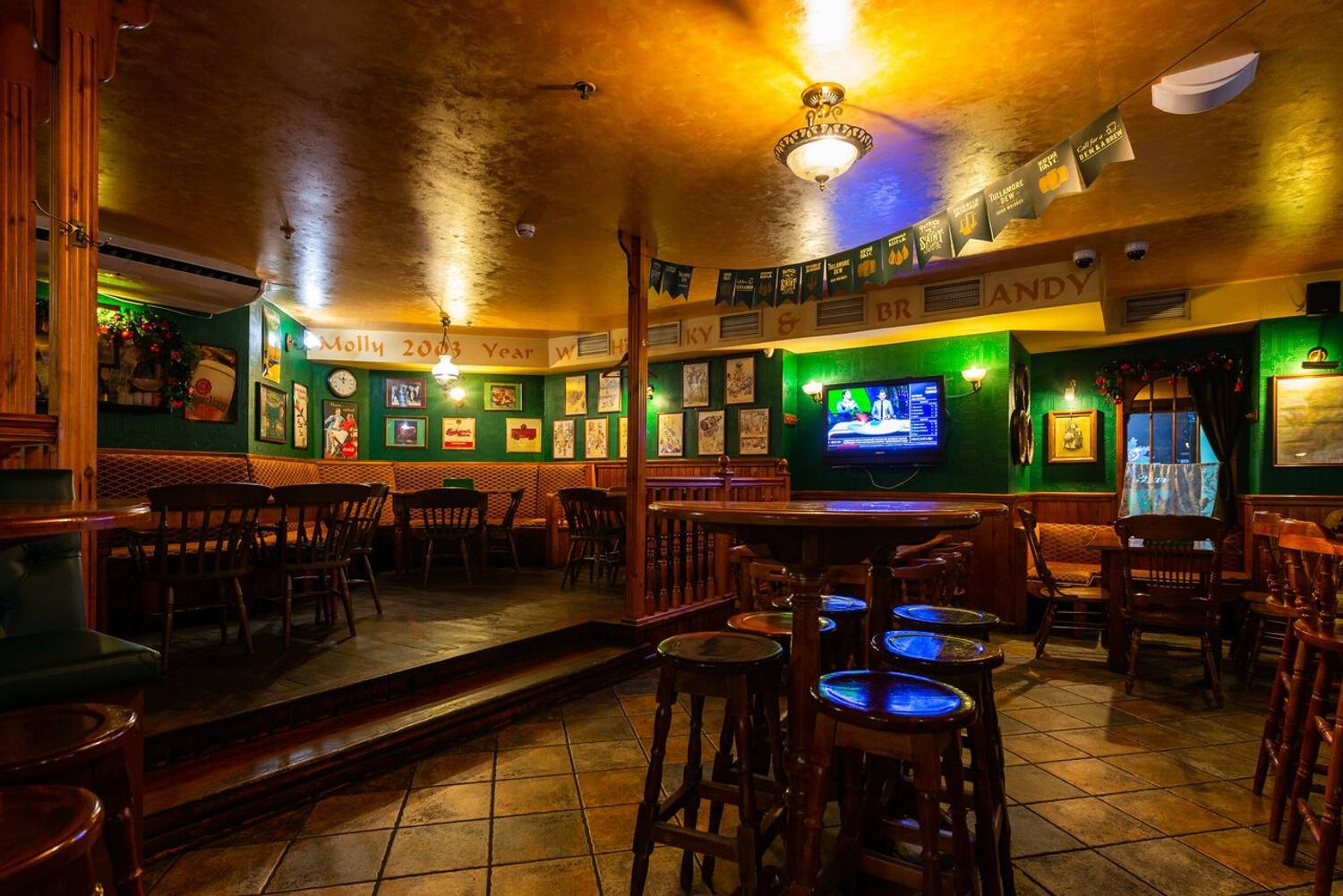 Атмосфера. Здесь оформили заведение по традициям ирландского паба: на стенах развешаны футбольные шарфы, постеры, ирландский флаг и декоративные крышки от пивных бочонков с названиями сортов пива. Здесь за кружкой разливного пива собираются спортивные фанаты, чтобы вместе смотреть трансляции матчей.