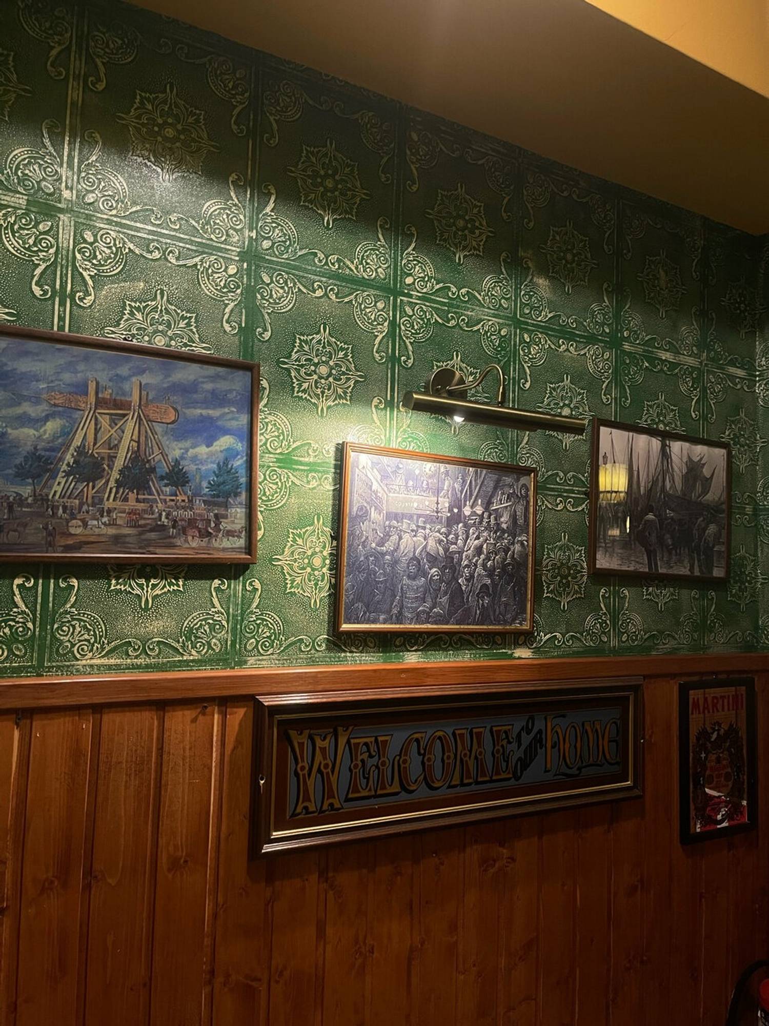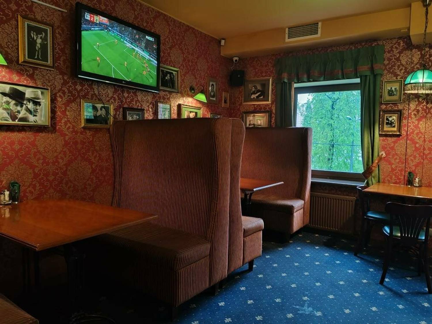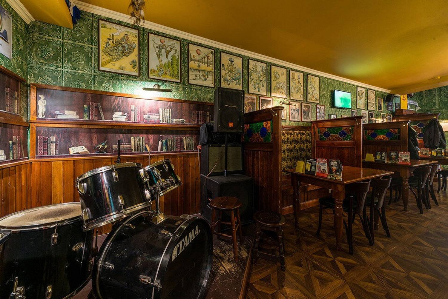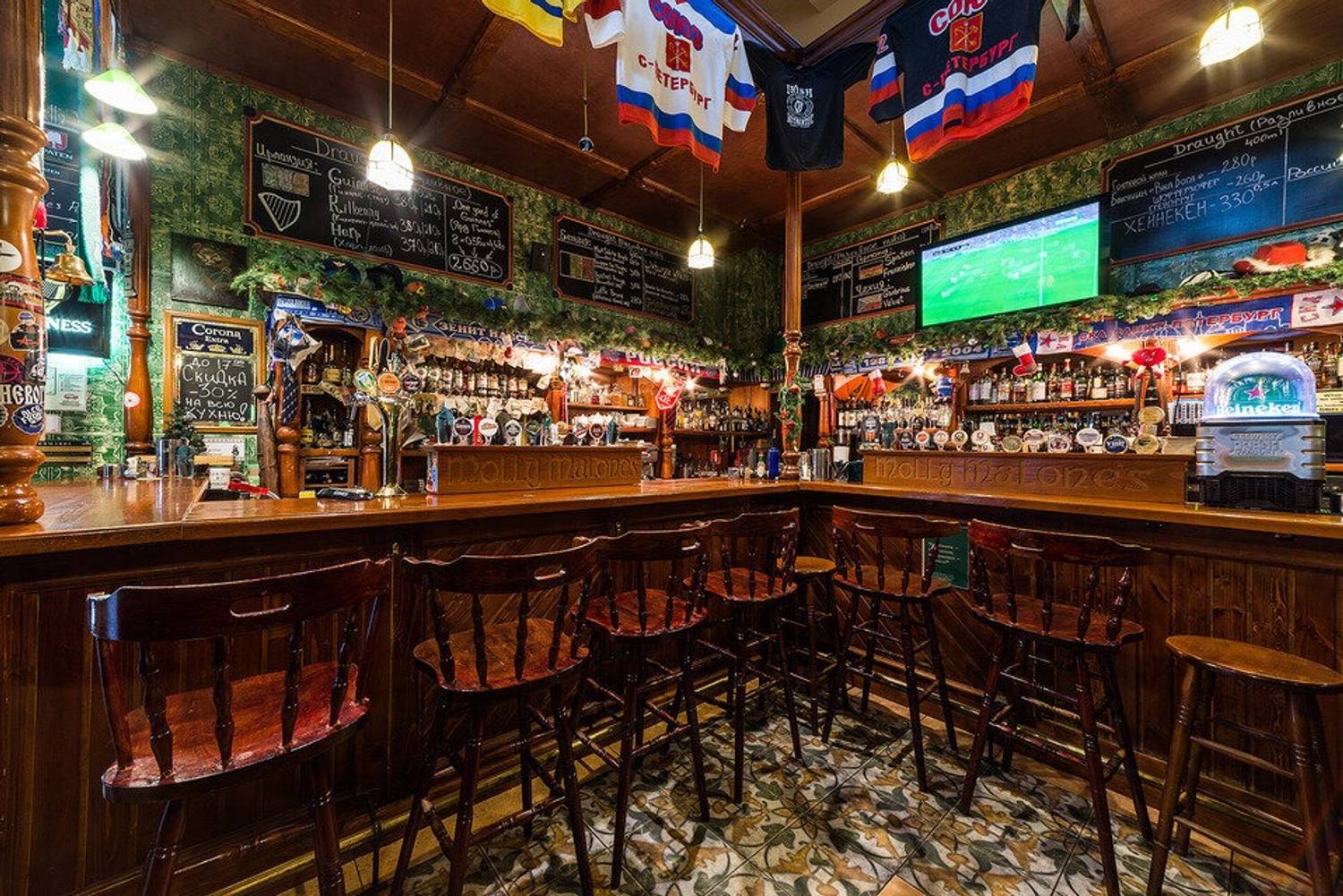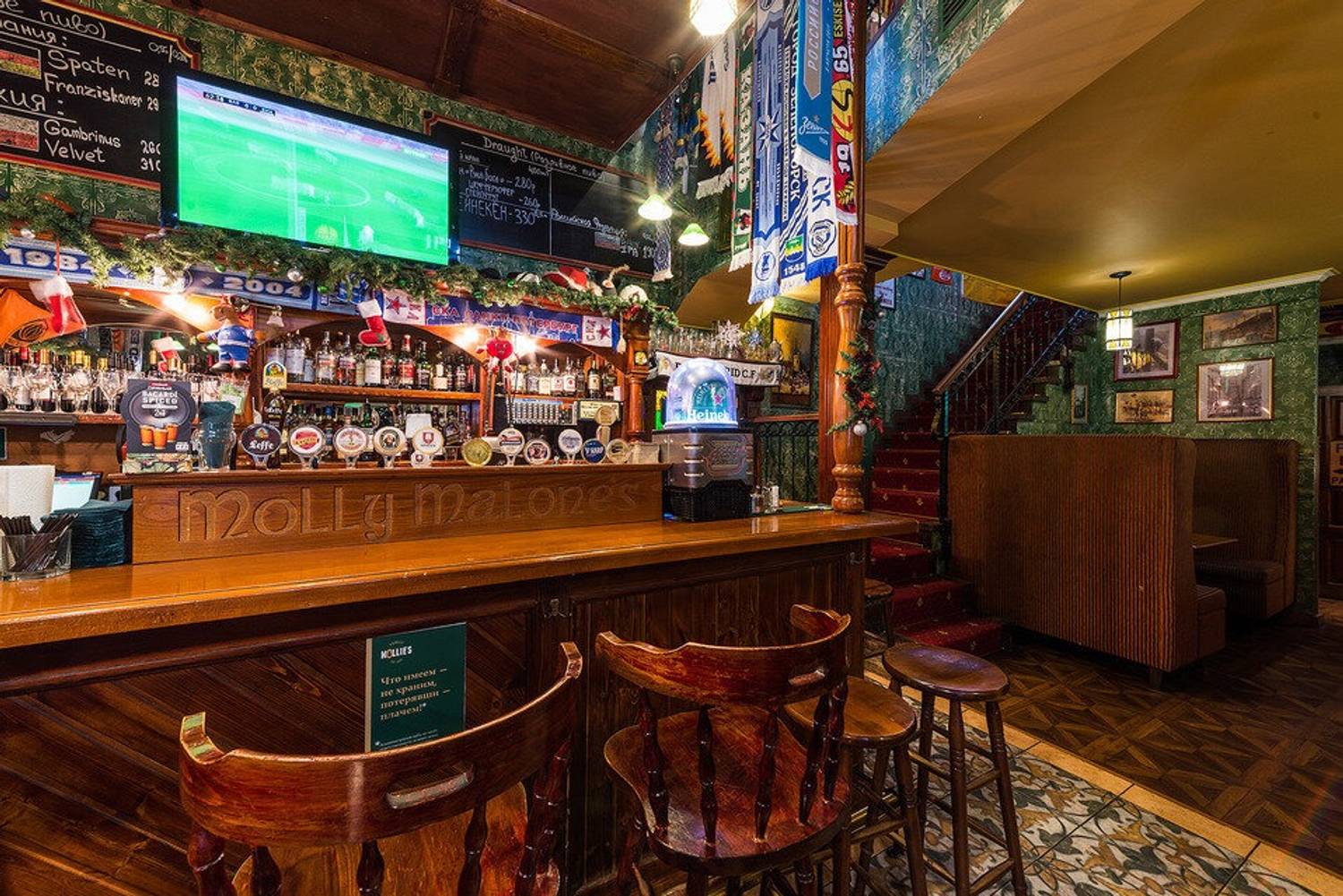 Атмосфера. Здесь можно почувствовать себя словно в сердце Дублина: изумрудные стены, деревянные перегородки и мебель, барабаны. Футболки спортивных фанатов висят тут не просто так — здесь можно следить за трансляциями матчей на большом экране.