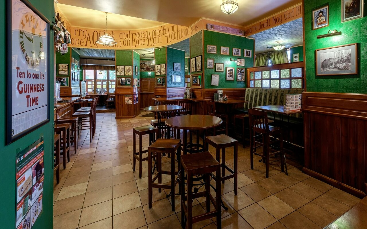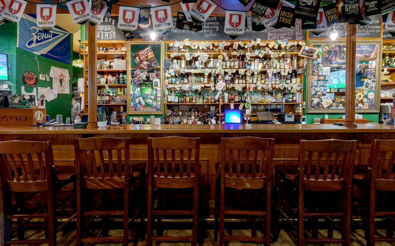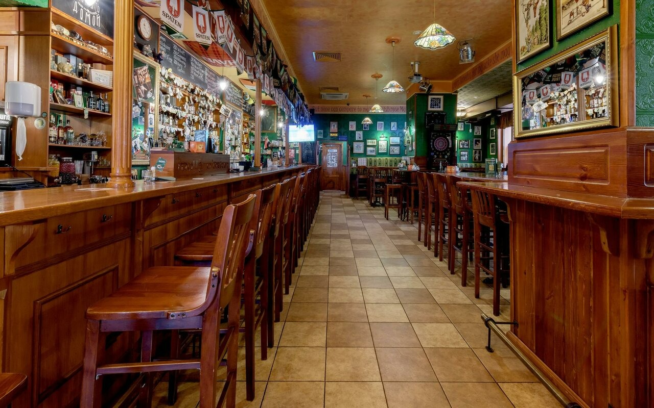 Атмосфера. Интерьер в классическом ирландском стиле: красно-зеленая цветовая гамма, с деревянными панелями, длинной барной стойкой и столами из полированного дуба. Дополняют пространство фотографии на стенах, деревянные перегородки, похожие на двери со стеклянными окошками.