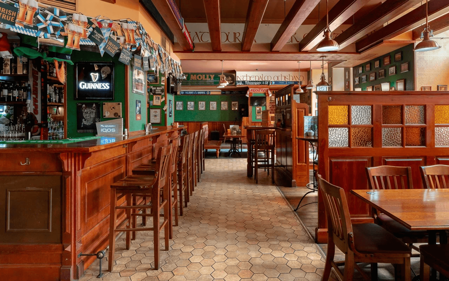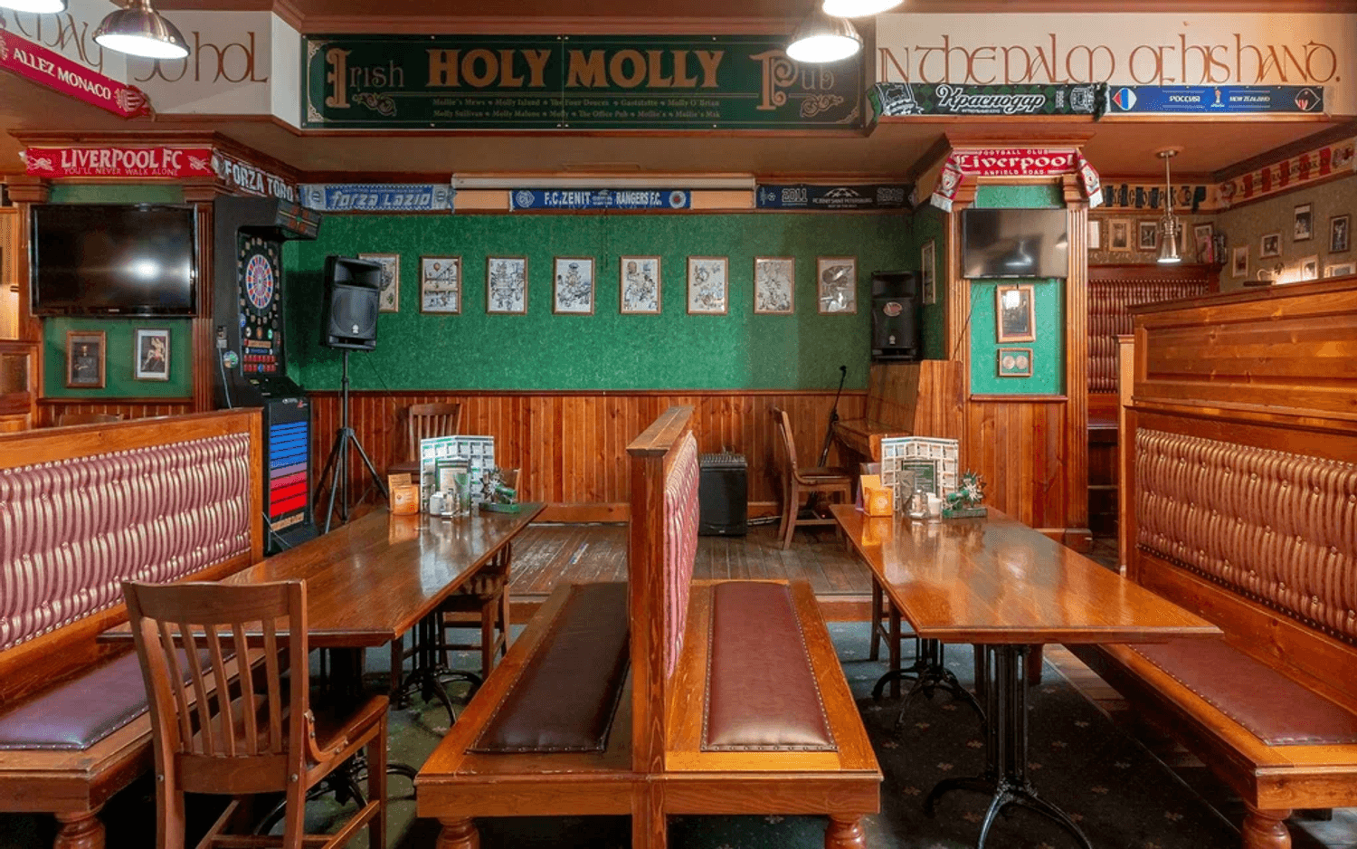 «Holy Molly» по адресу просп. Славы, 40, к. 1 — это аутентичный ирландский паб в шаговой доступности от метро, воссоздающий атмосферу настоящего Дублина с футбольными трансляциями и живой музыкой.