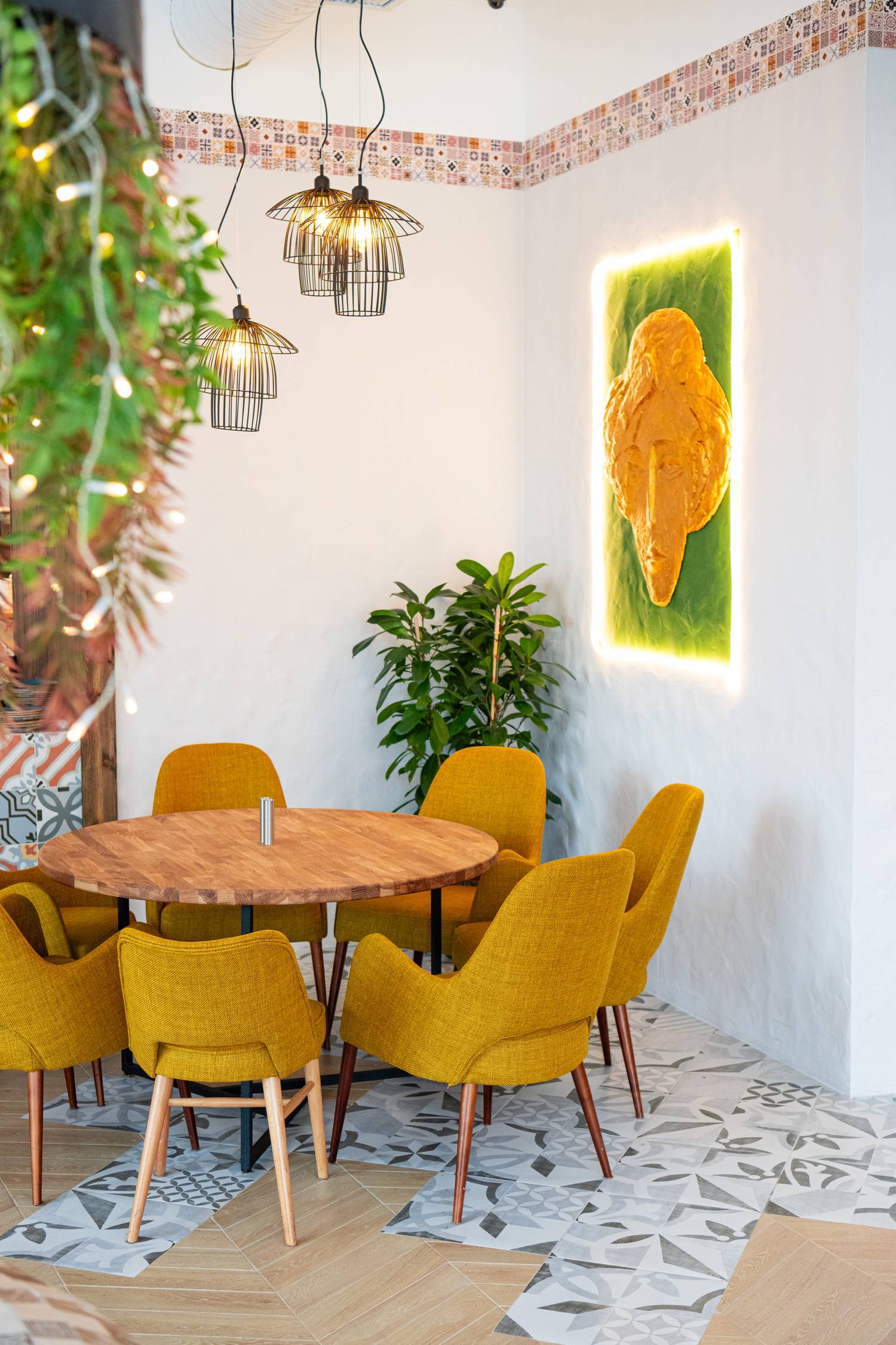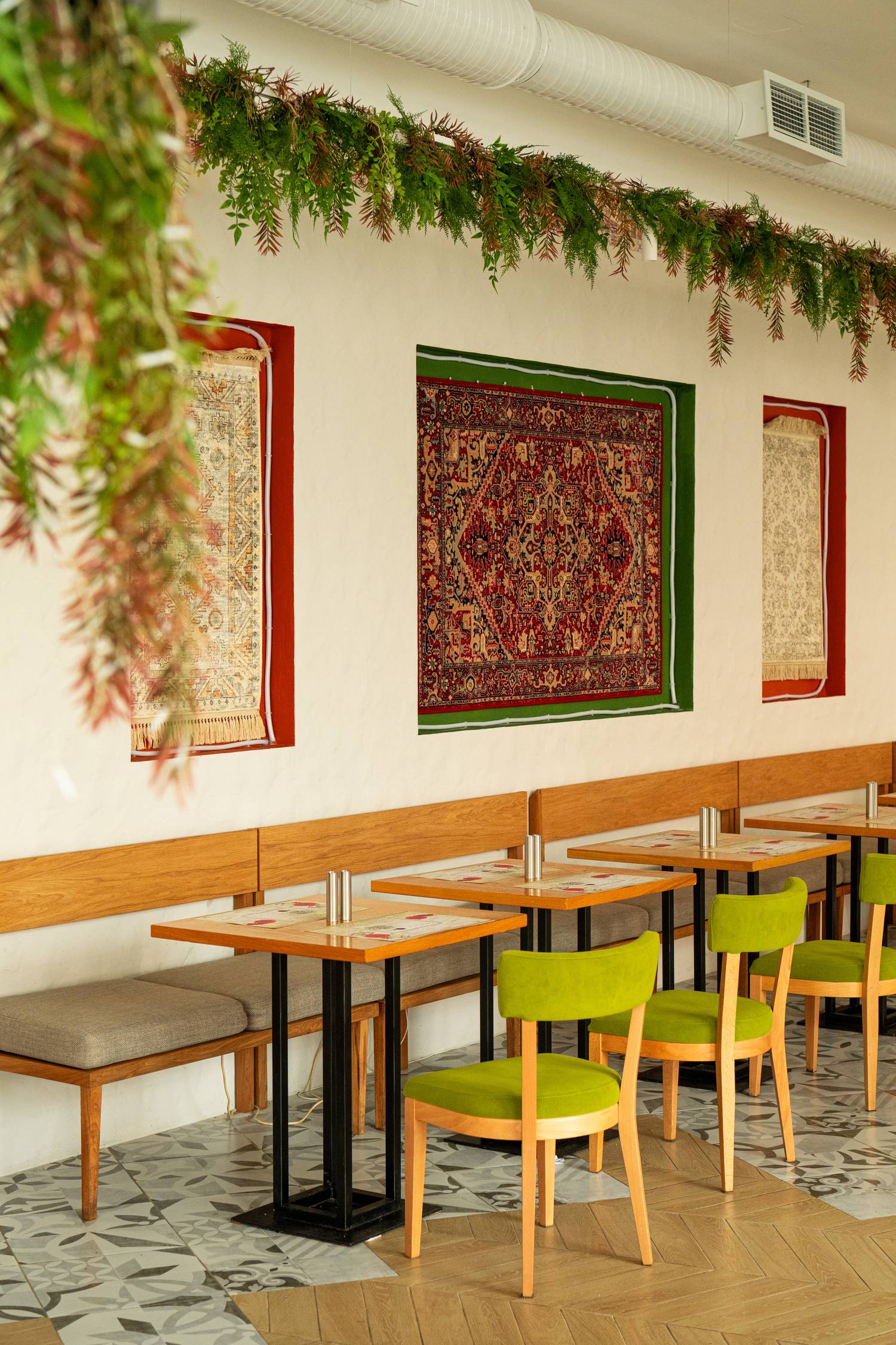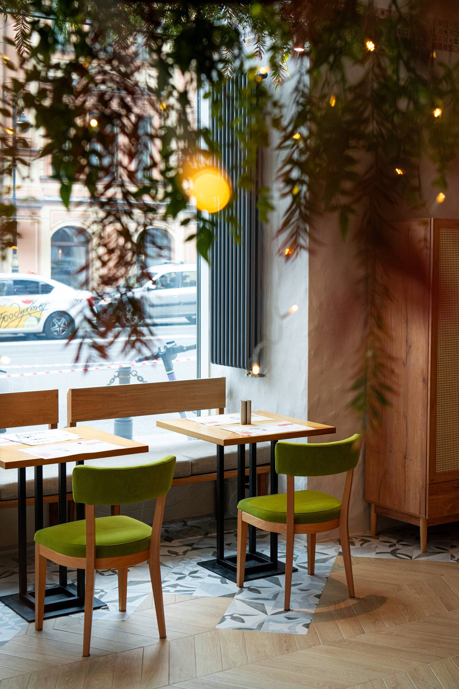 Атмосфера. Здесь хочется задержаться. За большими окнами шумит перекресток Невского и Литейного, а внутри вас встречает мягкий свет, дубовый паркет, пышная зелень и золотые барельефы на стенах. В центре зала работает традиционная печь, из которой тянется аромат свежей лепешки, создавая ощущение, что вы в гостях у тбилисской семьи.