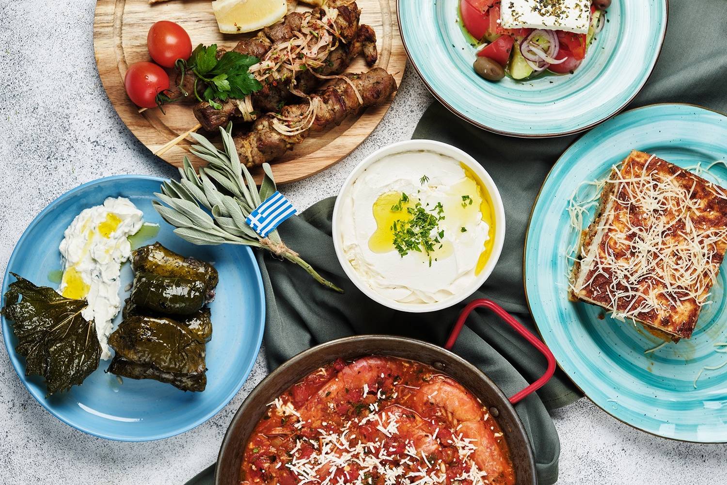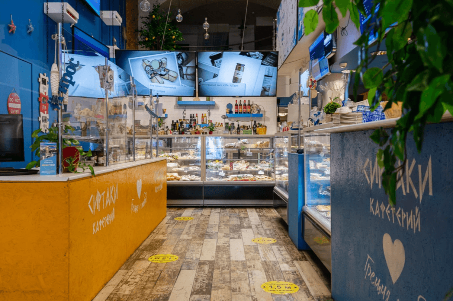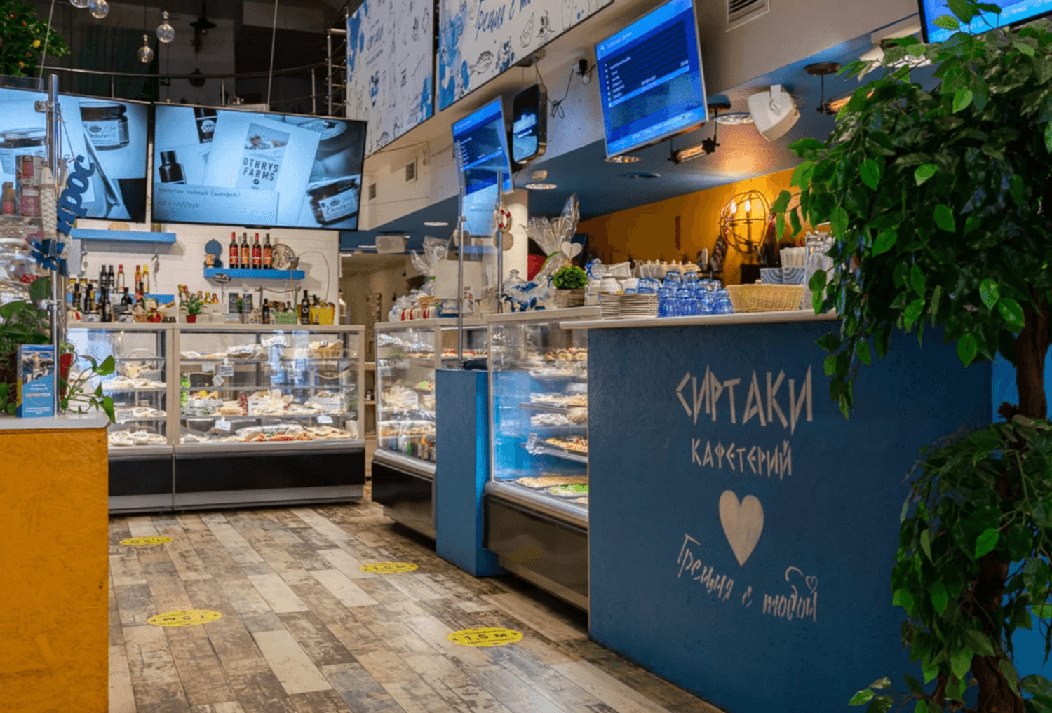 Еда и напитки. В меню — лучшие блюда греческой кухни: мезе из жареных креветок, мидий, куриных палочек, пита с фета и орегано. Из горячих блюд есть бифтеки арни, котопуло, куриная грудка по-критски с зимним соусом, судзукакья. Есть и греческие сладости: баклавас и портокалопита.