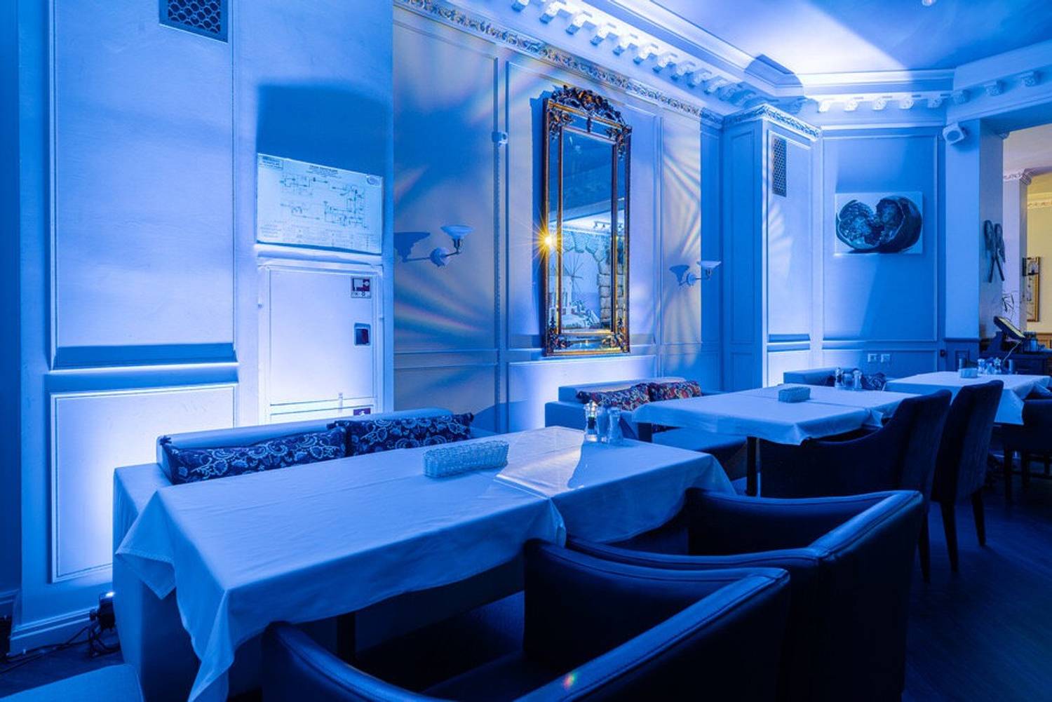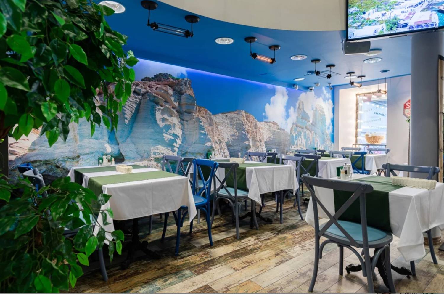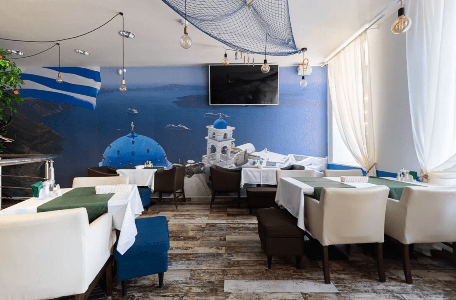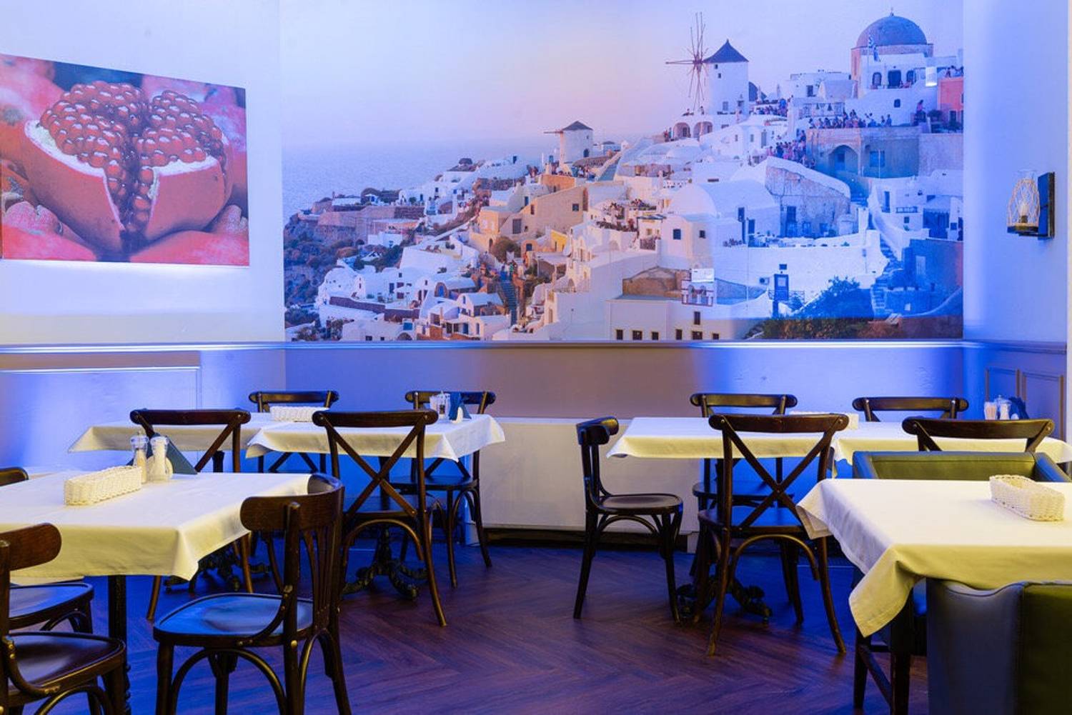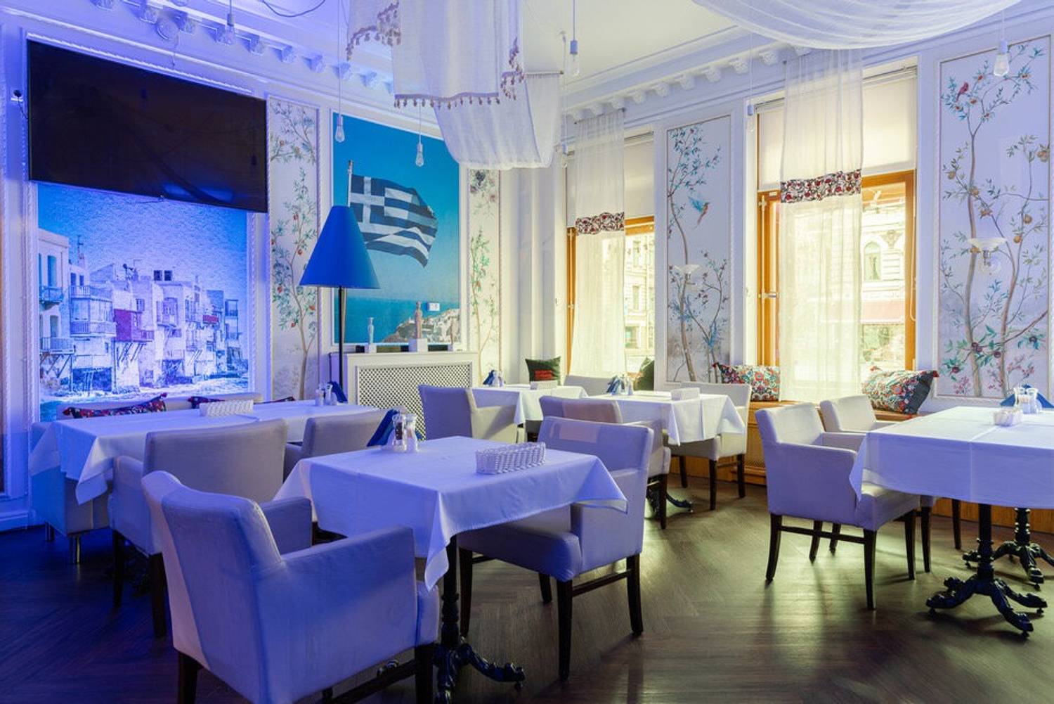 Атмосфера. На стенах рисунки Греции и тарелки с национальными узорами, синяя подсветка и голубые акценты — все это напоминает о тематике Греции. В одном из залов даже растет мандариновое дерево. Летом можно полюбоваться Невским проспектом с летней верандой с навесом даже во время дождя.
