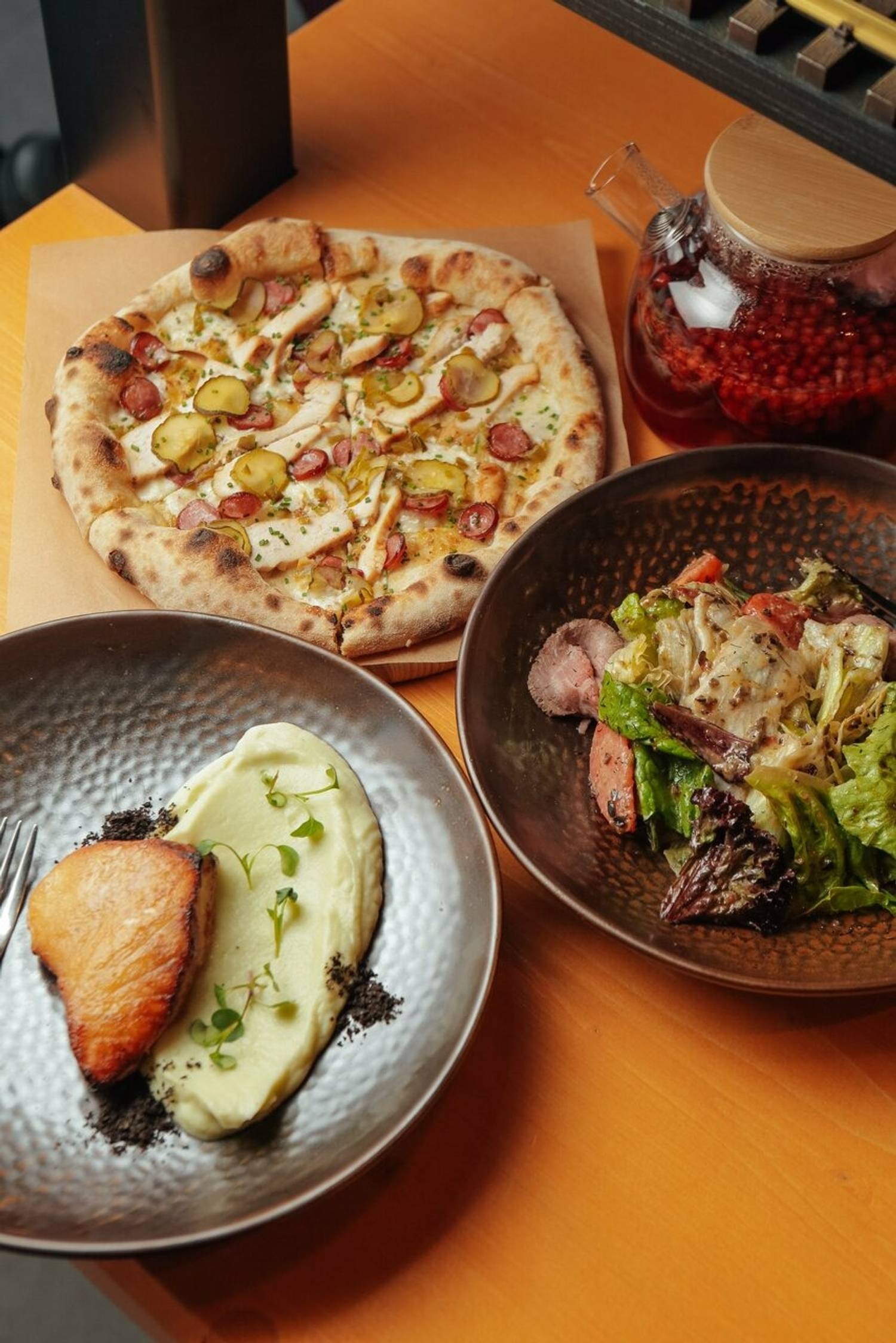 Еда и напитки. В меню — европейские блюда: креветки в сливочно-чесночном соусе, свиные ребра в соусе BBQ, клюквенный бургер Блю Чиз, пицца ростбиф-грибы, вок с курицей. Для детей готовят сосиски-осьминожки, пельмешки с бульоном, сырники с вареньем. На десерт предлагают красный бархат и малиновый чизкейк.