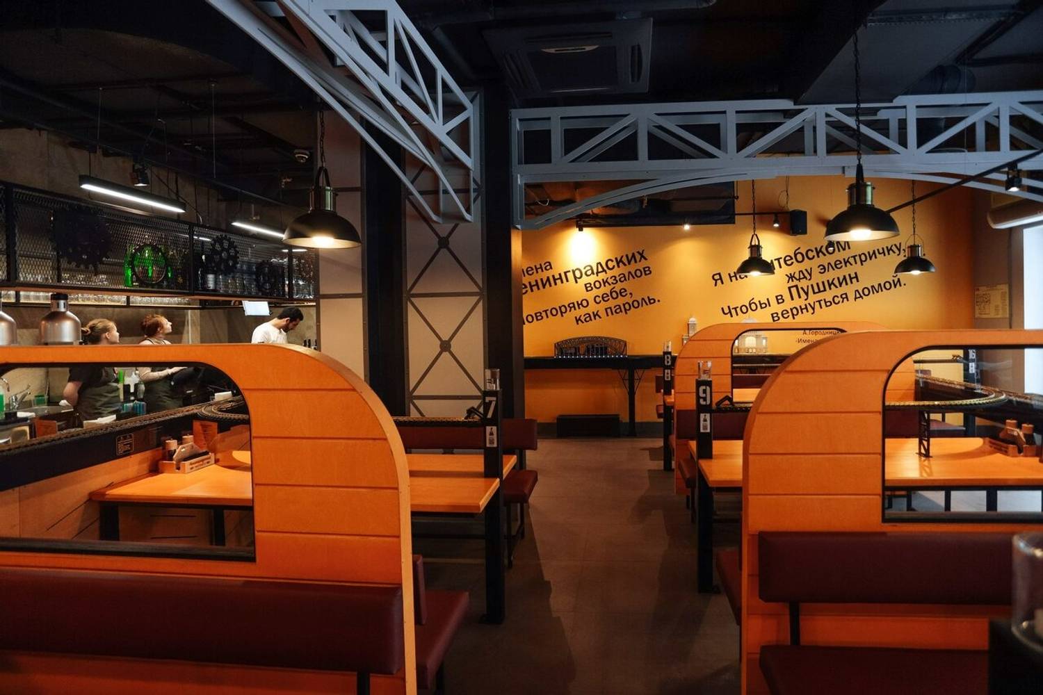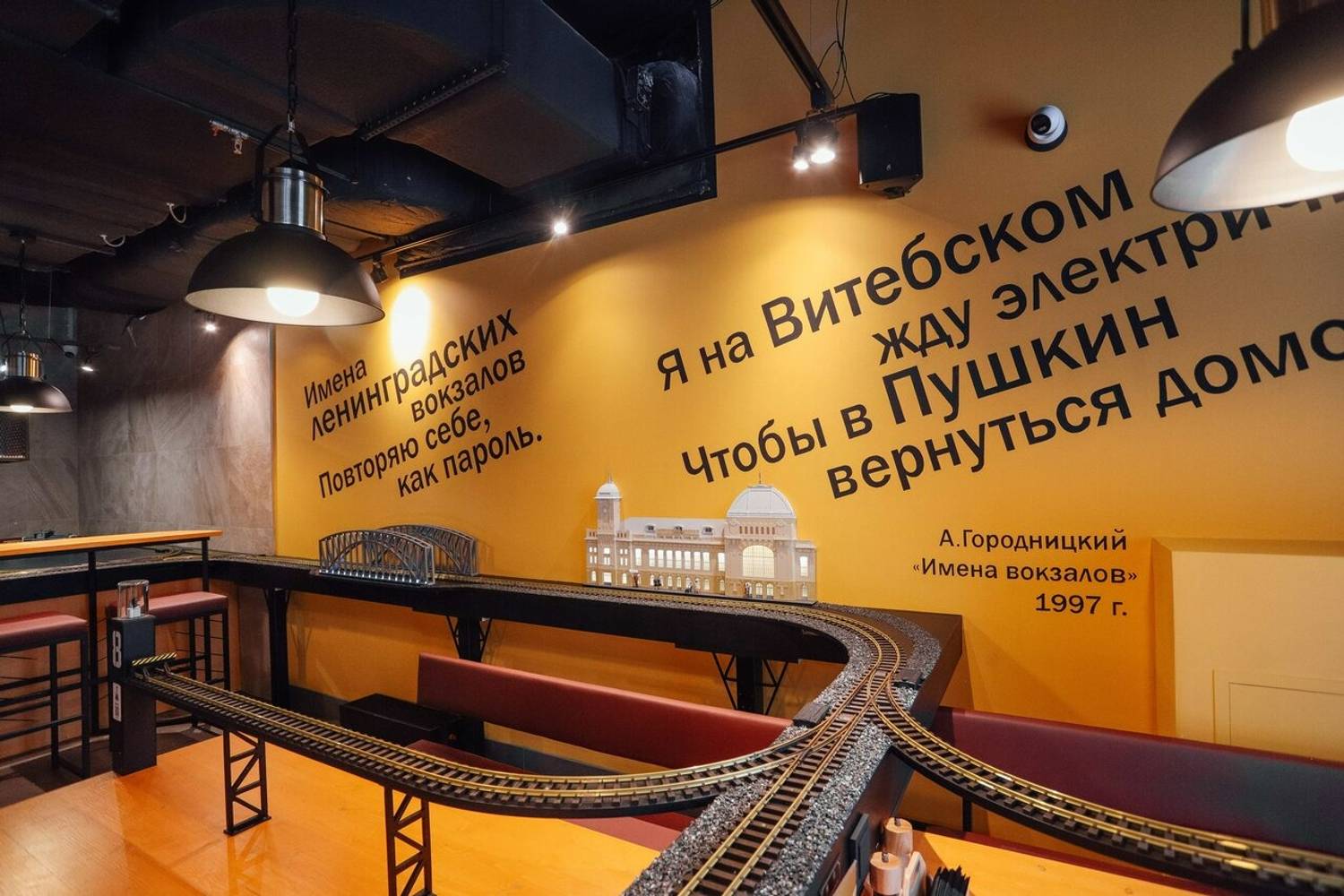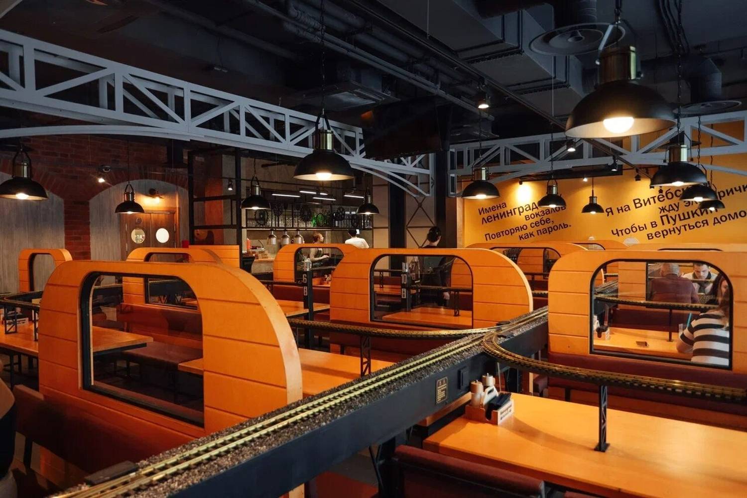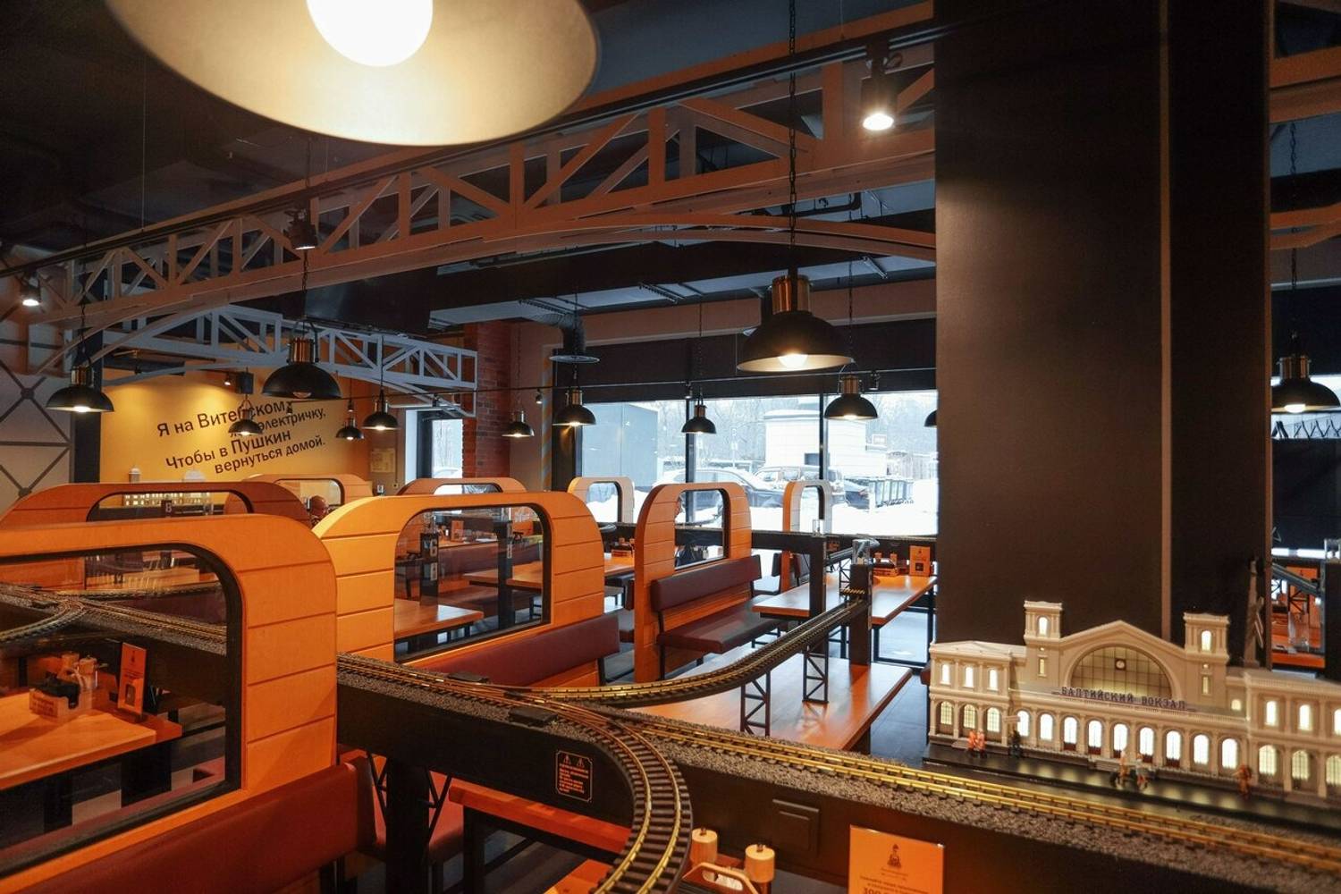 Атмосфера. Кафе стилизовано под железнодорожную станцию: миниатюрные рельсы проходят через весь зал, оранжевые цвета, стилизованные вагоны с надписью «Ленинградский экспресс». Поезда проезжают мимо мини-версий достопримечательностей Санкт-Петербурга — Балтийского вокзала, Петропавловской крепости и маяка Толбухина.