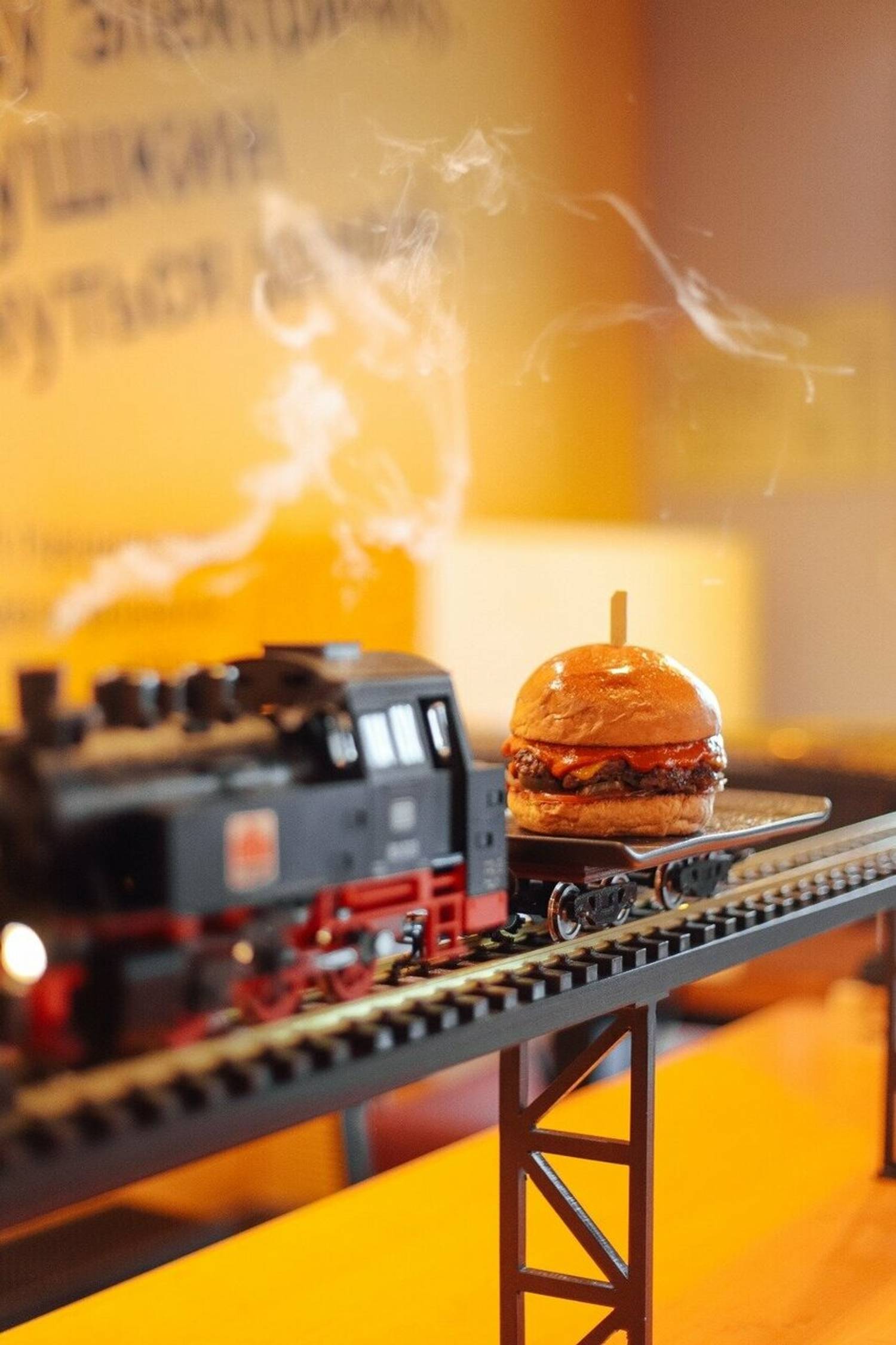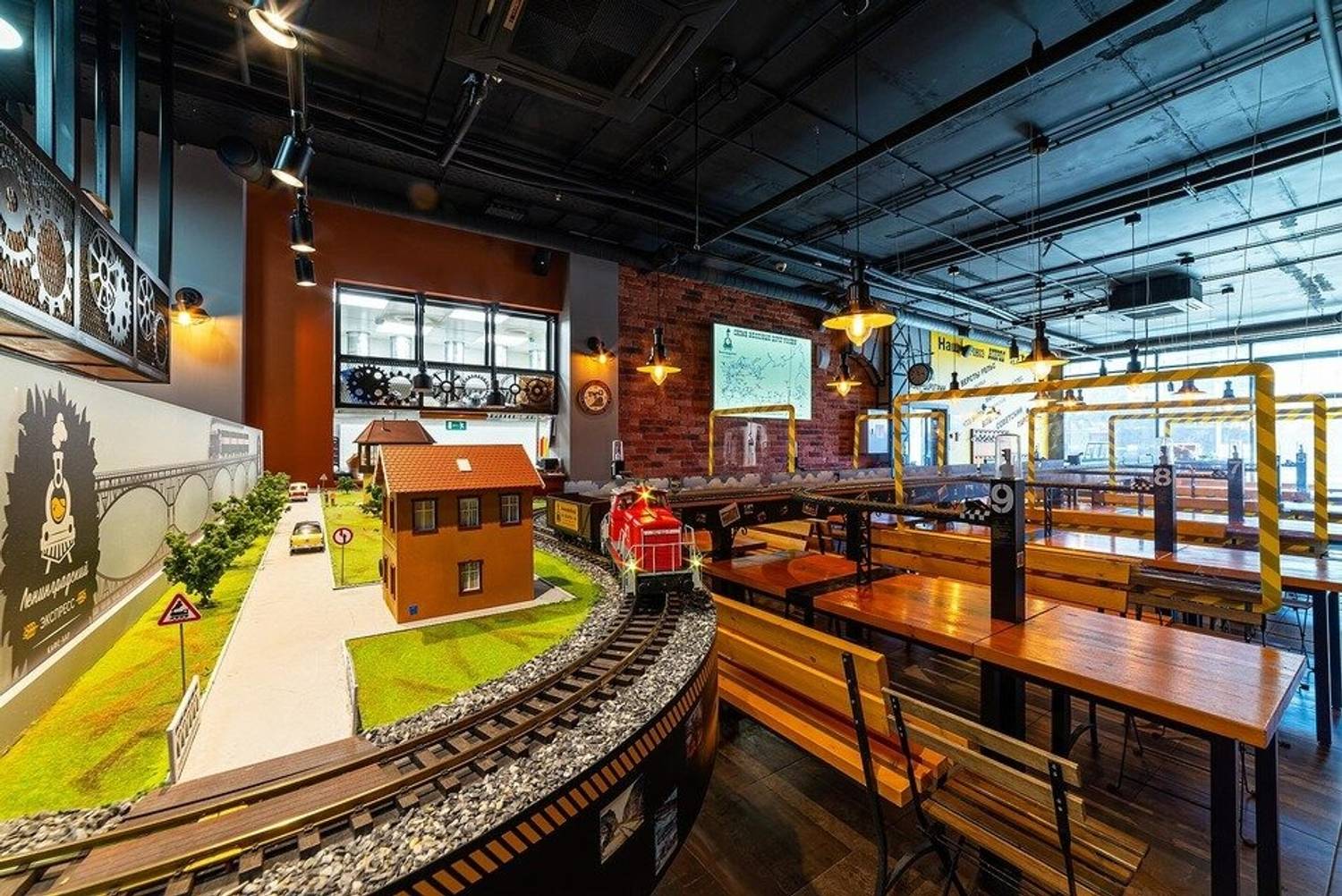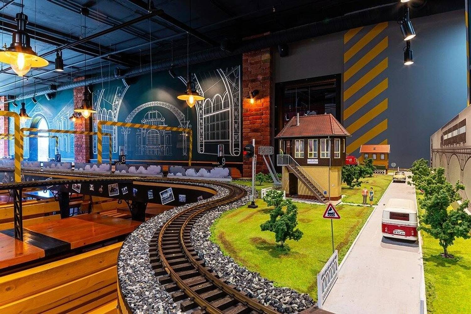 Атмосфера. По всему залу проложены рельсы, по которым курсирует фирменный поезд. Гости могут рассмотреть миниатюрные макеты городских достопримечательностей, например, Московского вокзала. На полках стоят декоративные шестеренки, каждый столик отмечен номером «станции», а на стене висит почтовый ящик в винтажном стиле.
