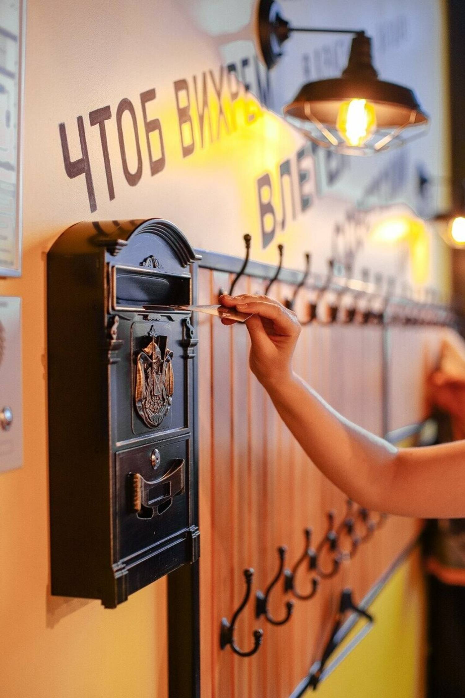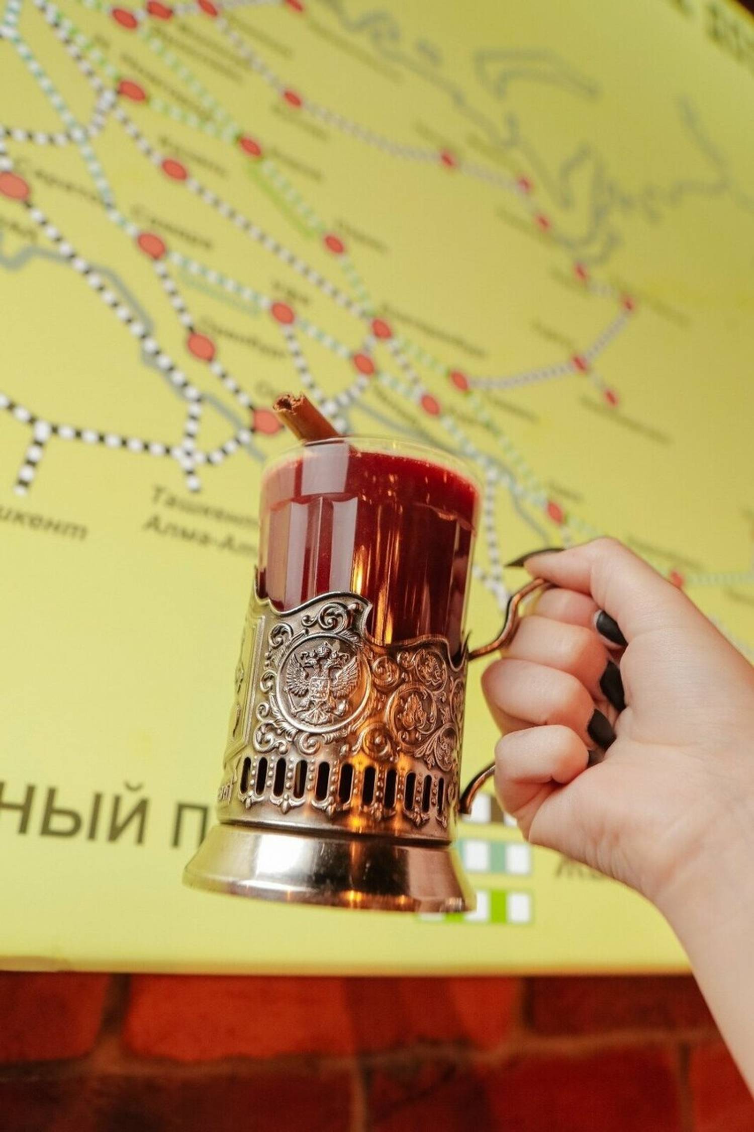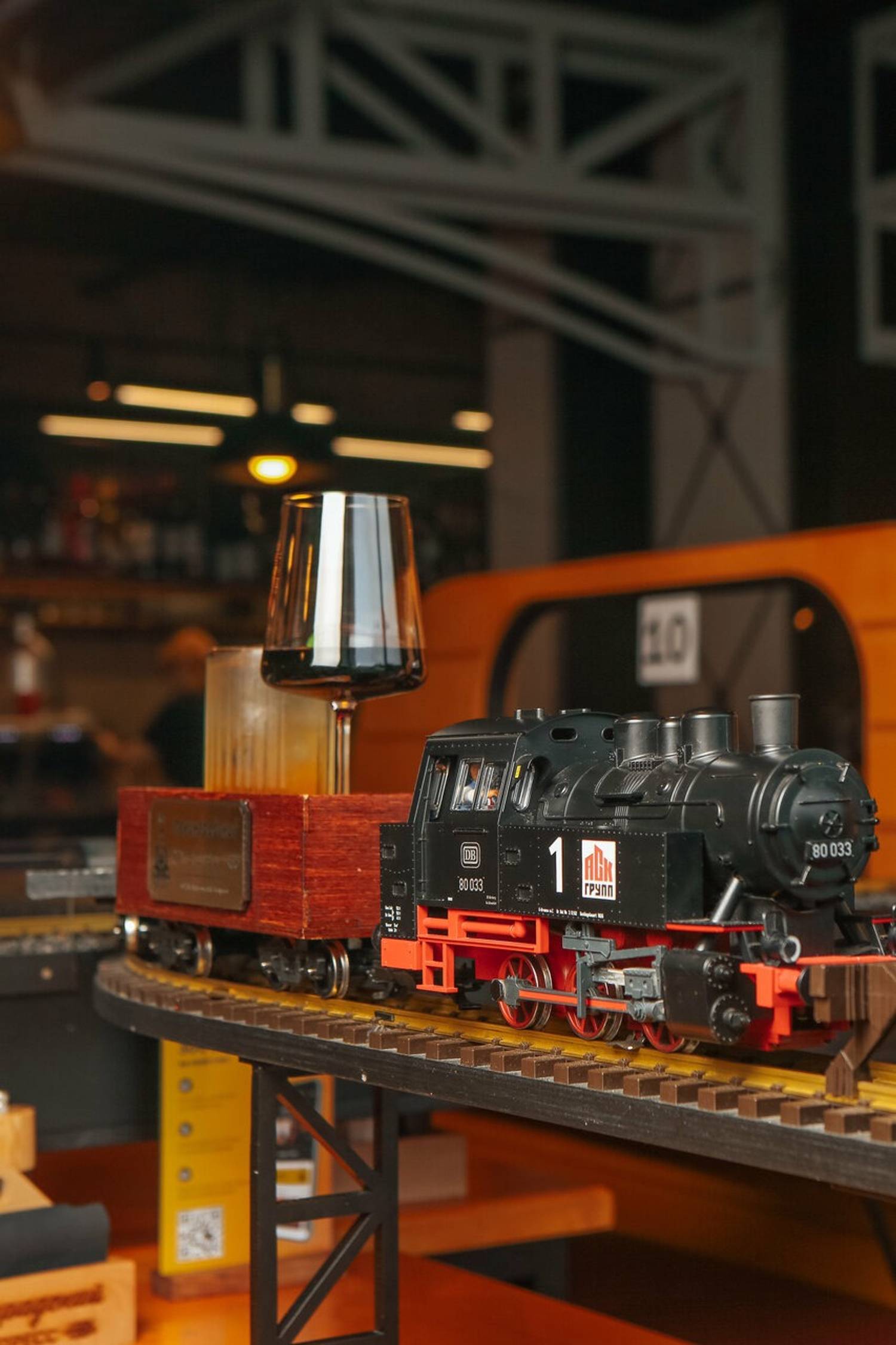 Атмосфера. По всему залу проложены рельсы, по которым курсирует фирменный поезд. Гости могут рассмотреть миниатюрные макеты городских достопримечательностей, например, Московского вокзала. На полках стоят декоративные шестеренки, каждый столик отмечен номером «станции», а на стене висит почтовый ящик в винтажном стиле.