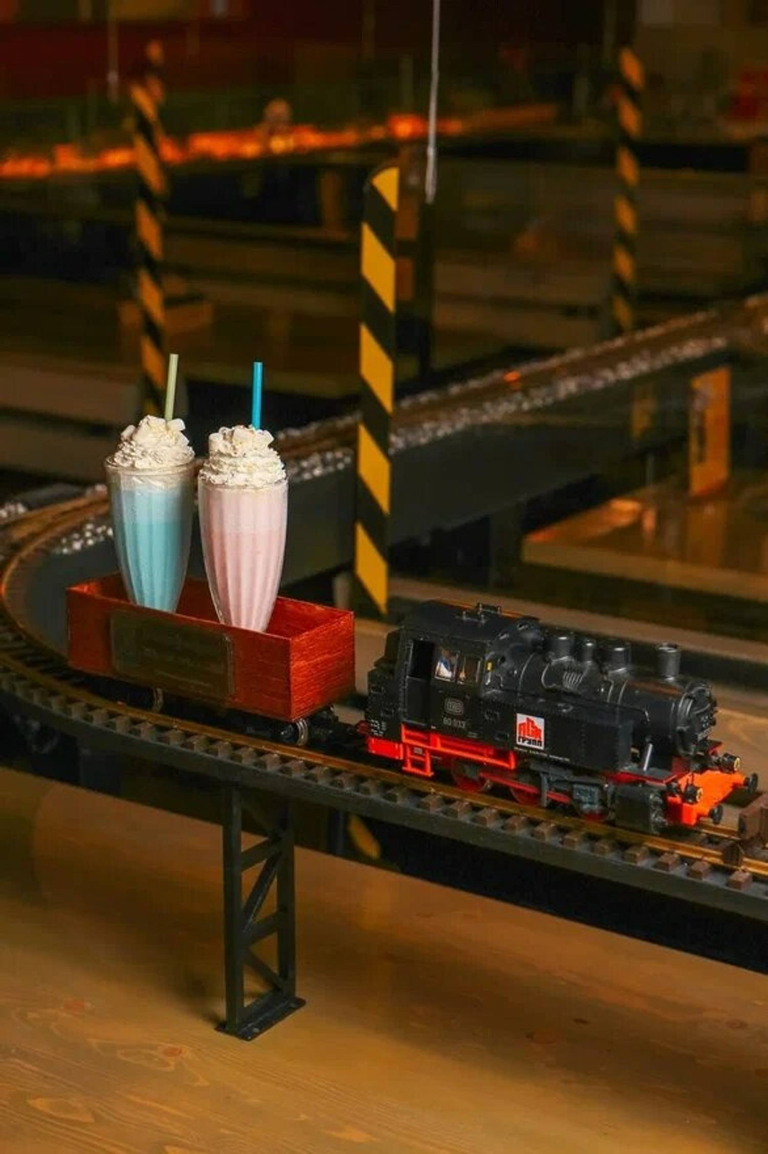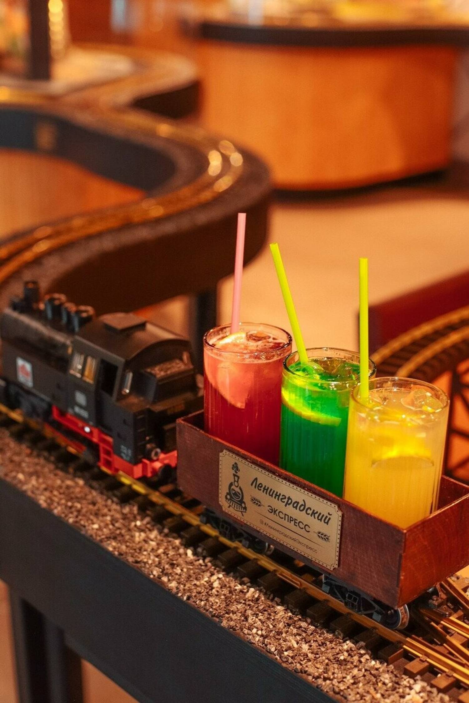 «Ленинградский экспресс» на ул. Салова, 61, стр. 1 — кафе на Бухарестской с железной дорогой и фирменным поездом, который доставляет заказы прямо к столику.