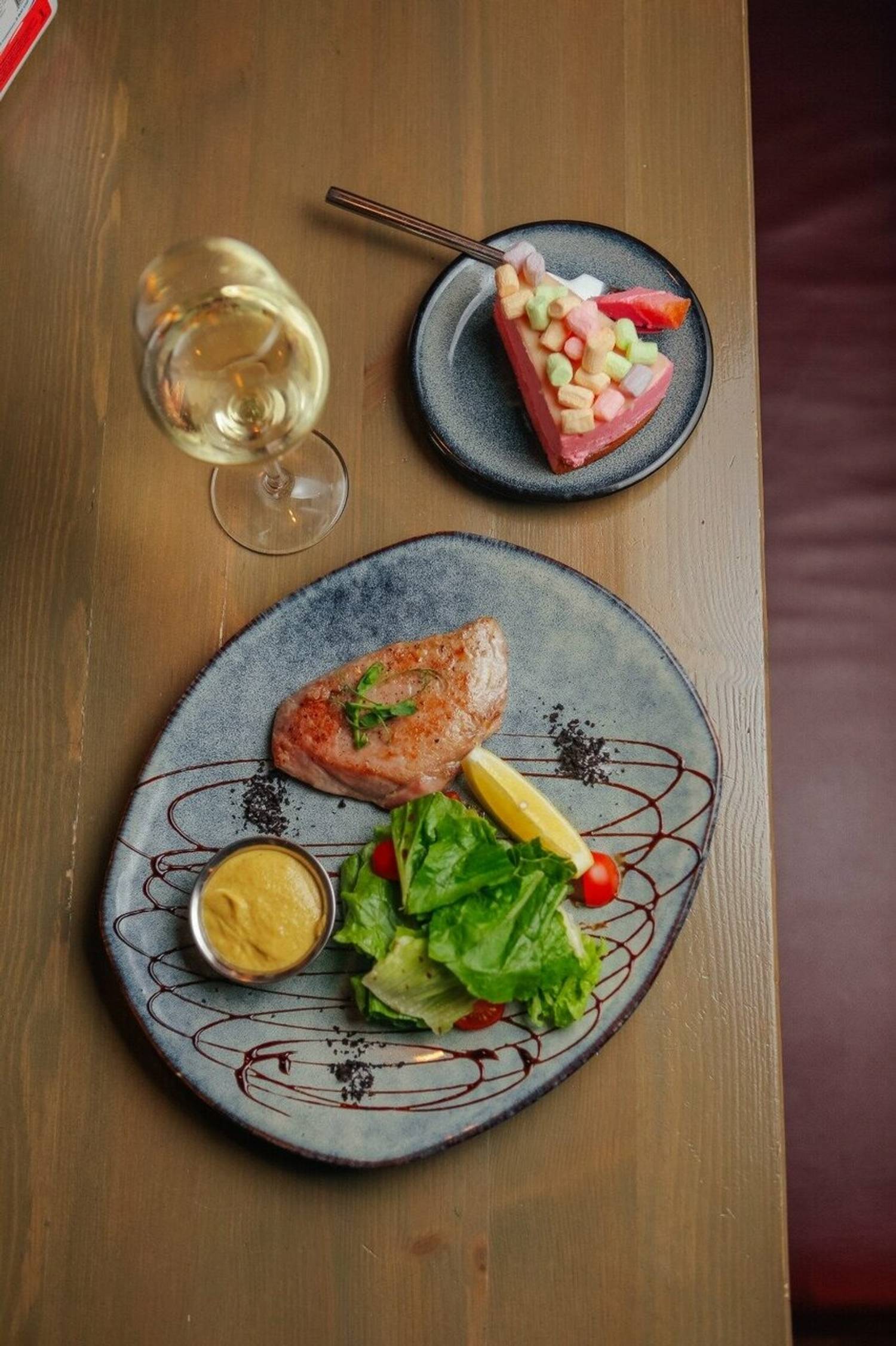 Еда и напитки. В меню — гренки с соусом тар-тар, креветки в соусе дор блю, сырные палочки с клюквенным соусом, бифштекс с картофельной крокетой, ребра в соусе Джек Дэниэлс, бургер с копченым сыром, паста с креветками и цукини. Из сладкого готовят десерт Сникерс и малиновый чизкейк.