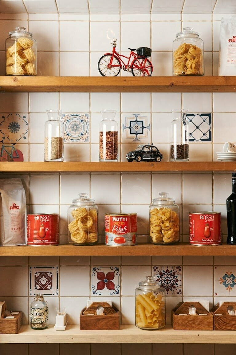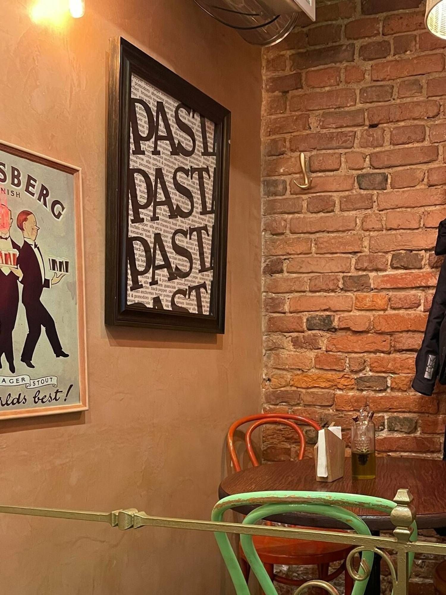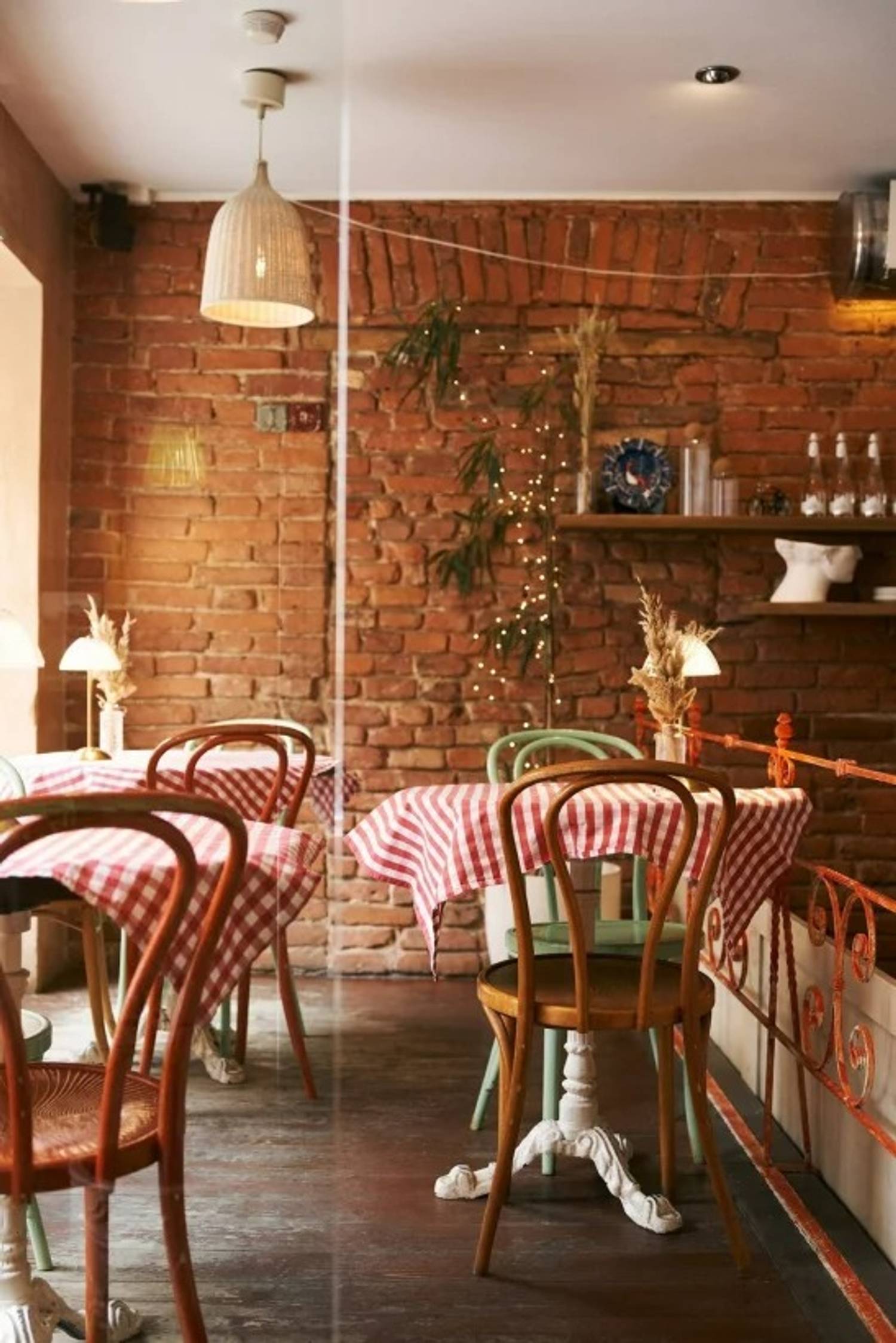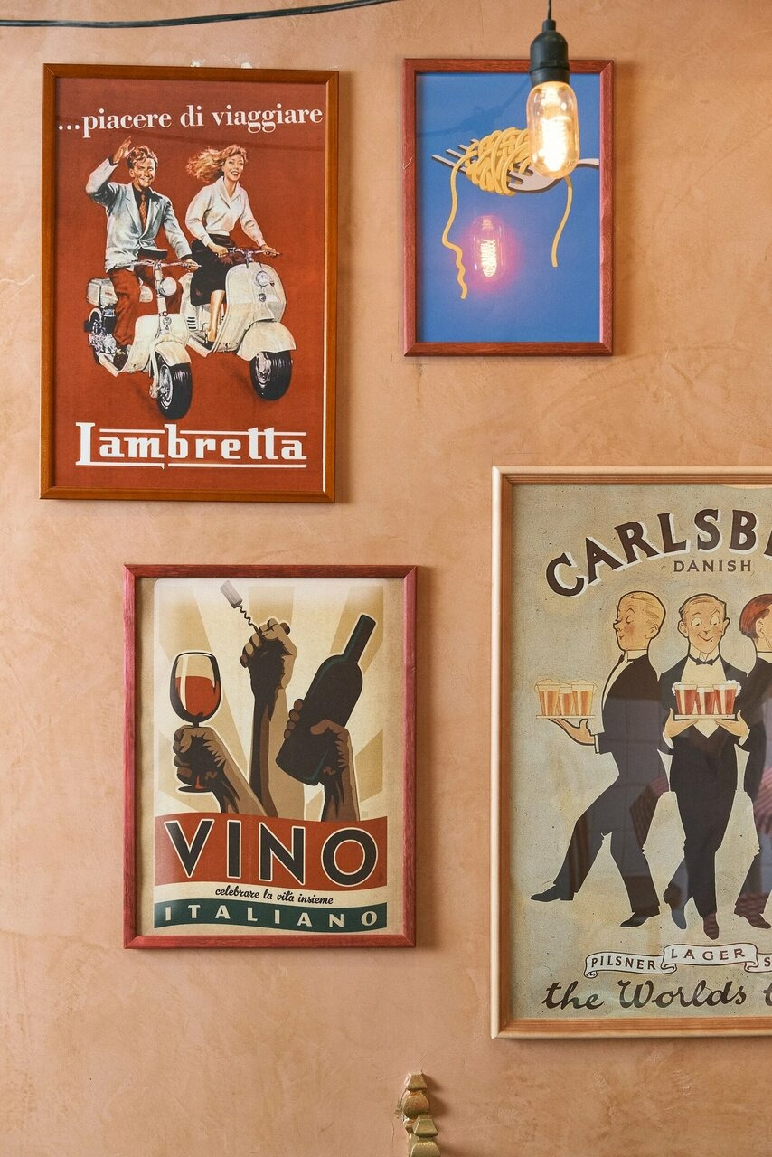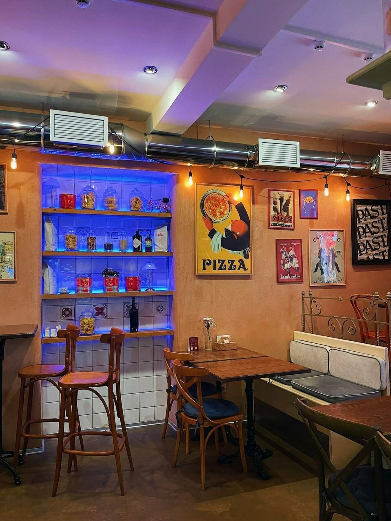 Атмосфера. Гости попадают в итальянскую тратторию: сенские стулья, красно-белые клетчатые скатерти, плетеные абажуры, полки с макаронами в прозрачных колбах и специями и даже мини-велосипед. Картины в деревянных рамах с итальянскими мотивами дополняют интерьер.