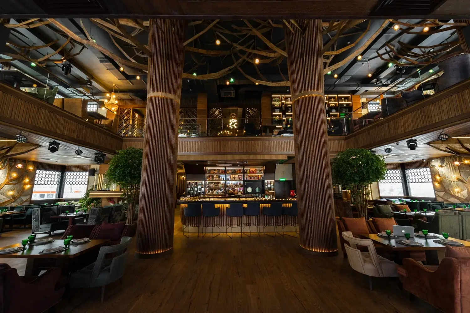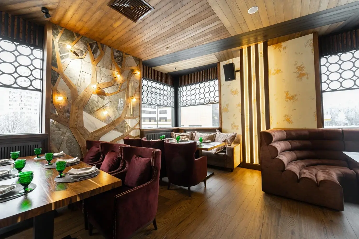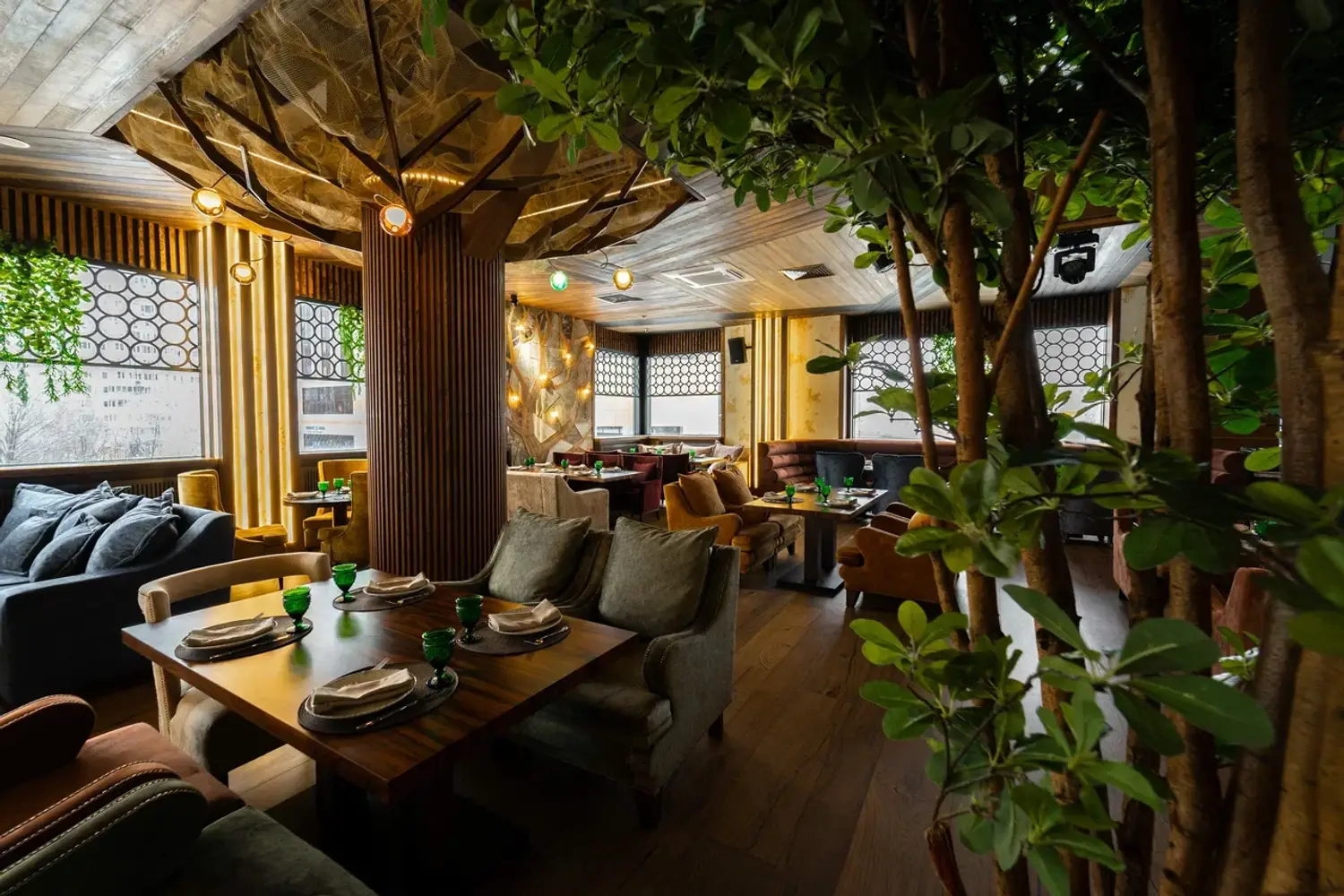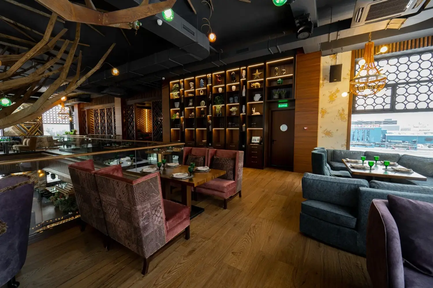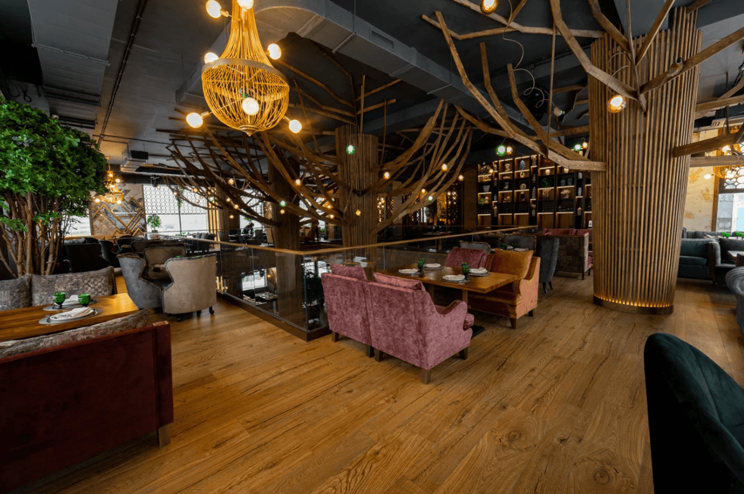 Атмосфера. Интерьер сочетает стиль ар-деко, восточные мотивы и неоклассику: здесь фигурируют яркие кресла и барная стойка с подсветкой, панно с журавлями и инсталляция в виде огромного дерева посреди зала. Высокие потолки и панорамные окна дополнительно создают ощущение торжественности.