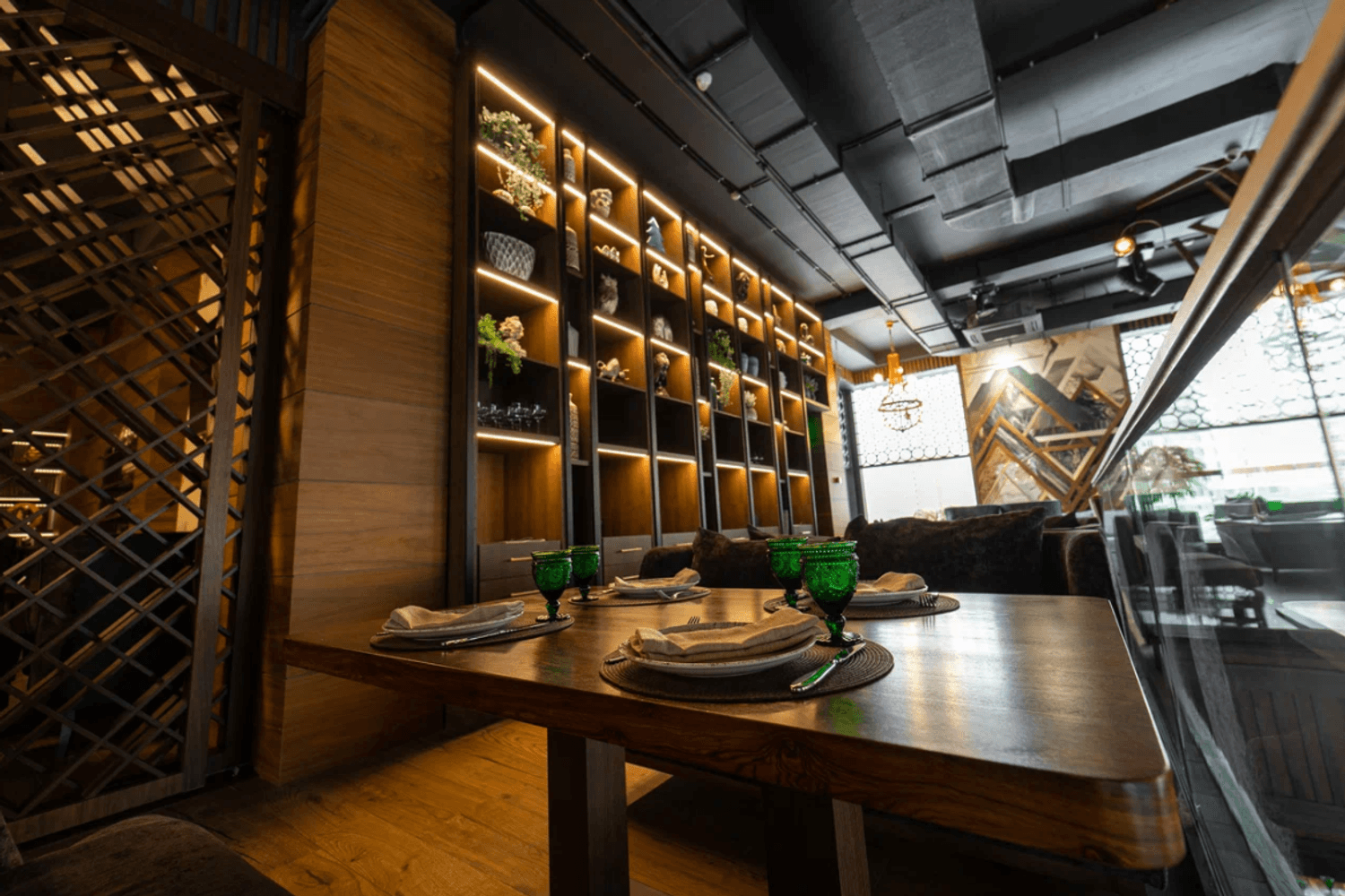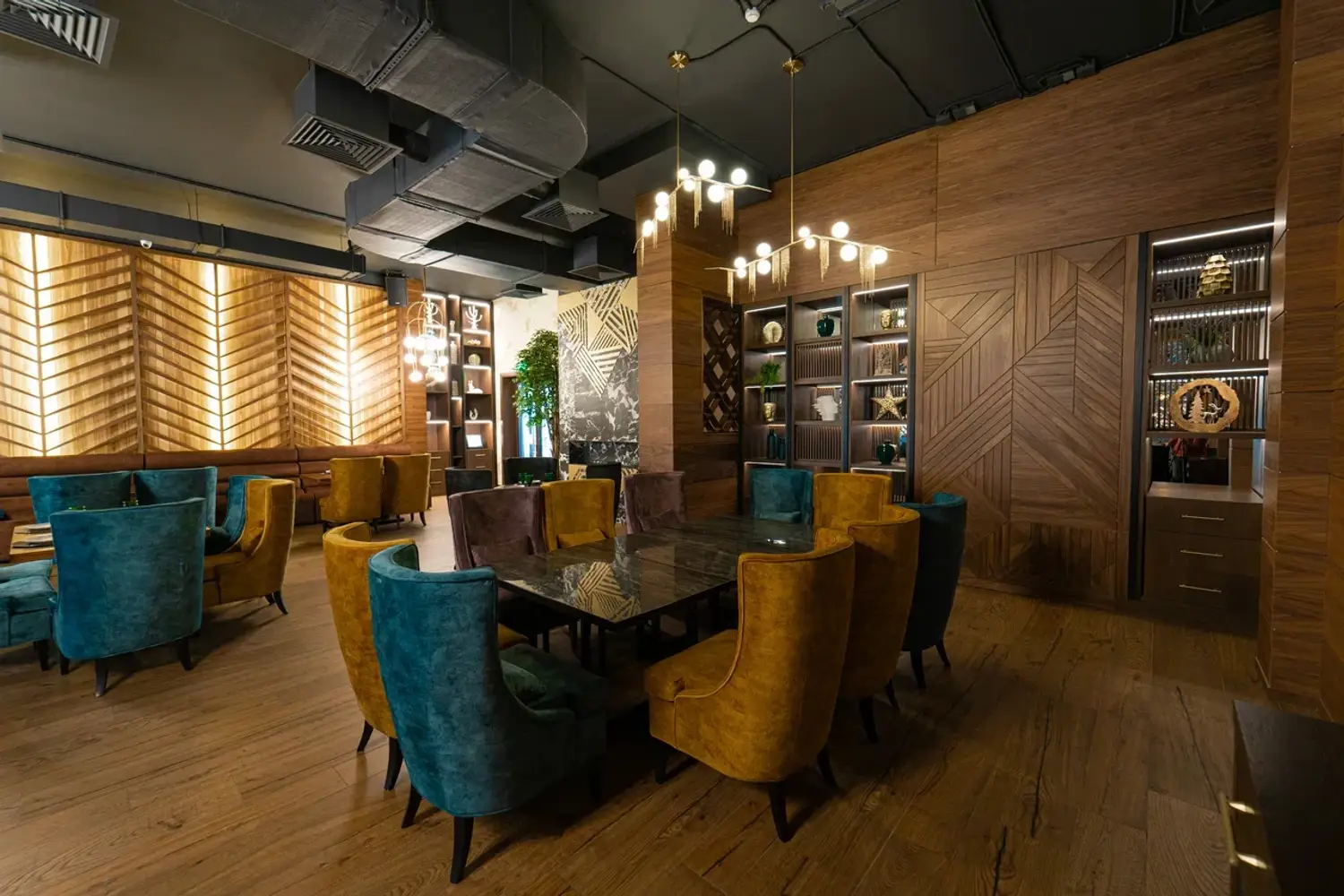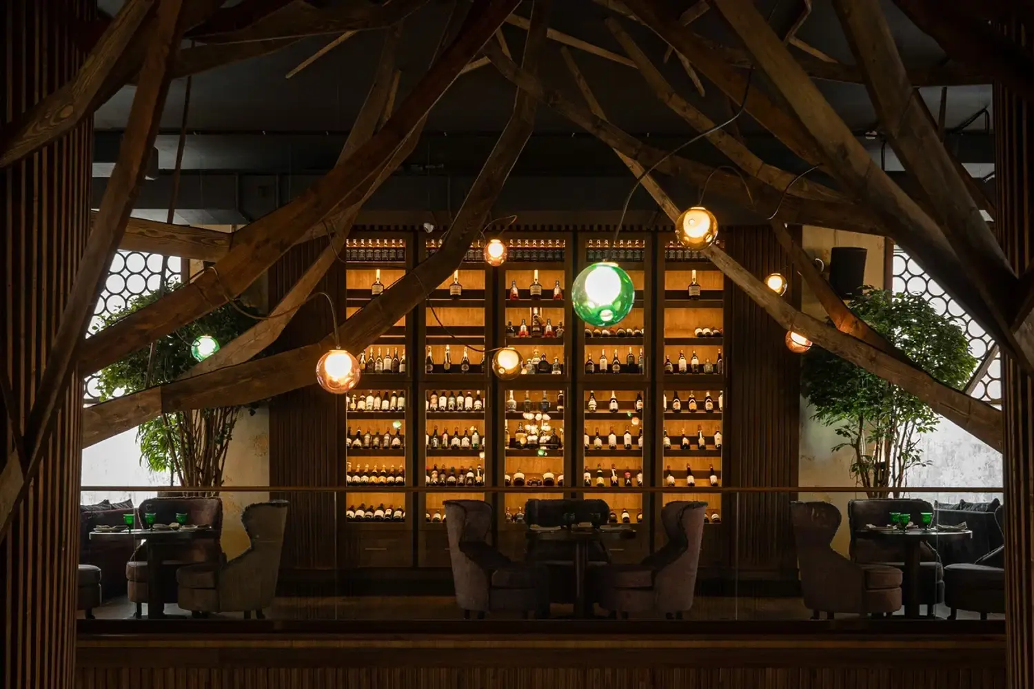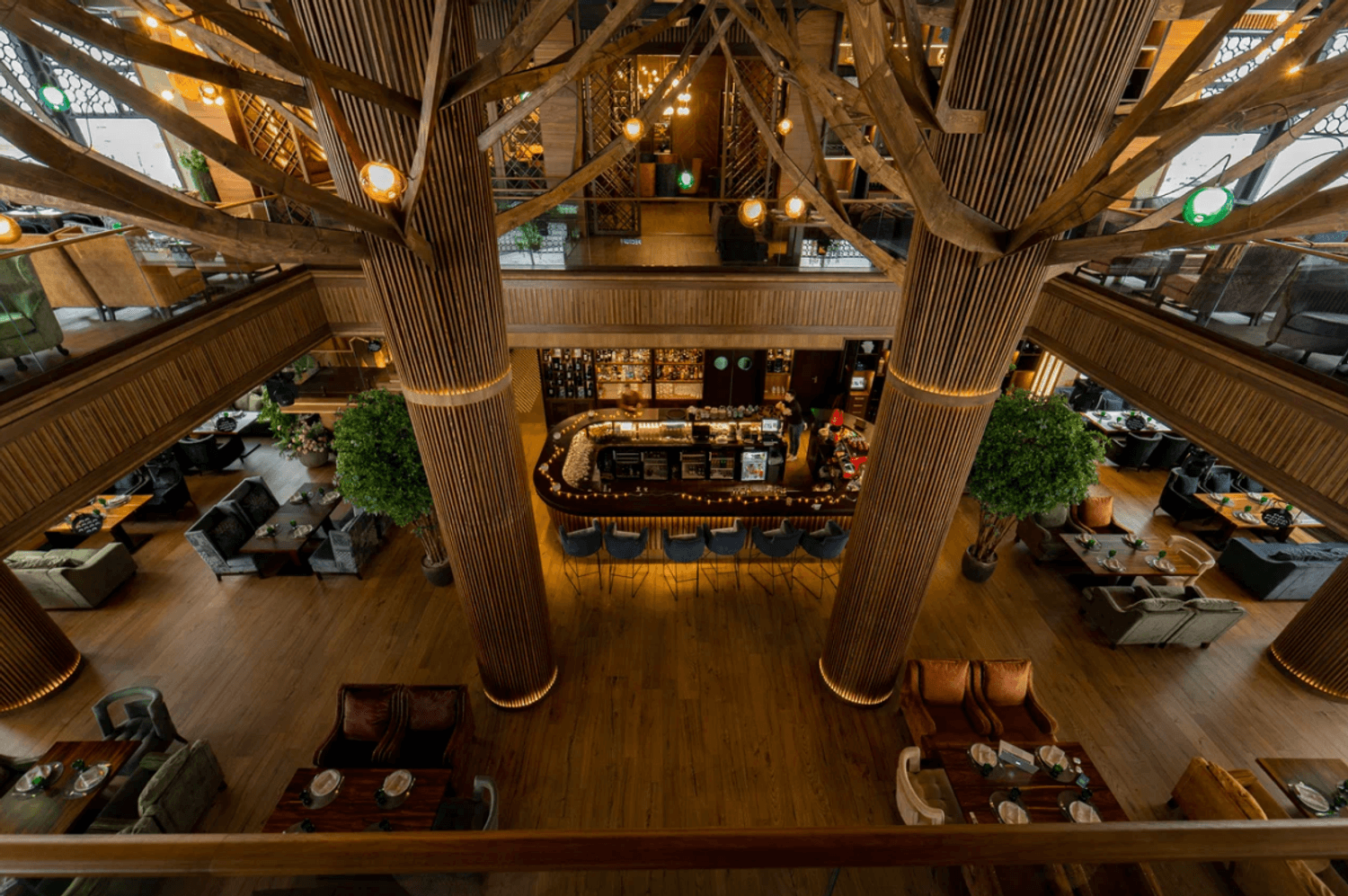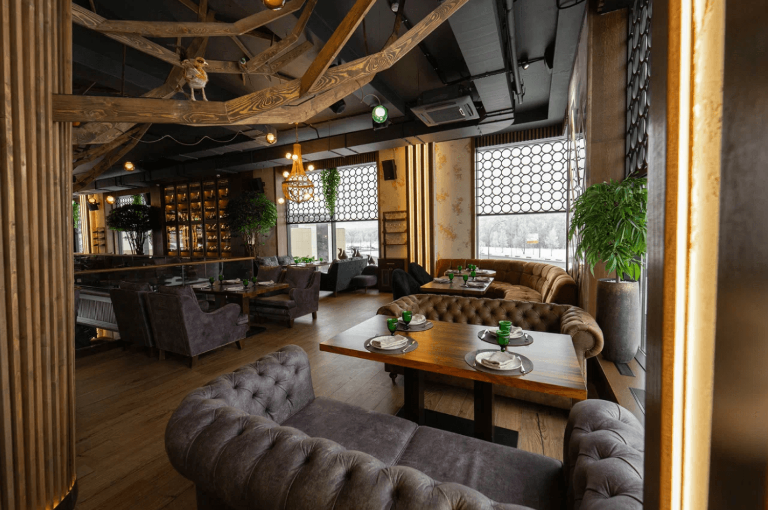 Атмосфера. Интерьер сочетает стиль ар-деко, восточные мотивы и неоклассику: здесь фигурируют яркие кресла и барная стойка с подсветкой, панно с журавлями и инсталляция в виде огромного дерева посреди зала. Высокие потолки и панорамные окна дополнительно создают ощущение торжественности.