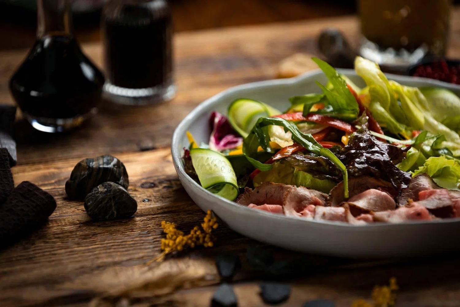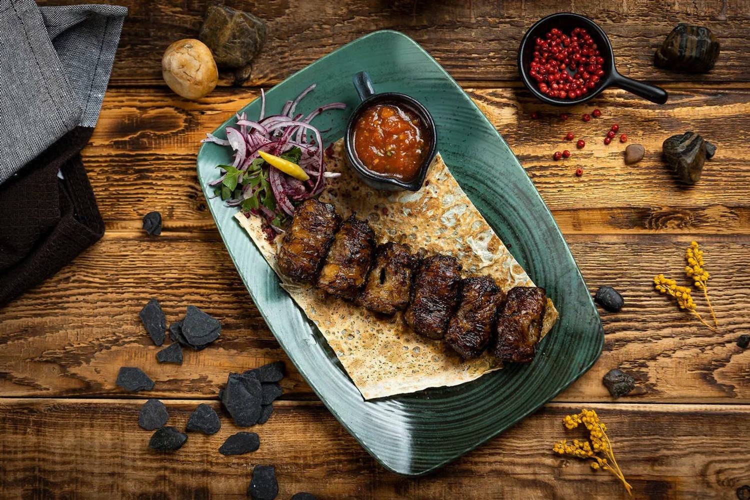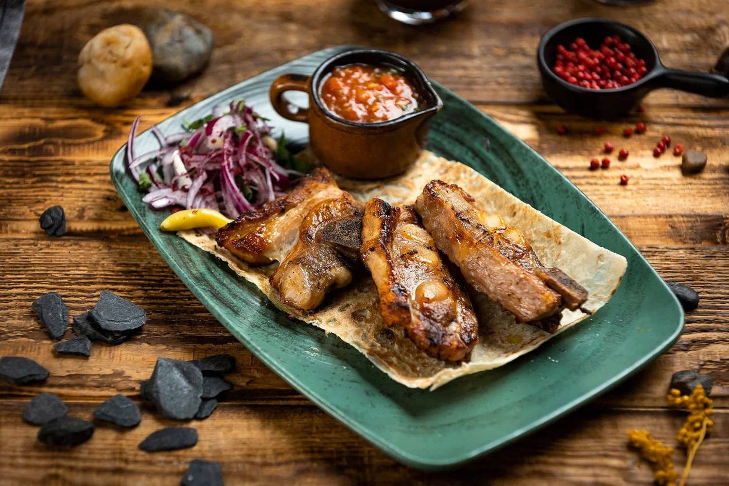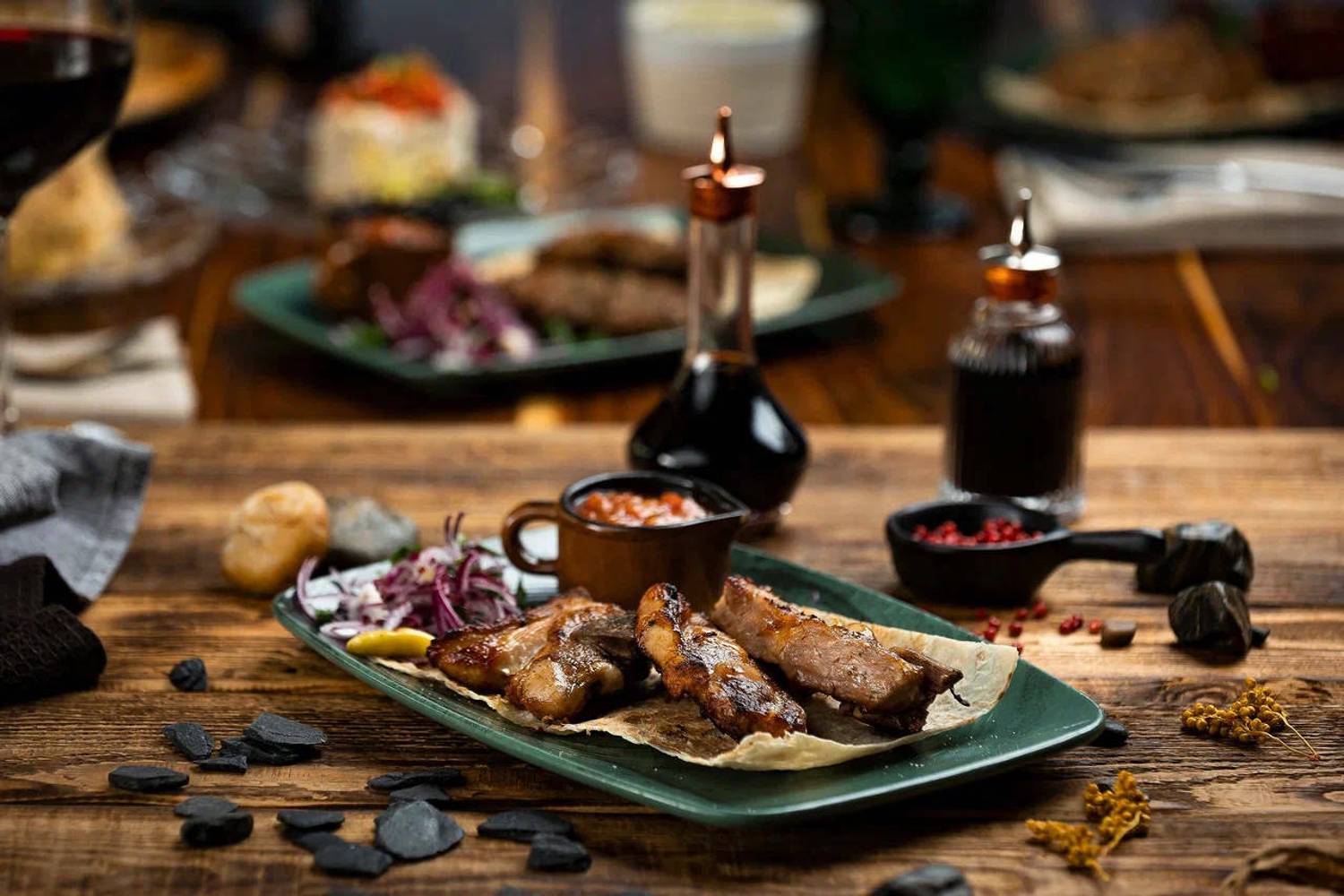 Еда и напитки. В меню — блюда Европы и Кавказа, от стейков и паст до хинкали и шашлыков. Бар предлагает вина и авторские напитки, а по выходным гостей ждут шоу-программы и живая музыка.