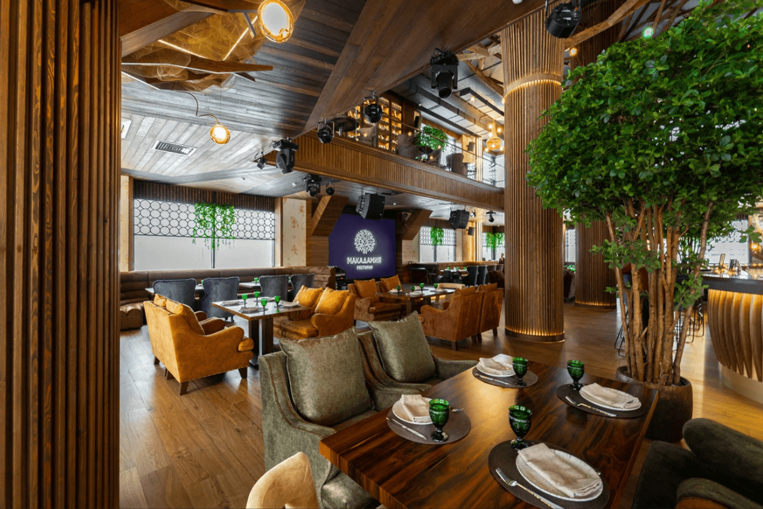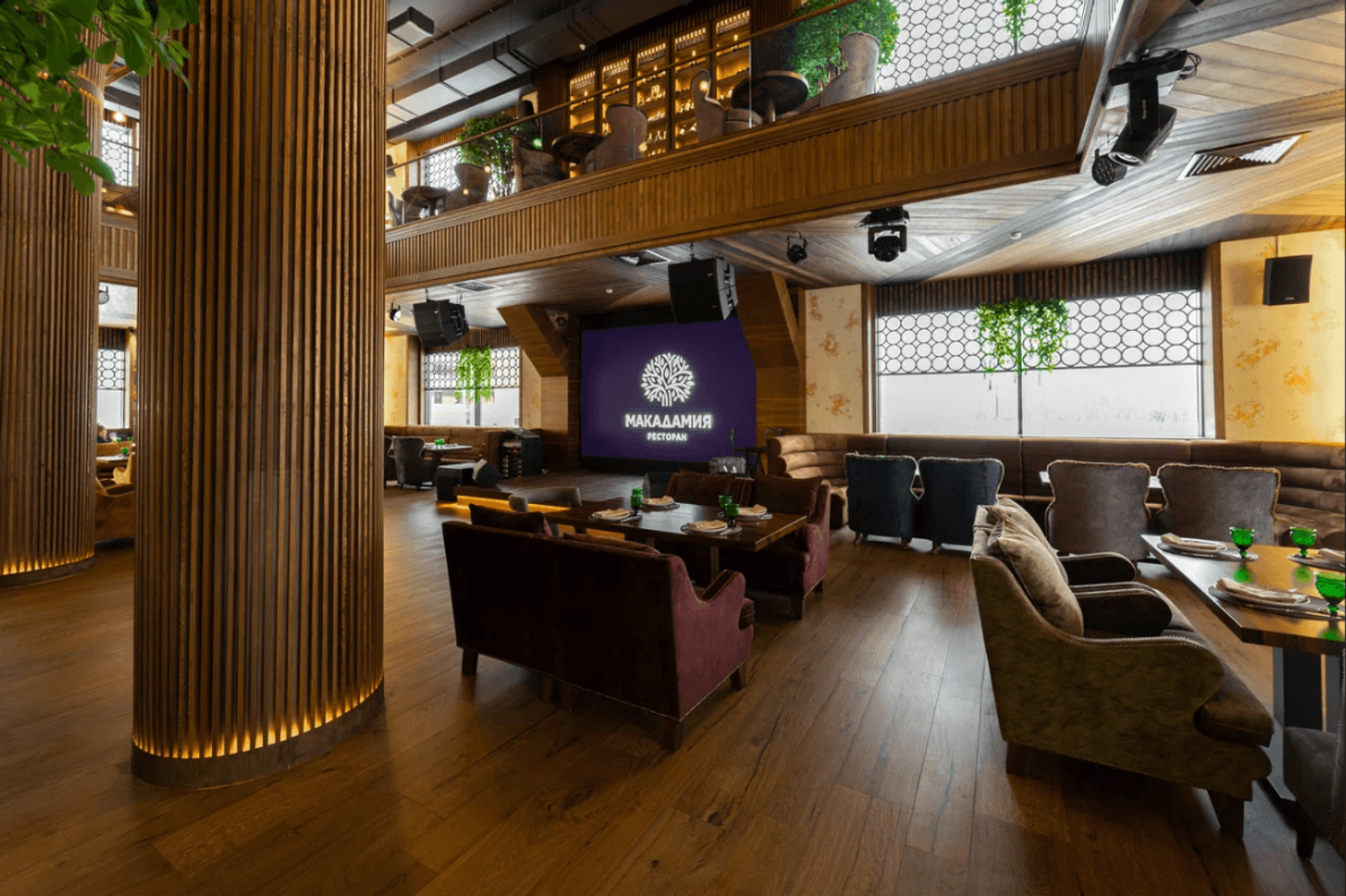 «Макадамия» по адресу Веневская ул., 2А — ресторан европейской и кавказской кухни в роскошном двухэтажном пространстве.