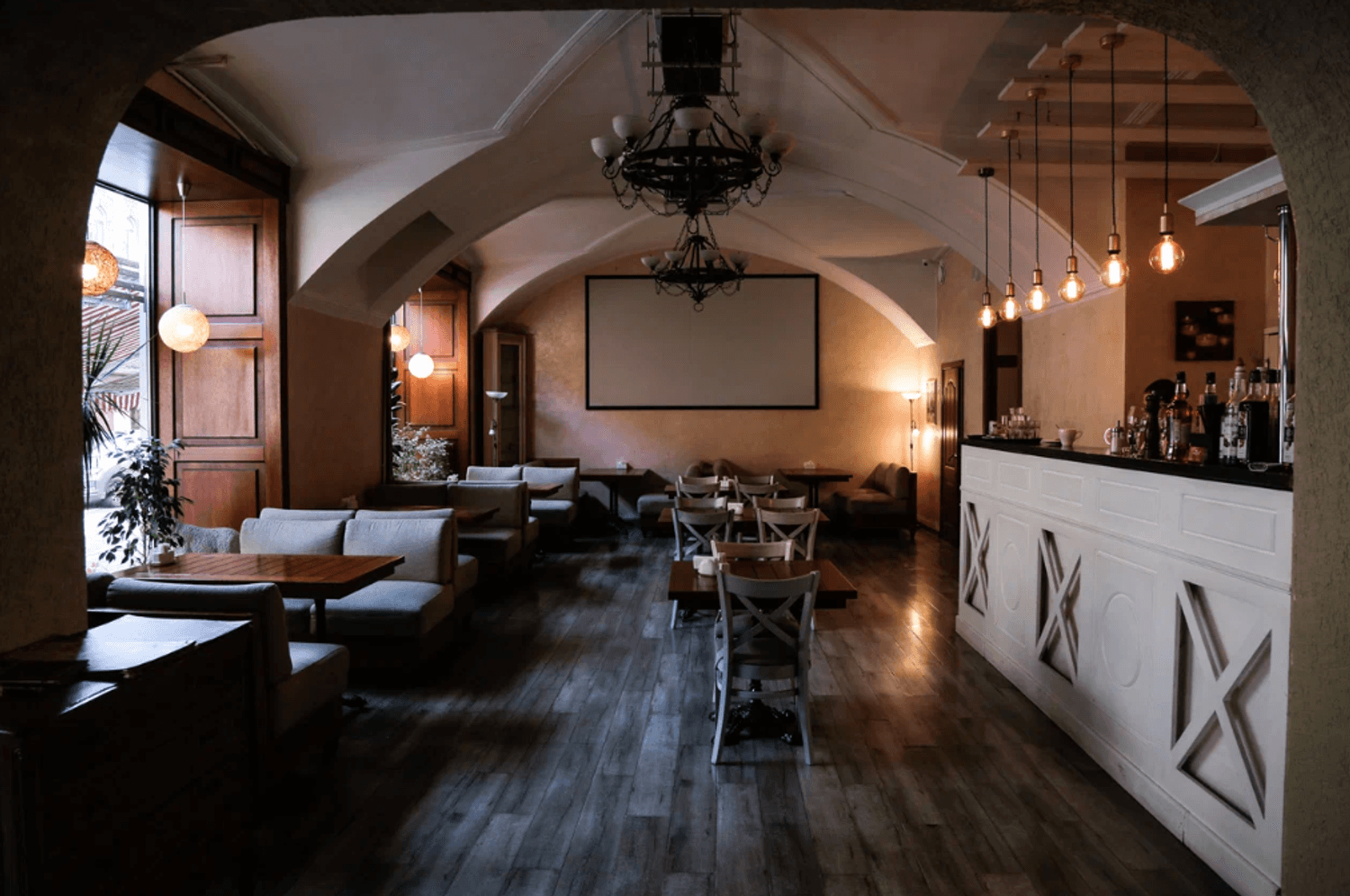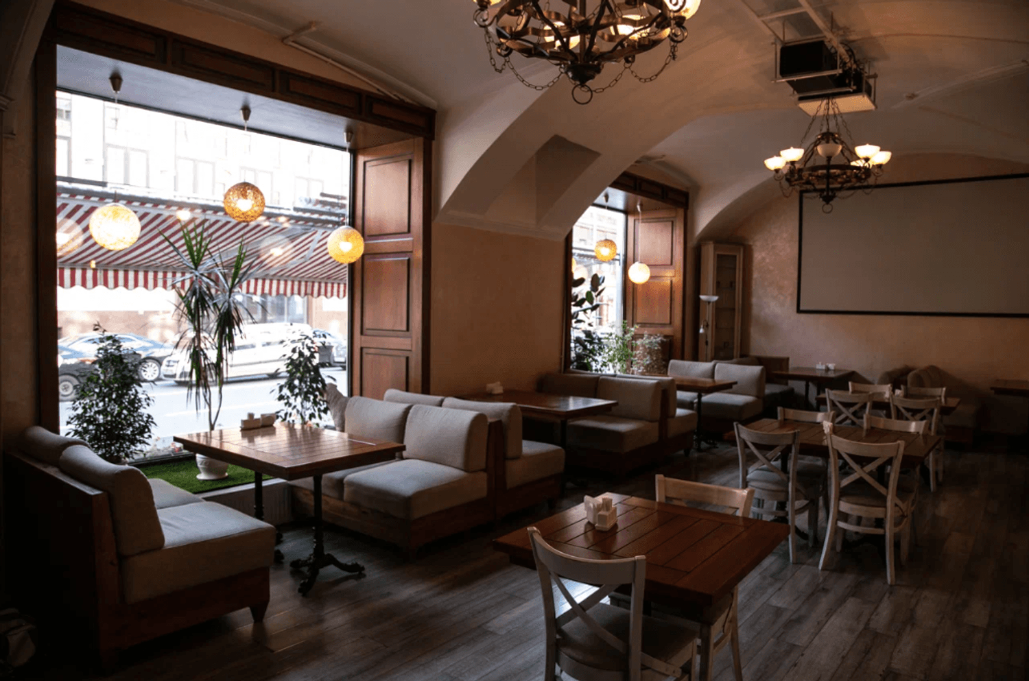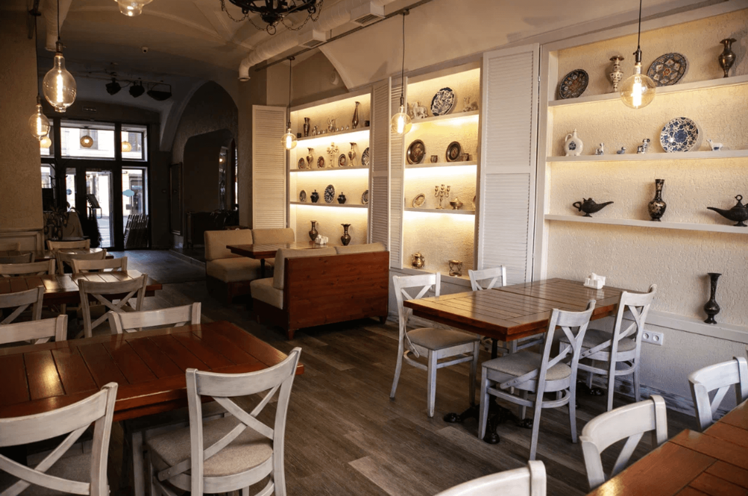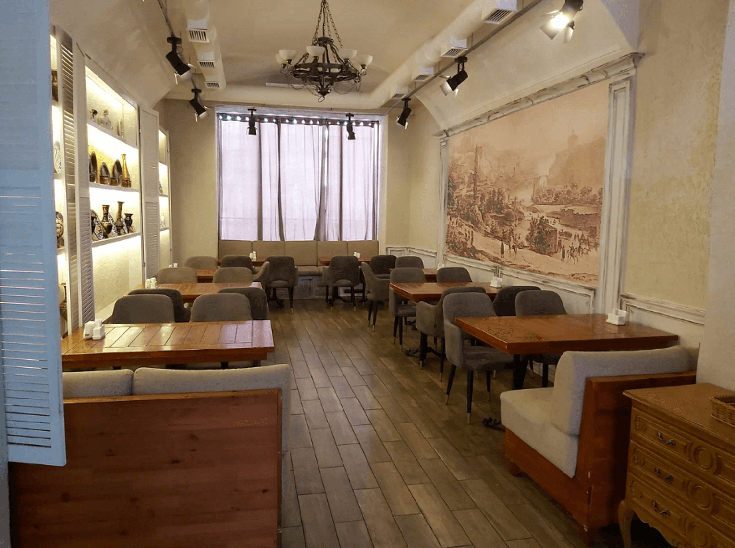 Атмосфера. Здесь три зала, оформленных в классическом стиле: удобные мягкие стулья и диваны, деревянная отделка, светлые стены, полочки с декором в виде расписных тарелок и ваз. Есть как камерный вип-зал на 10-12 персон, так и просторное помещение со сценой и танцполом. Летом гости могут поесть на открытой террасе, а в выходные здесь проходят живые выступления артистов и танцевальные шоу.