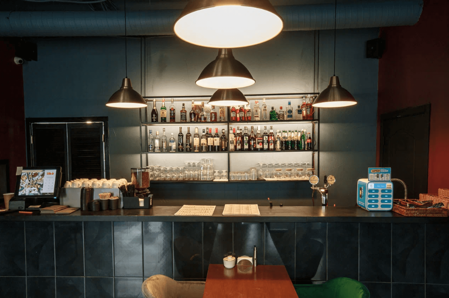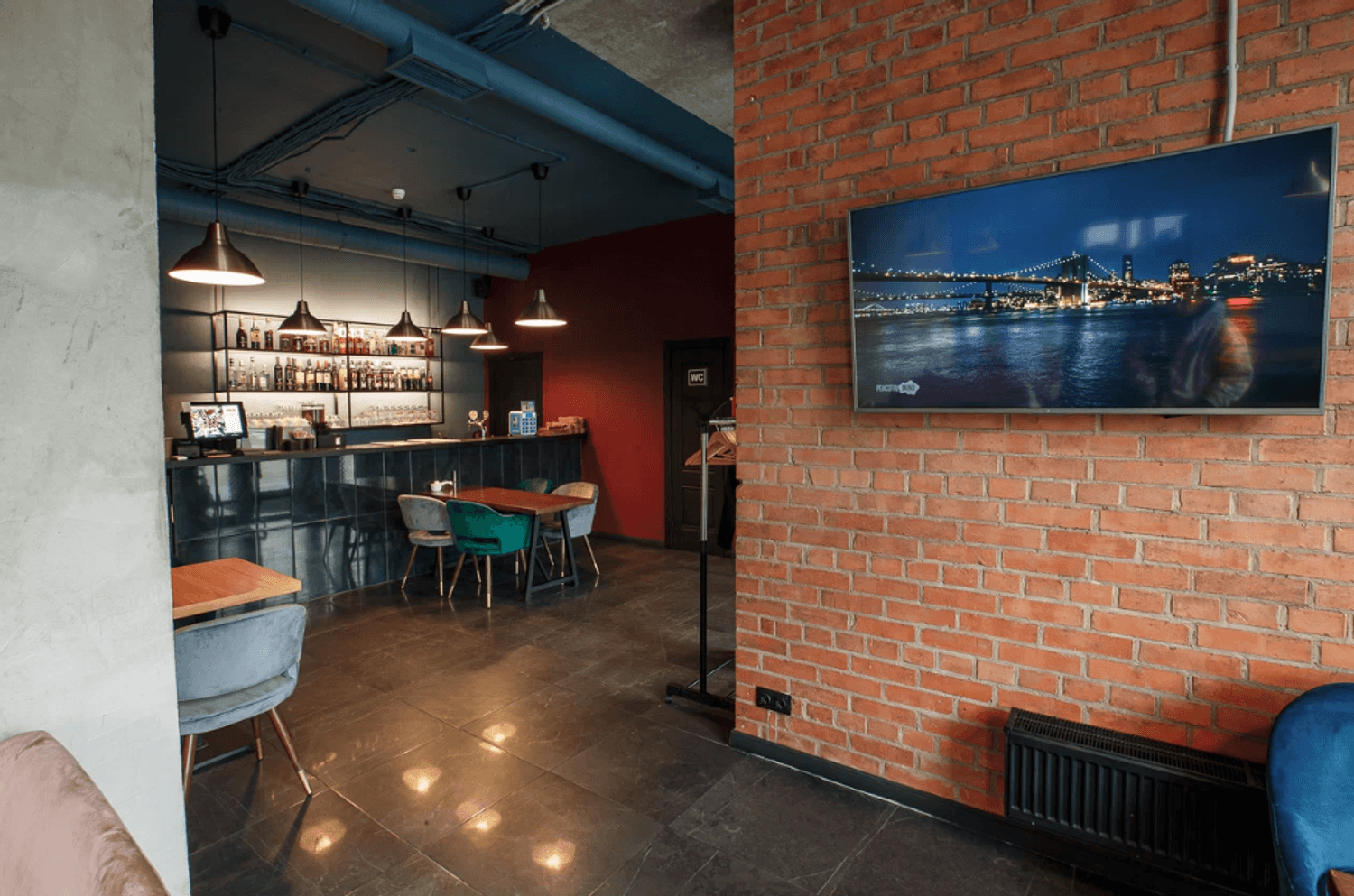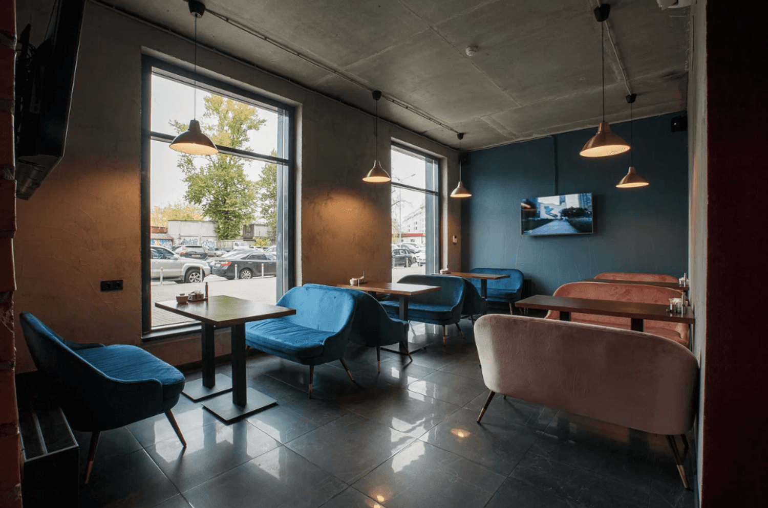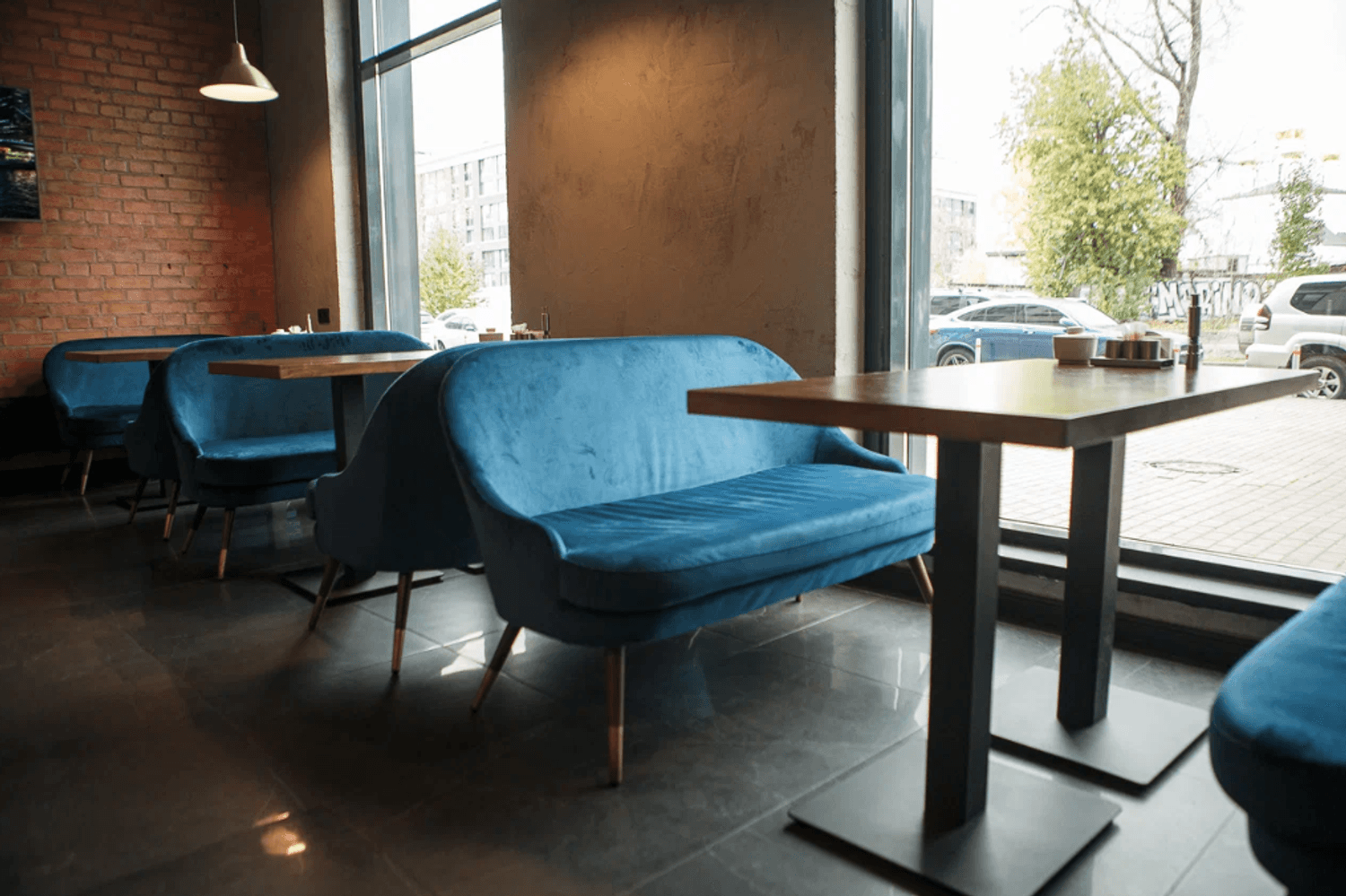 Атмосфера. Пространство в стиле лофт с кирпичными стенами и приглушенным светом металлических ламп создает одновременно уютную и сдержанную обстановку. Удобные диваны вдоль панорамных окон позволяют наблюдать за оживленной жизнью улицы, а минималистичный интерьер из натуральных материалов помогает сосредоточиться на общении и еде.
