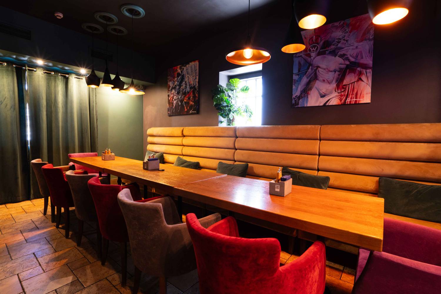 Атмосфера. Индустриальная эстетика с классическими элементами: открытые коммуникации соседствуют с античными статуями, а яркие картины на холстах добавляют художественную динамику. Летняя терраса с подвесными креслами — зона релакса в центре города.