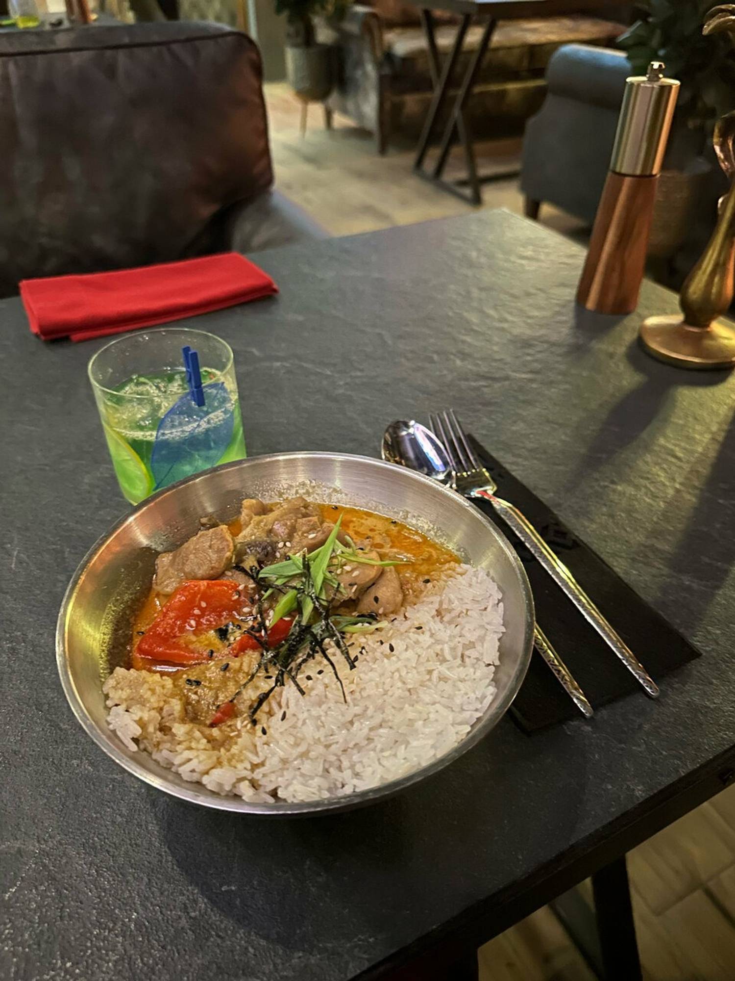 Еда и напитки. В меню — азиатская, японская и итальянская кухни. Из азиатских блюд есть индонезийский карри с курицей, ми горенг с креветками, пад тай с тофу, из японских — нигири с том ям креветкой, темпура ролл с тунцом и ореховым соусом. Также готовят итальянскую пиццу с песто и цыпленком и пасту болоньезе. К коктейлям можно заказать снеки: джерки из говядины, свинины, оленины или фисташки.