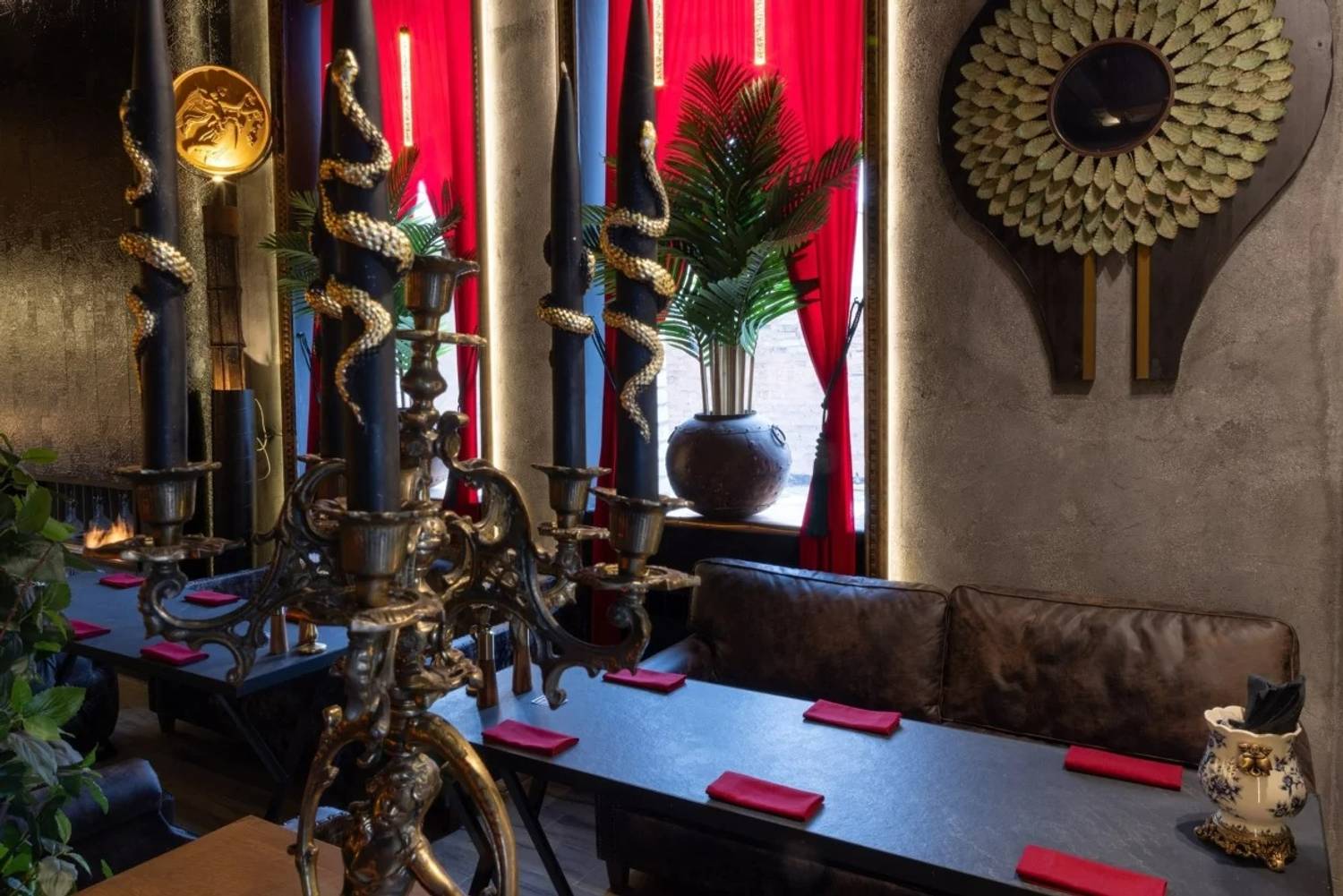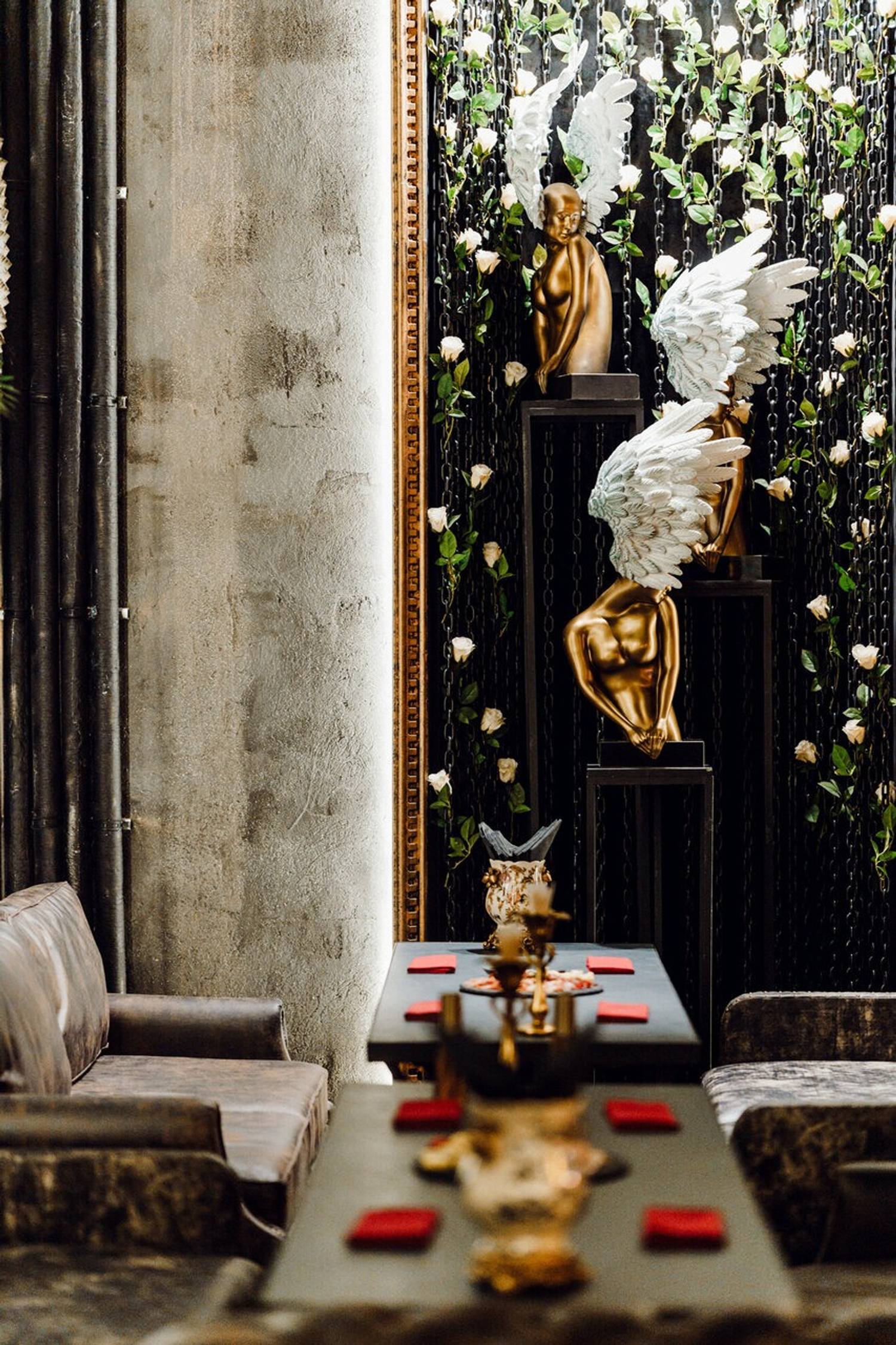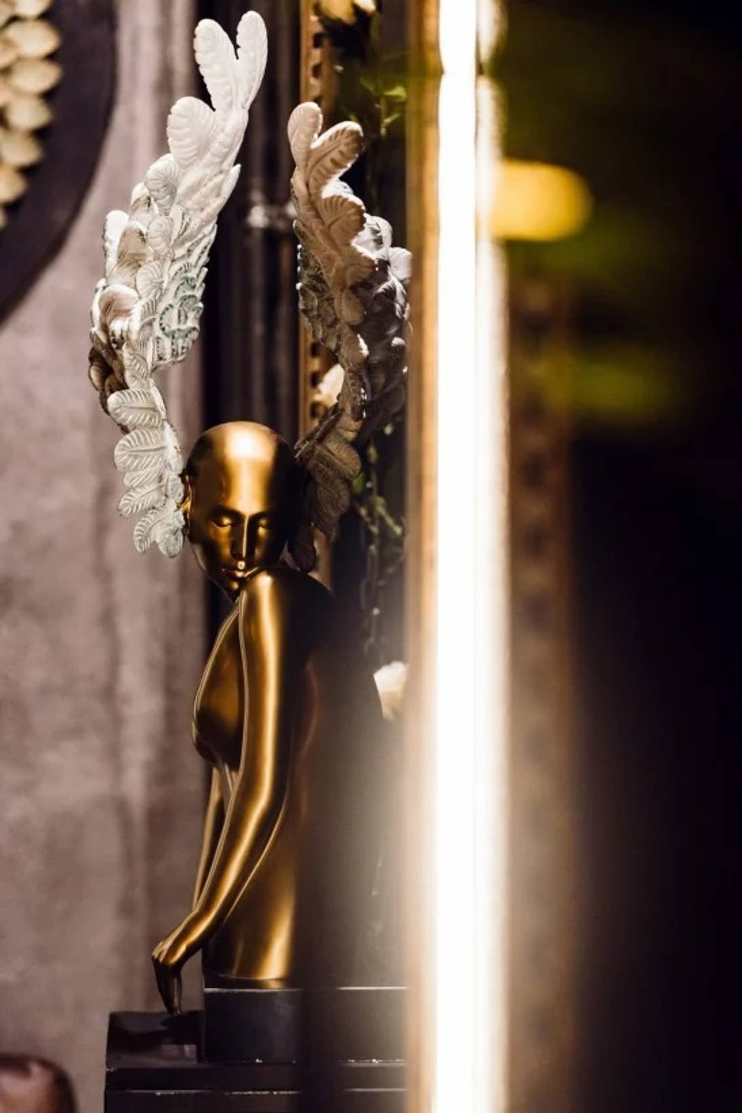 Атмосфера. Черно-золотой стиль арт-деко с элементами стимпанка и приглушенным светом. Золотые колонны и светящиеся лампы-колбы соседствуют с мистическими деталями — черными подсвечниками с золотыми змеями и фигурками с белыми крыльями. И, кстати, многие детали выполнены вручную — от этого они еще более уникальны. Сюда приходят, чтобы расслабиться: заказать кальян и поиграть в приставку.