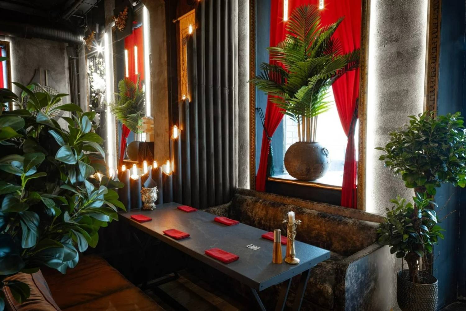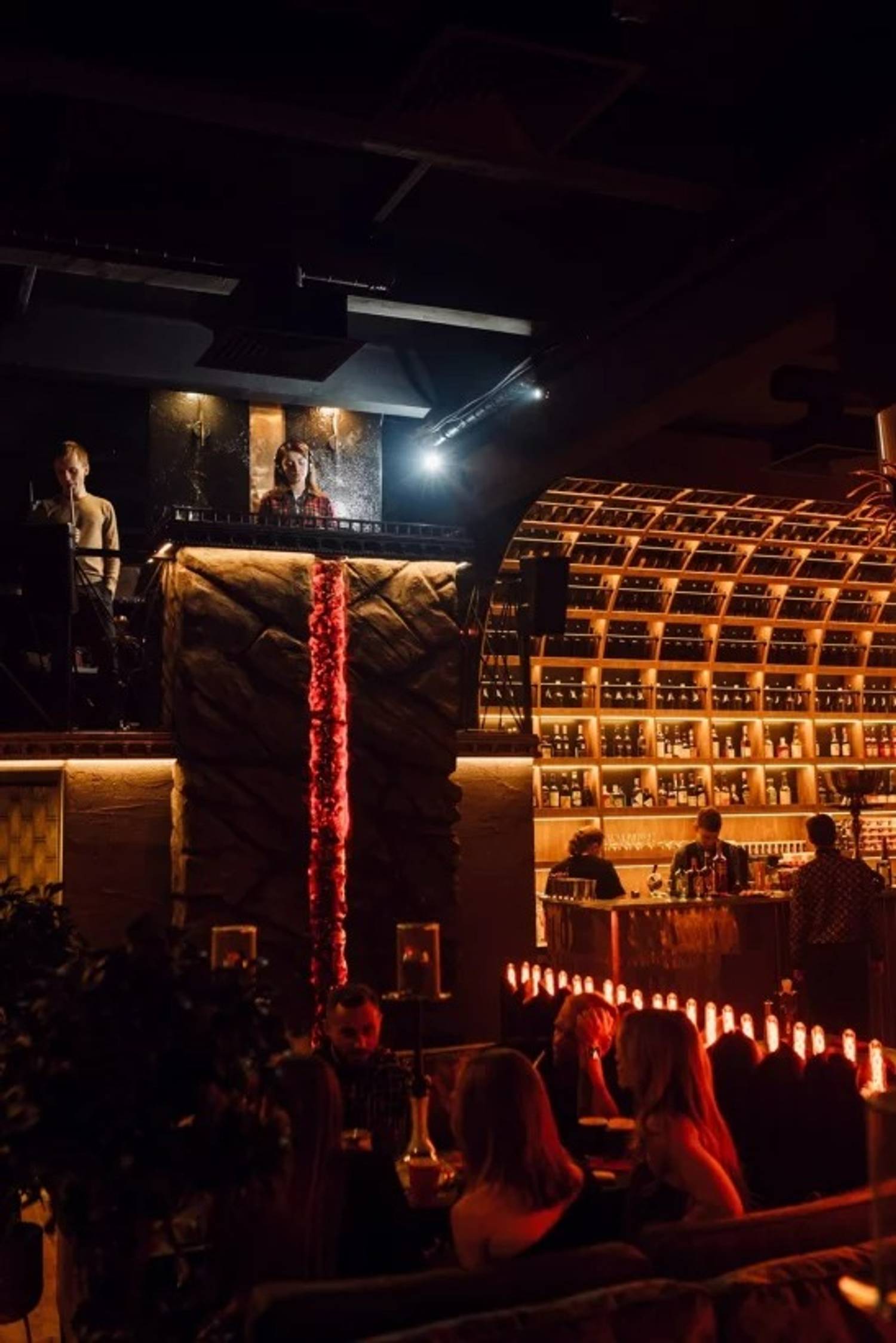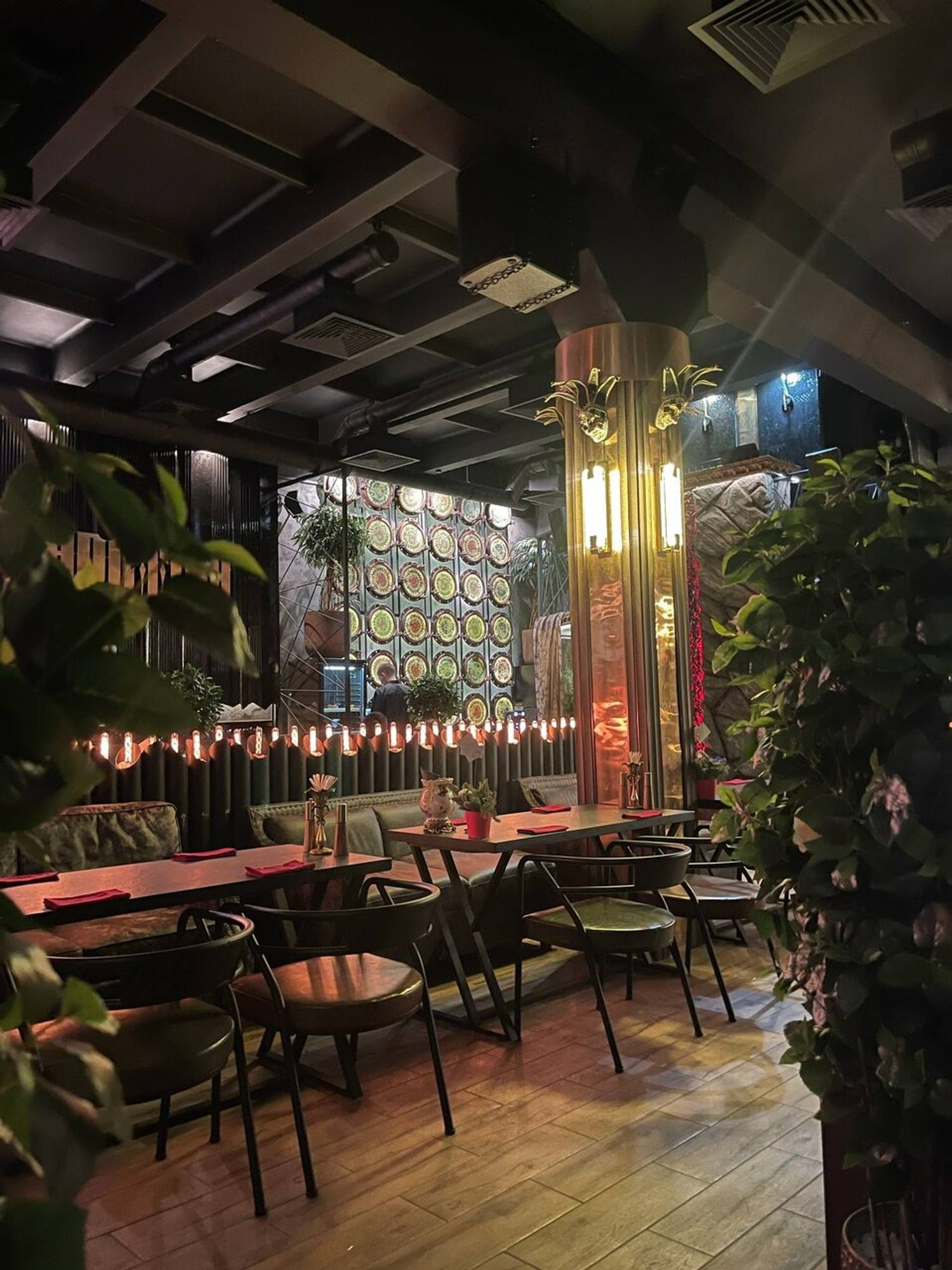 Атмосфера. Черно-золотой стиль арт-деко с элементами стимпанка и приглушенным светом. Золотые колонны и светящиеся лампы-колбы соседствуют с мистическими деталями — черными подсвечниками с золотыми змеями и фигурками с белыми крыльями. И, кстати, многие детали выполнены вручную — от этого они еще более уникальны. Сюда приходят, чтобы расслабиться: заказать кальян и поиграть в приставку.