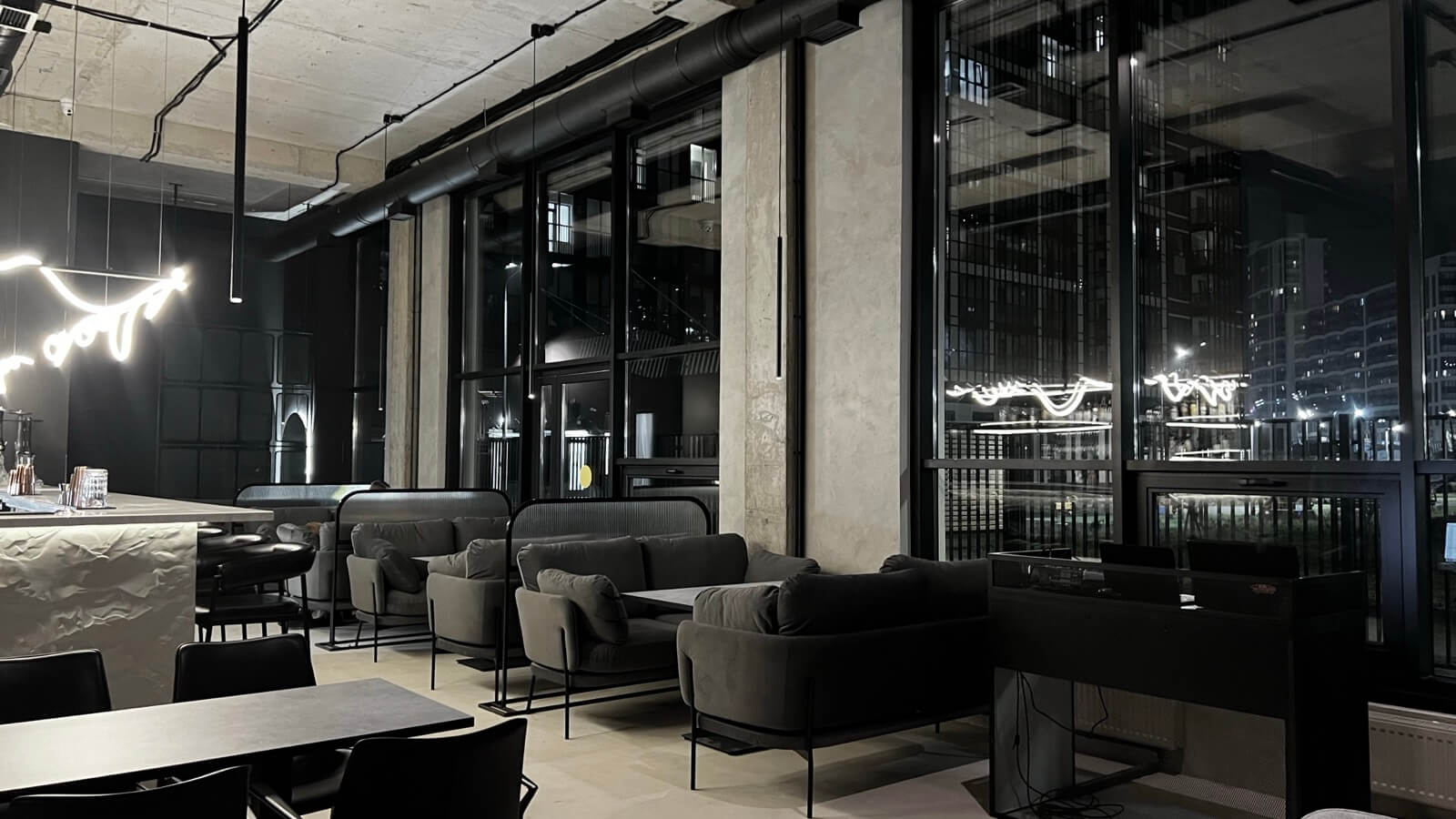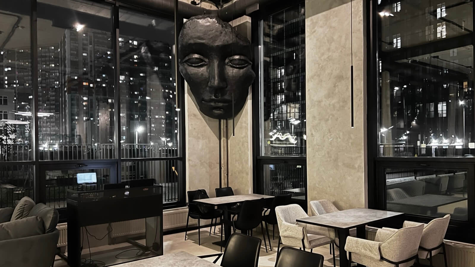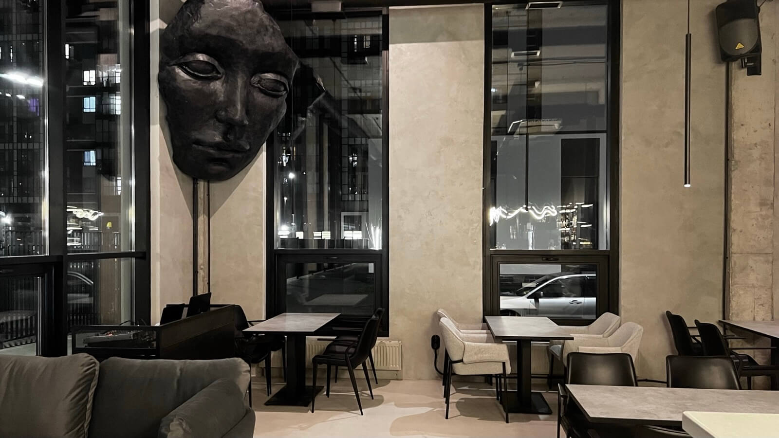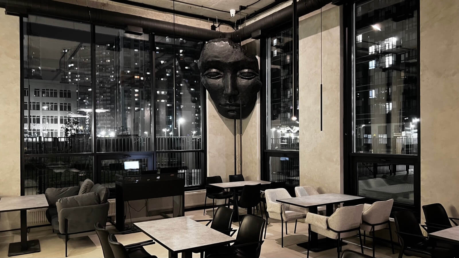Атмосфера. Пространство сочетает индустриальный минимализм с японской эстетикой: черно-белый интерьер, бетонные стены, металлические балки и барная стойка из натурального камня контрастируют с парящей скульптурой в виде маски ручной работы. Здесь панорамные окна, низкая мебель для полного релакса и приглушенное освещение, благодаря чему гости могут по-настоящему расслабиться.