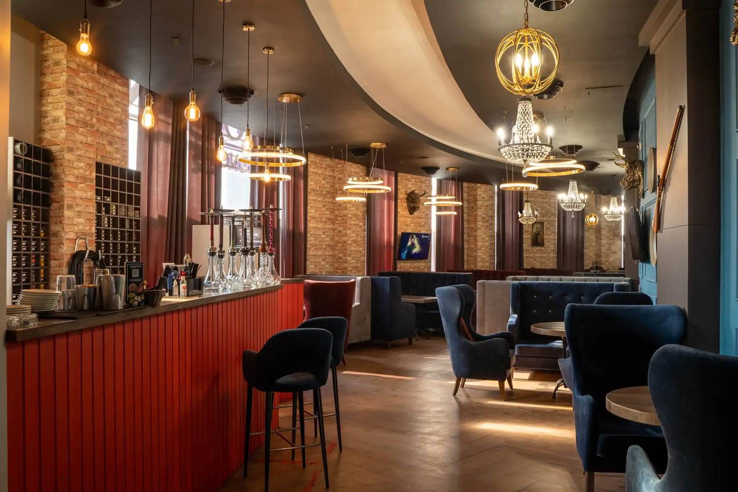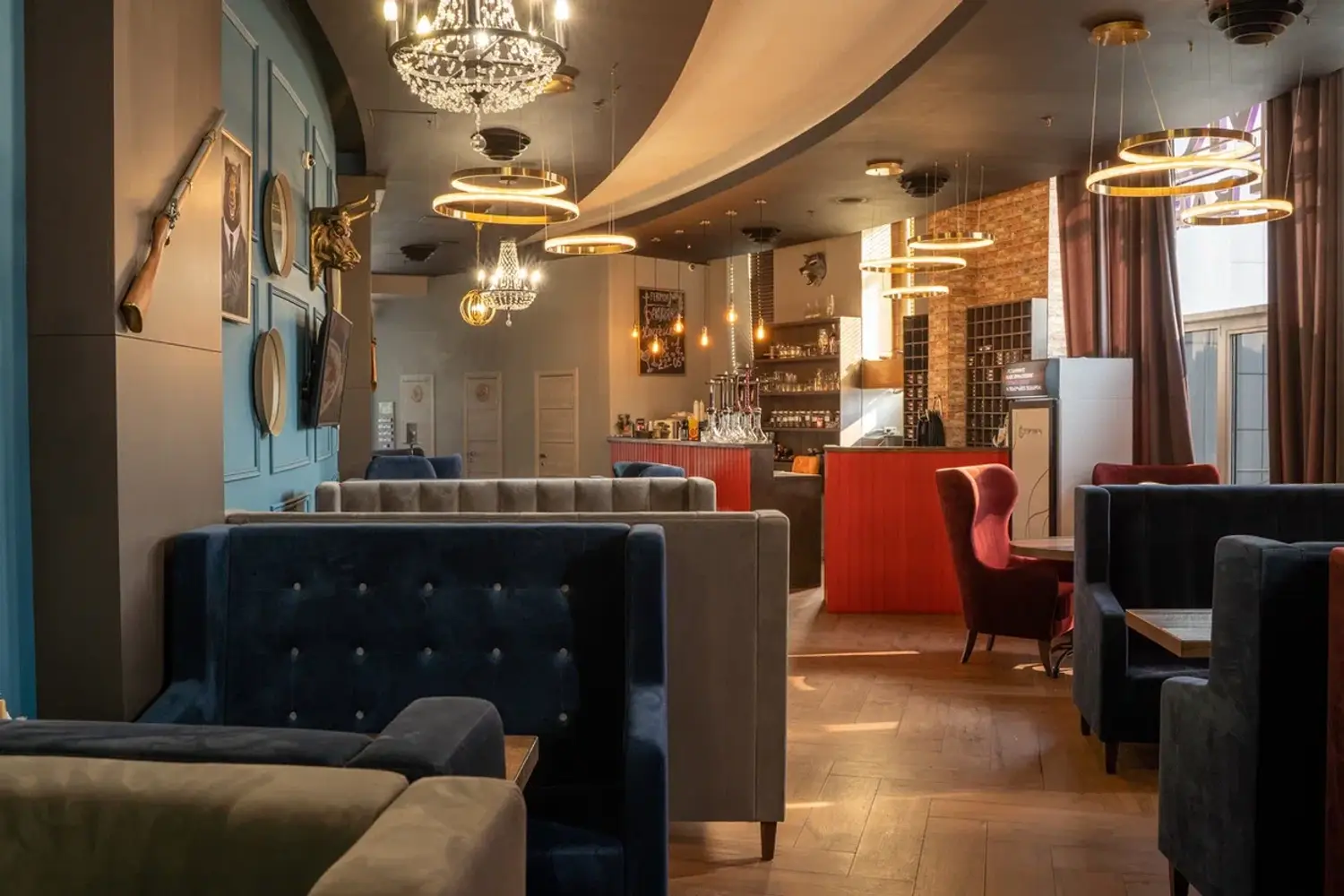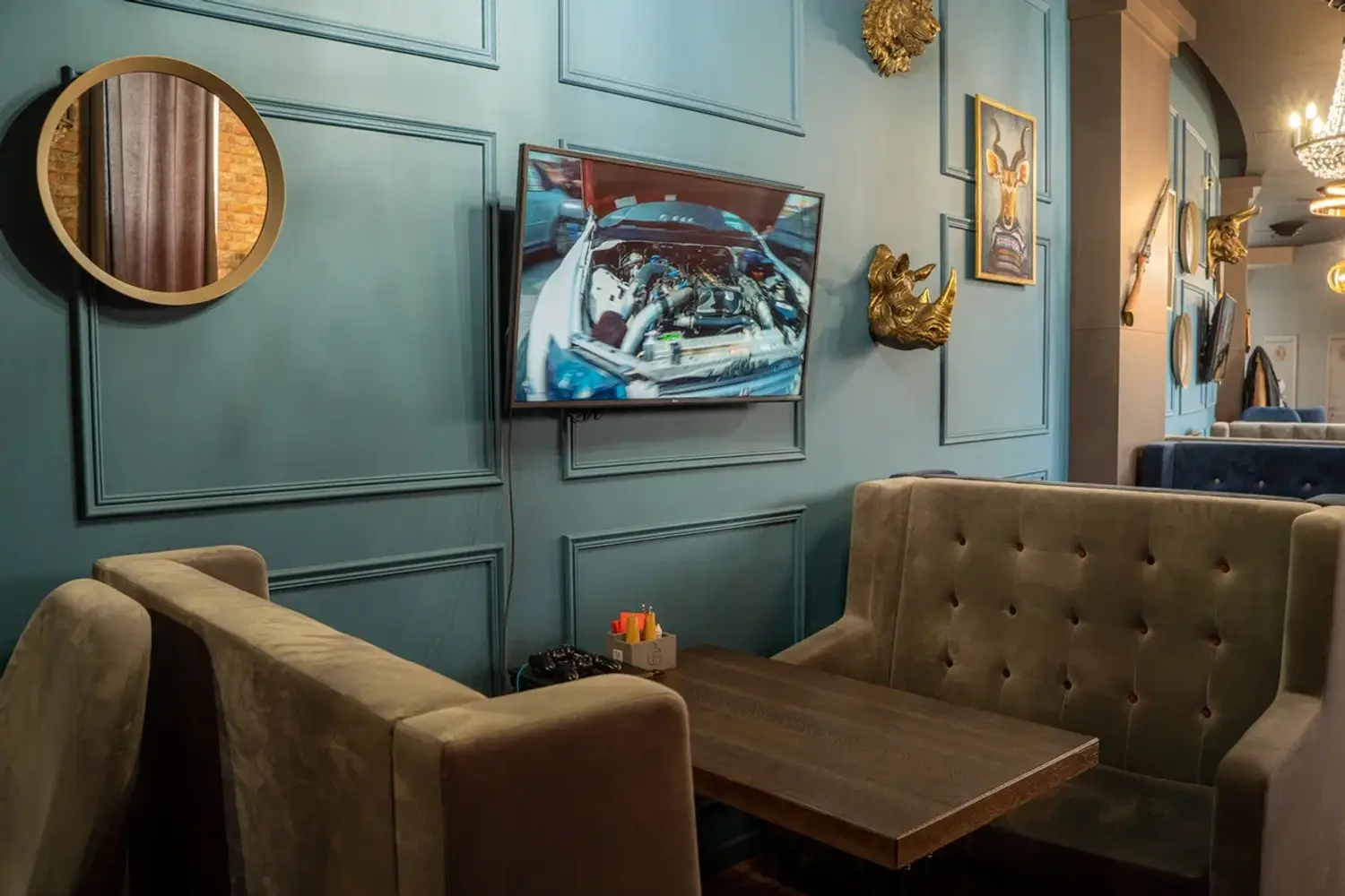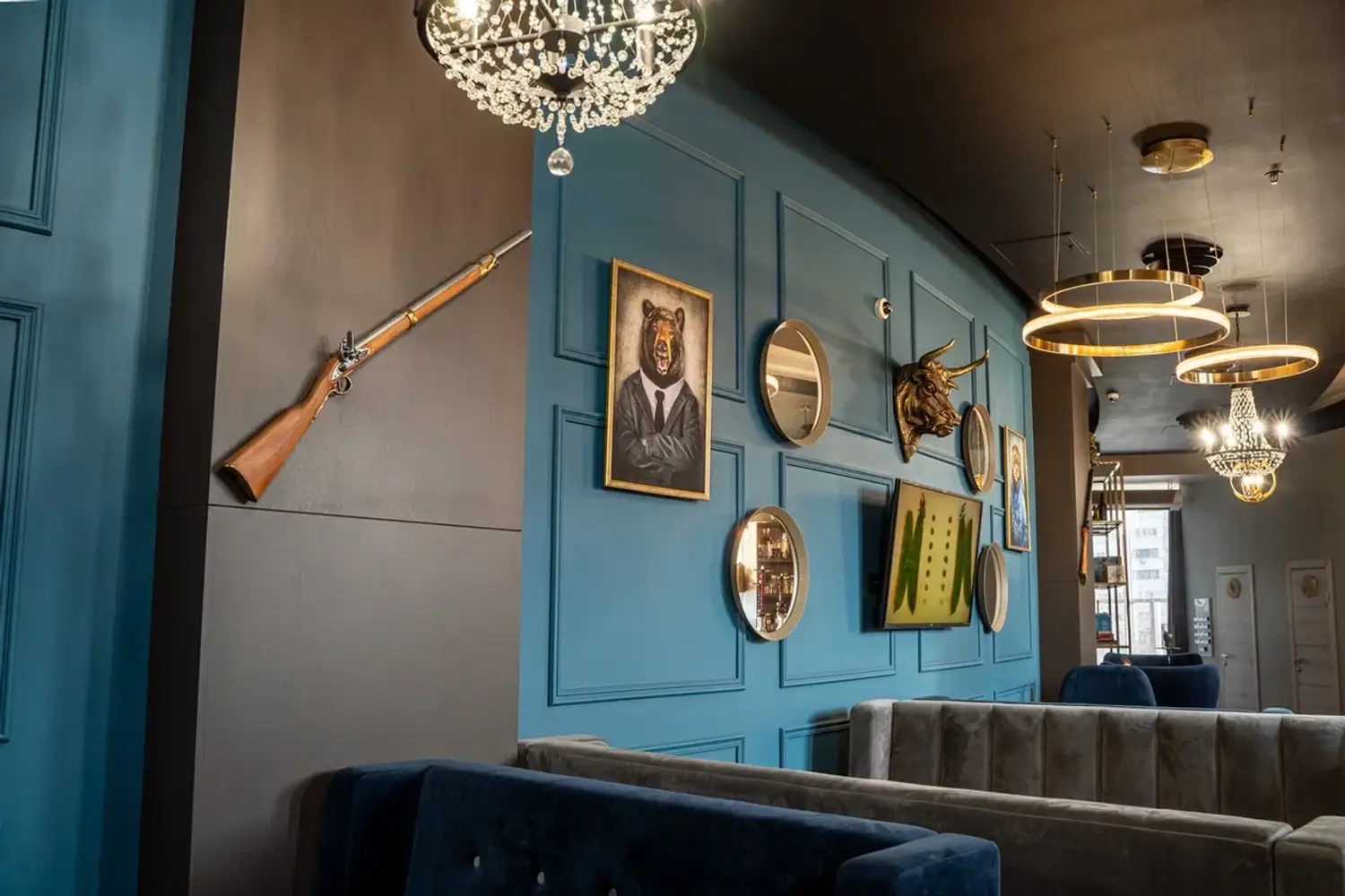 Атмосфера. Матовые бирюзовые стены служат фоном для золотых люстр, декоративной головы быка и картин с собаками в мундирах, создавая атмосферу игривой серьезности. Мягкие диваны и зоны с мягкой мебелью располагают к неспешному отдыху в компании друзей.
