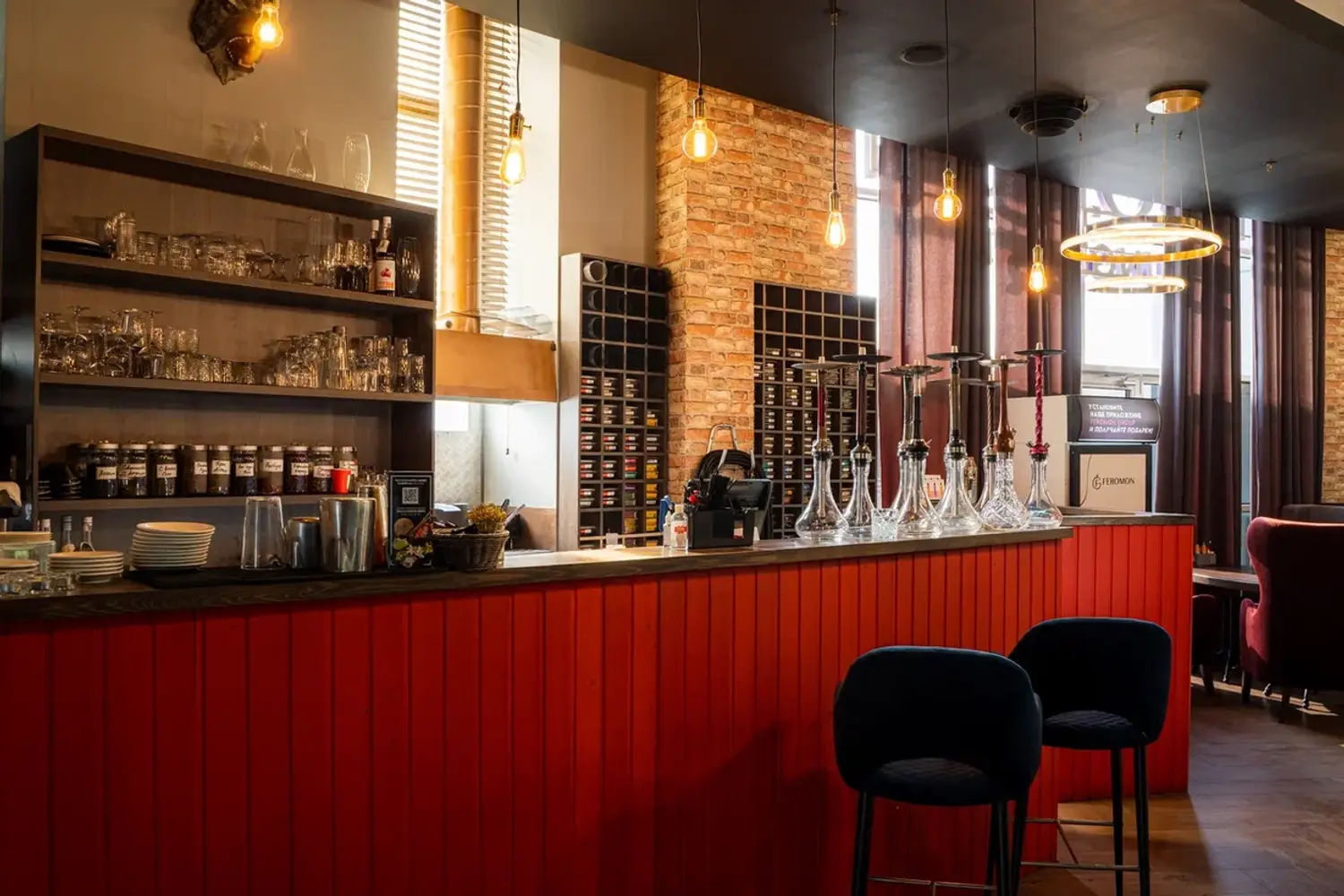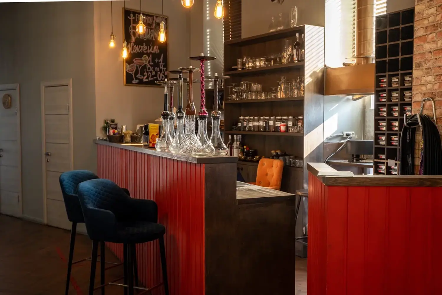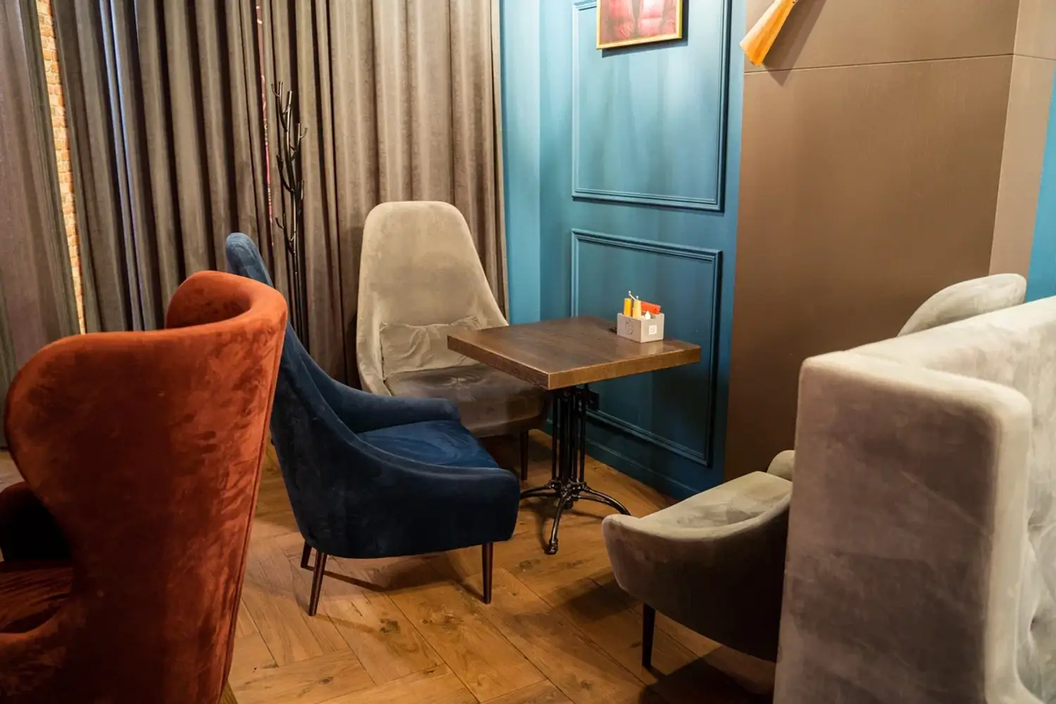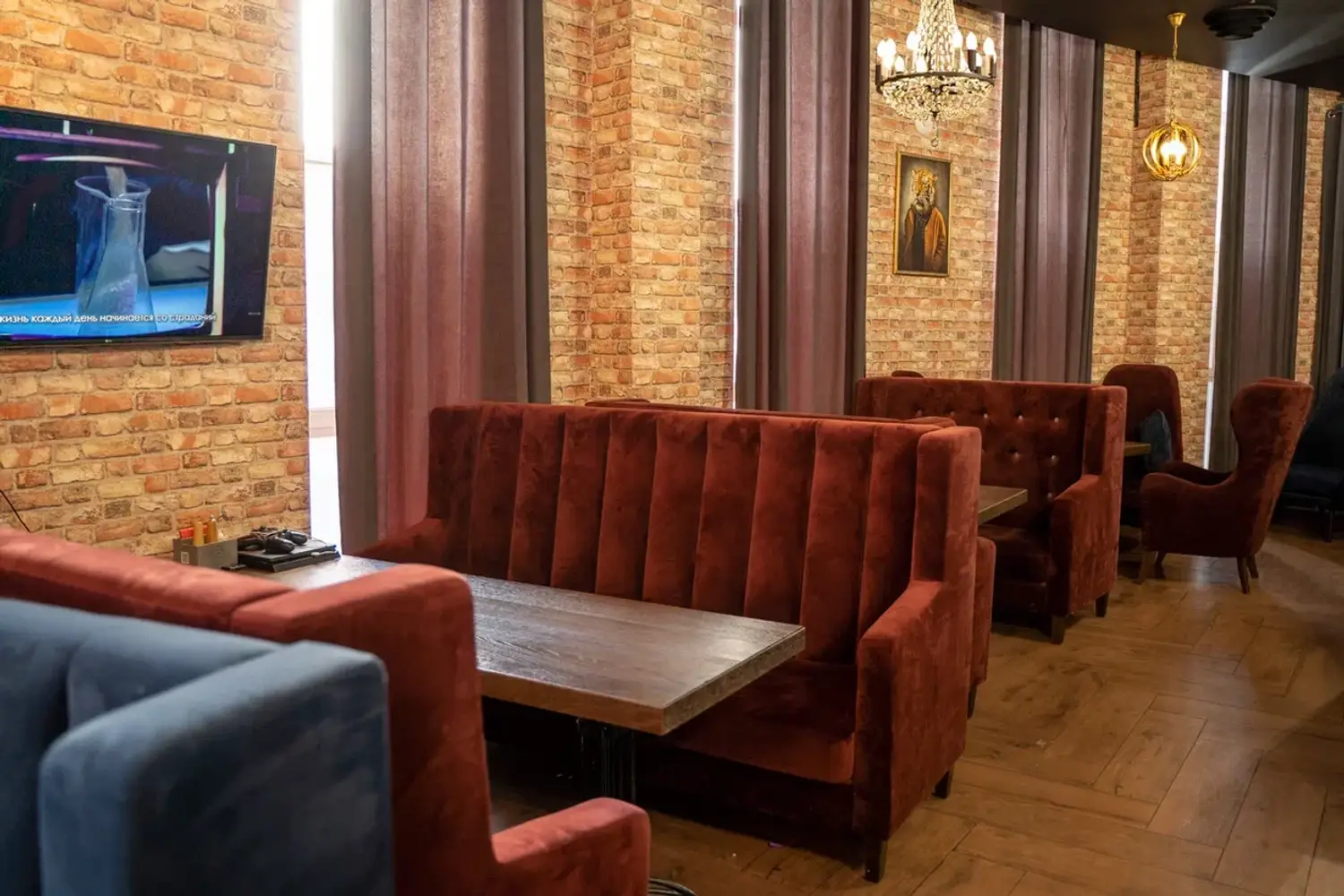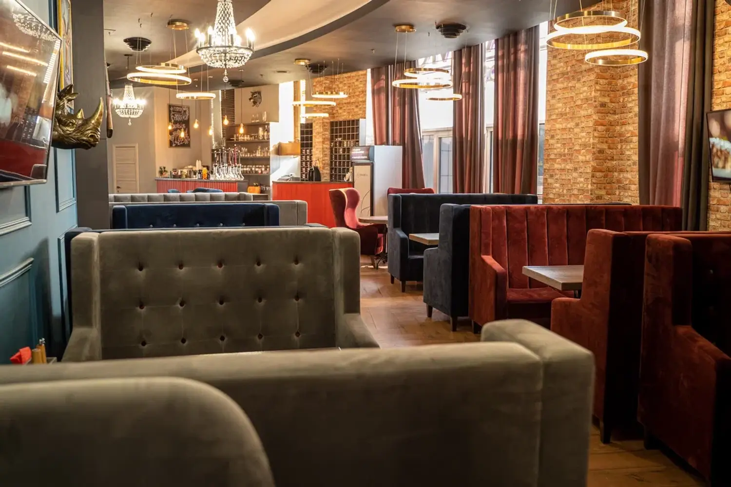 Атмосфера. Матовые бирюзовые стены служат фоном для золотых люстр, декоративной головы быка и картин с собаками в мундирах, создавая атмосферу игривой серьезности. Мягкие диваны и зоны с мягкой мебелью располагают к неспешному отдыху в компании друзей.