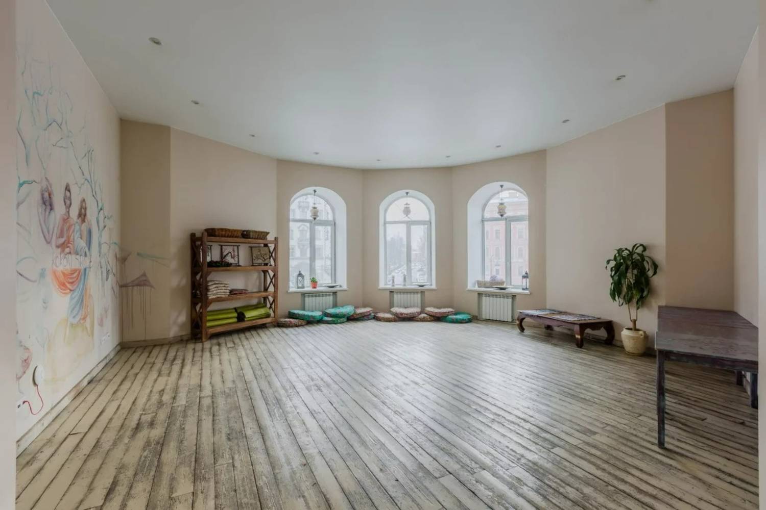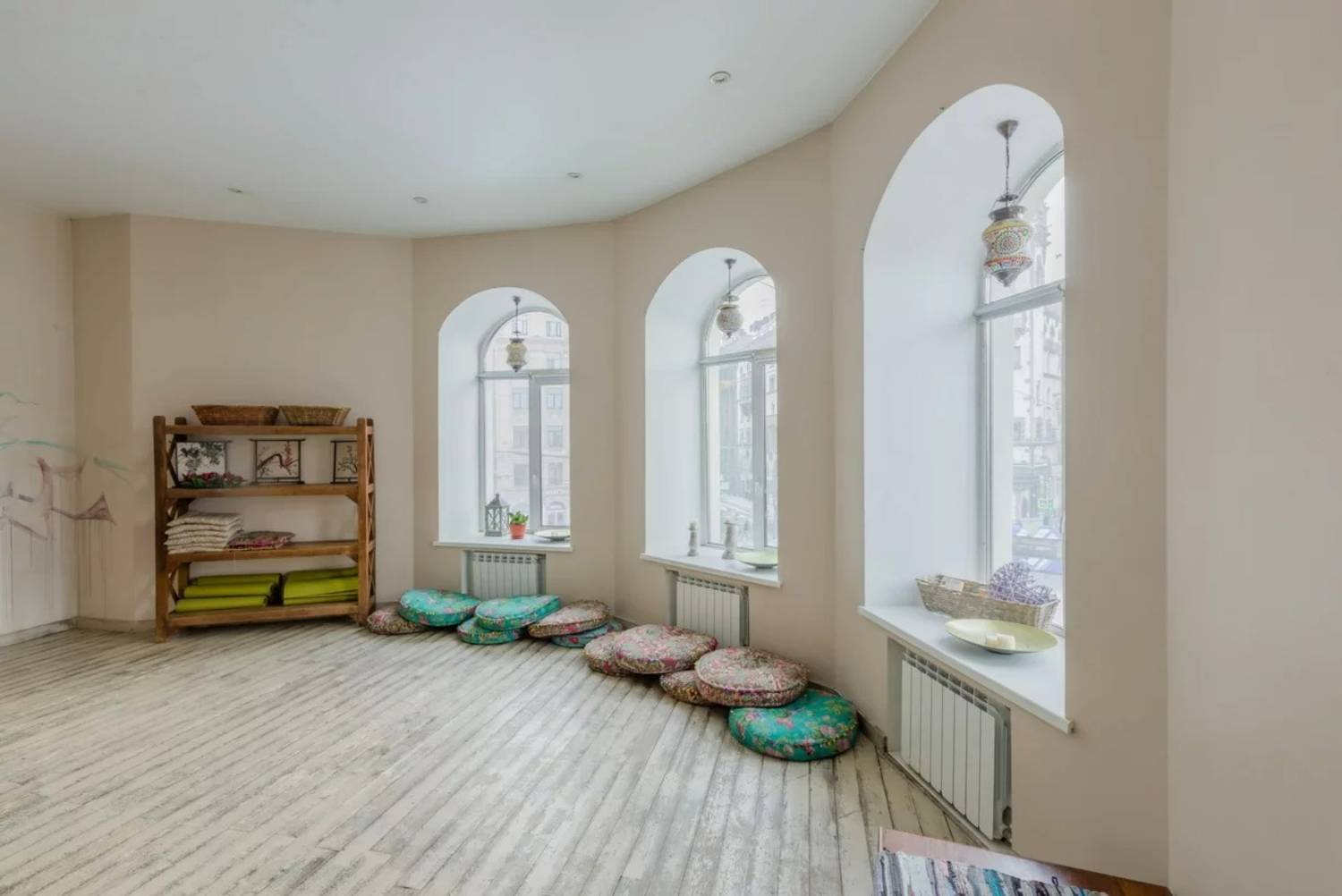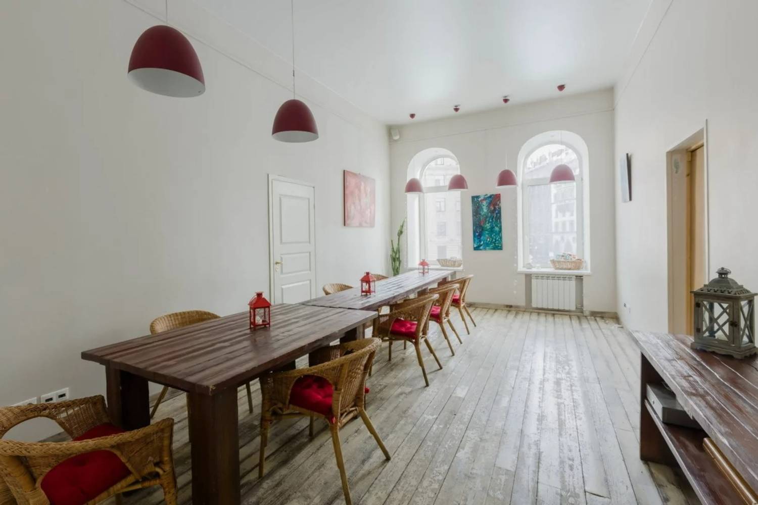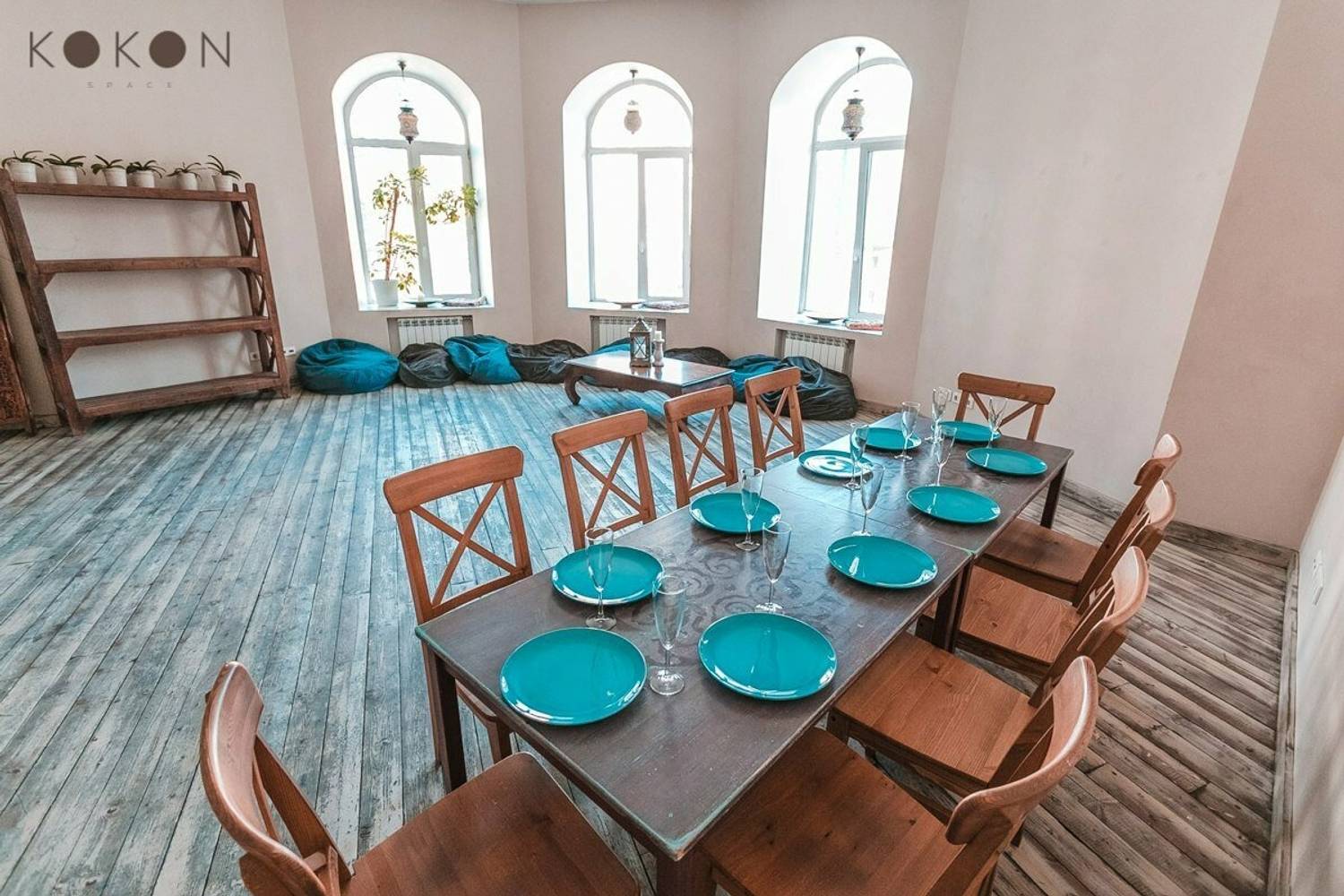 Атмосфера. Светлые просторные залы с минималистичным оформлением. Здесь 3 зала для аренды: малый на 20 человек, бирюзовый на 40 и круглый на 45. Внутри каждого особенная атмосфера: арочные окна и авторская мебель.