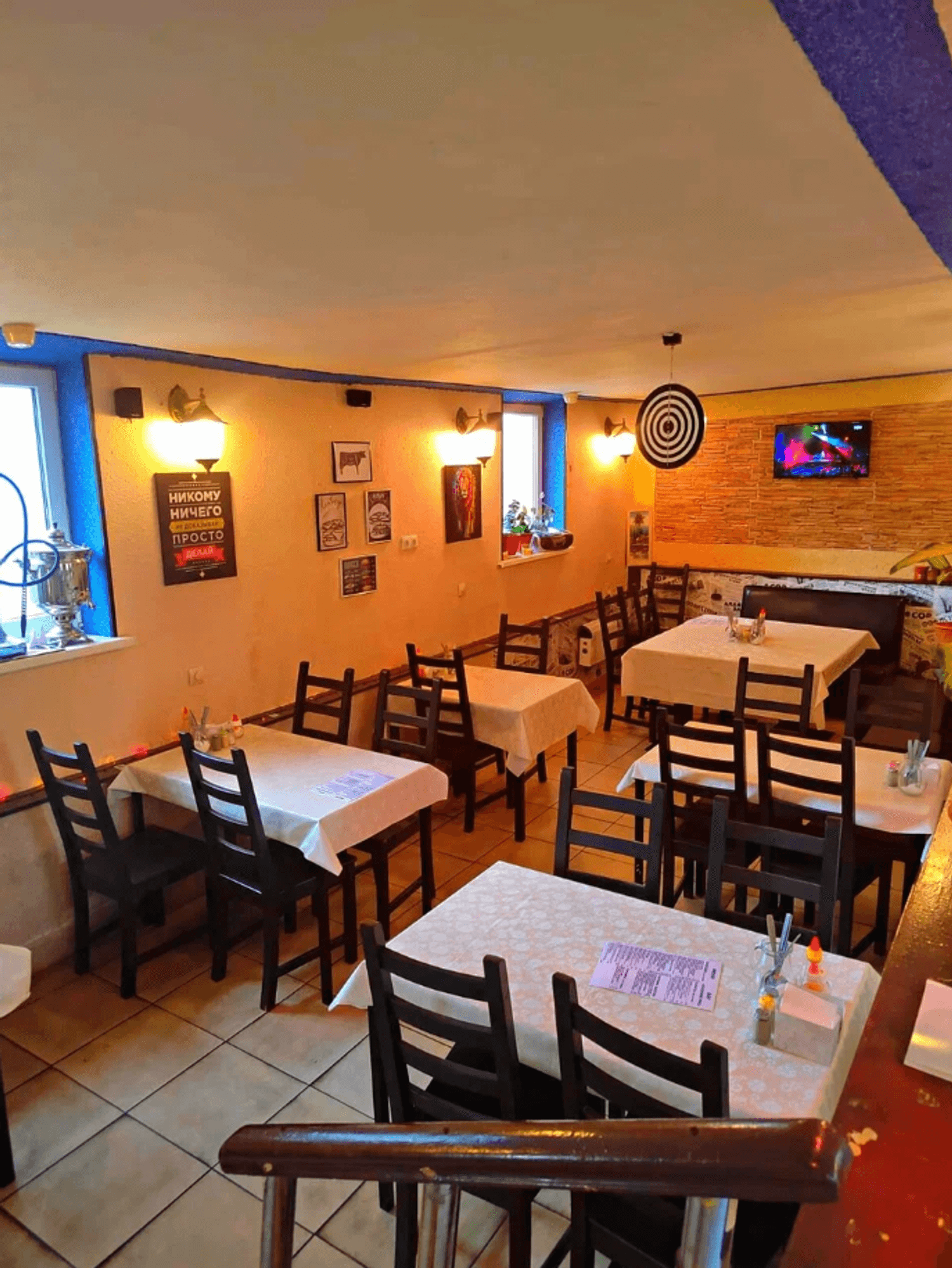 Атмосфера. Интерьер, выполненный в теплых осенних тонах с мягкими диванами и приглушенным светом, создает ощущение комфорта и уюта. Пространство здесь небольшое, но продуманное, благодаря чему будет одинаково комфортно и просто побеседовать, и расслабиться в одиночестве, и даже отметить небольшой праздник.