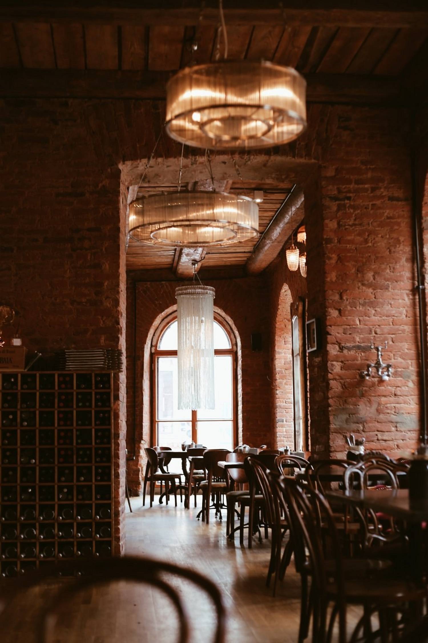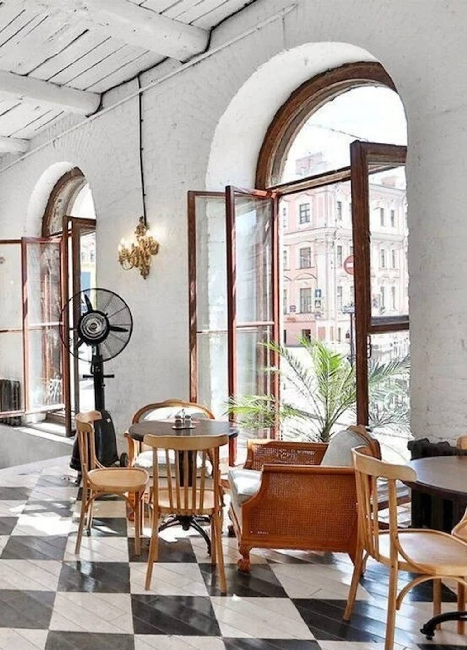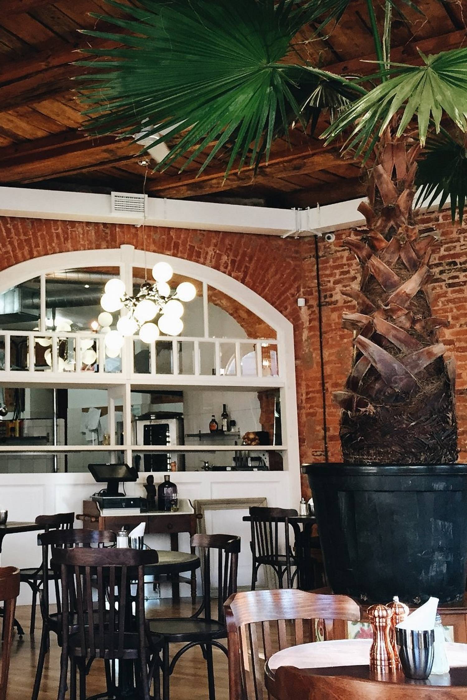Атмосфера. Гостям предлагают расположиться в просторном зале с панорамными окнами и необычными арт-объектами. Высокие потолки и изящные арочные окна напоминают о времени, когда здание было доходным домом. Белые стены и «шахматные» полы здесь сочетаются с роскошными люстрами, а светлый интерьер дополняют кирпичные стены и зеленые растения.