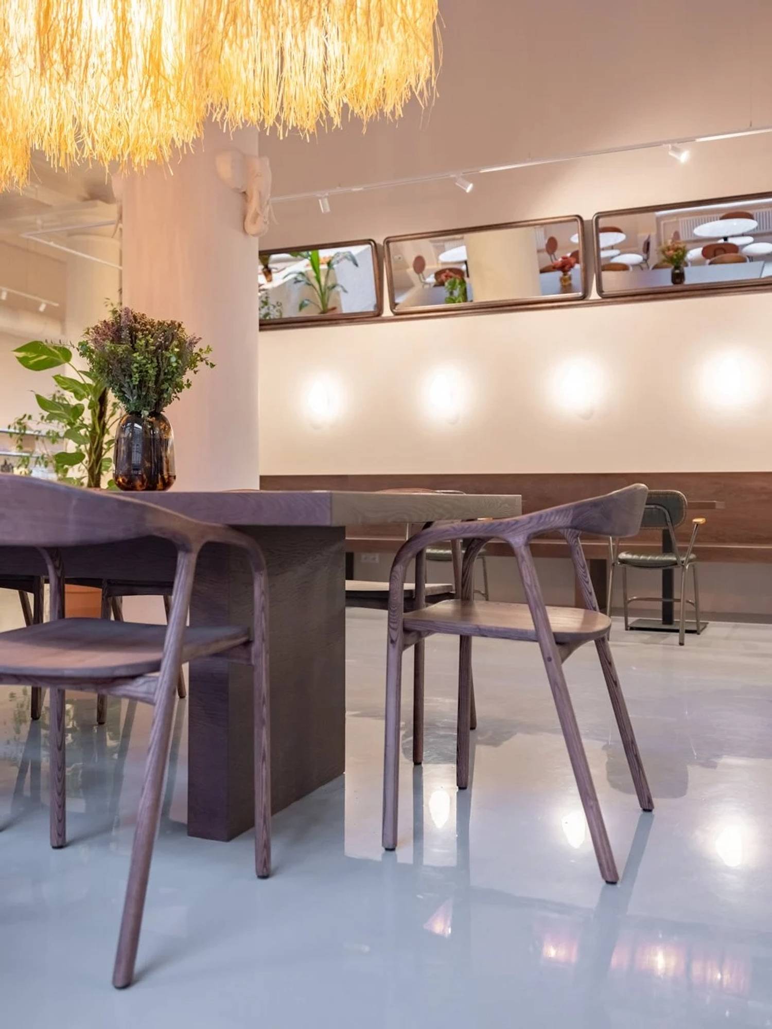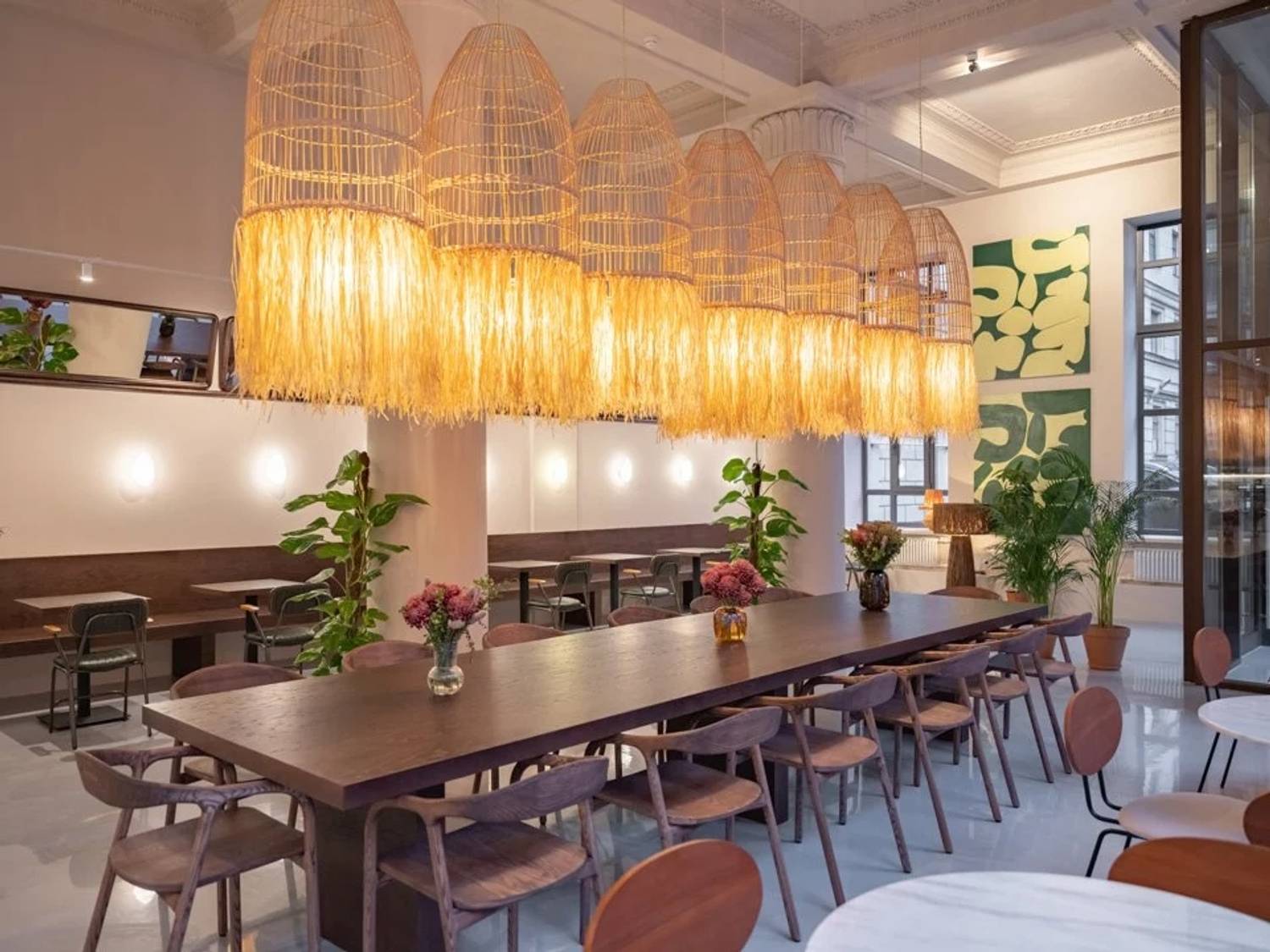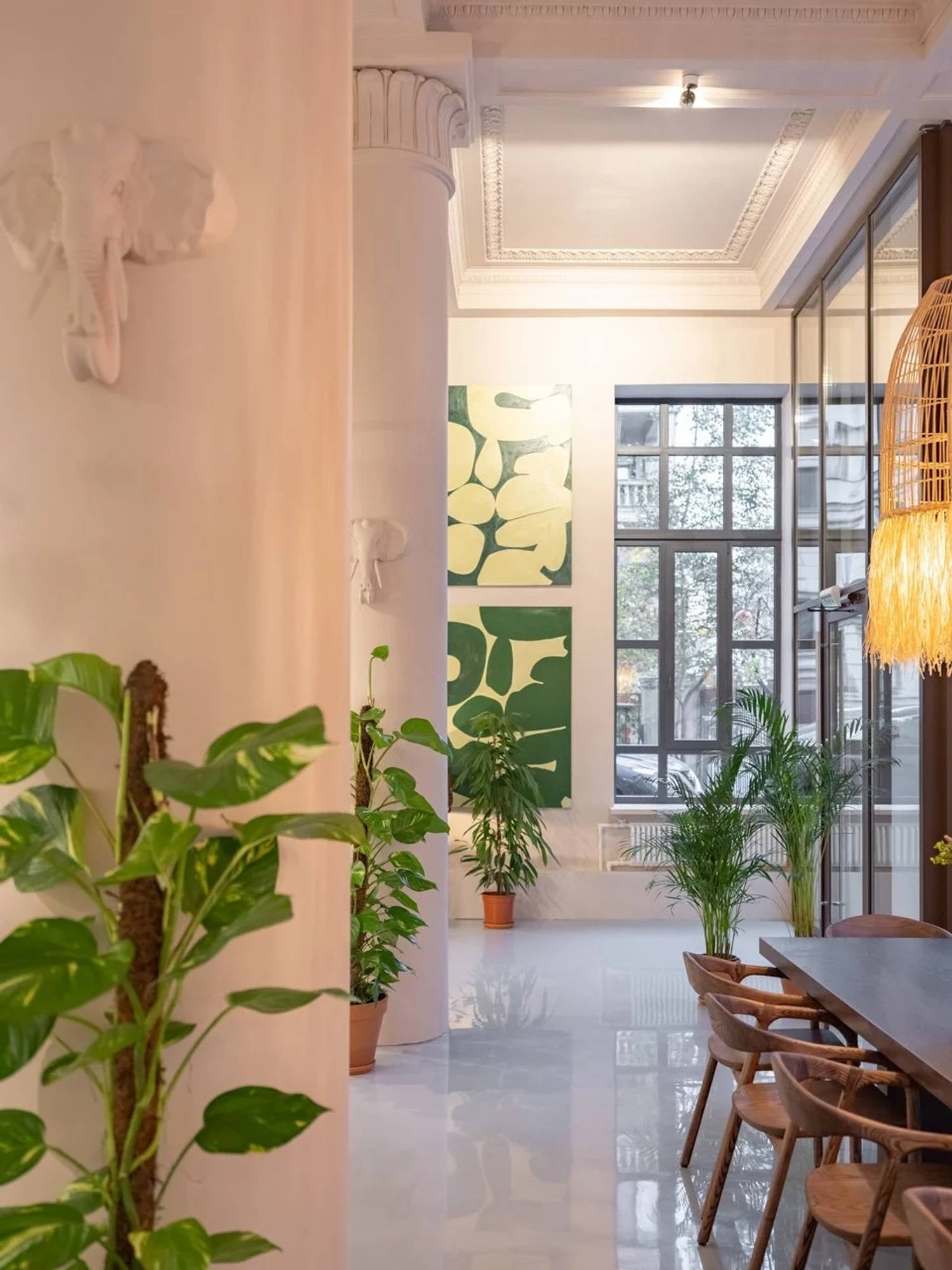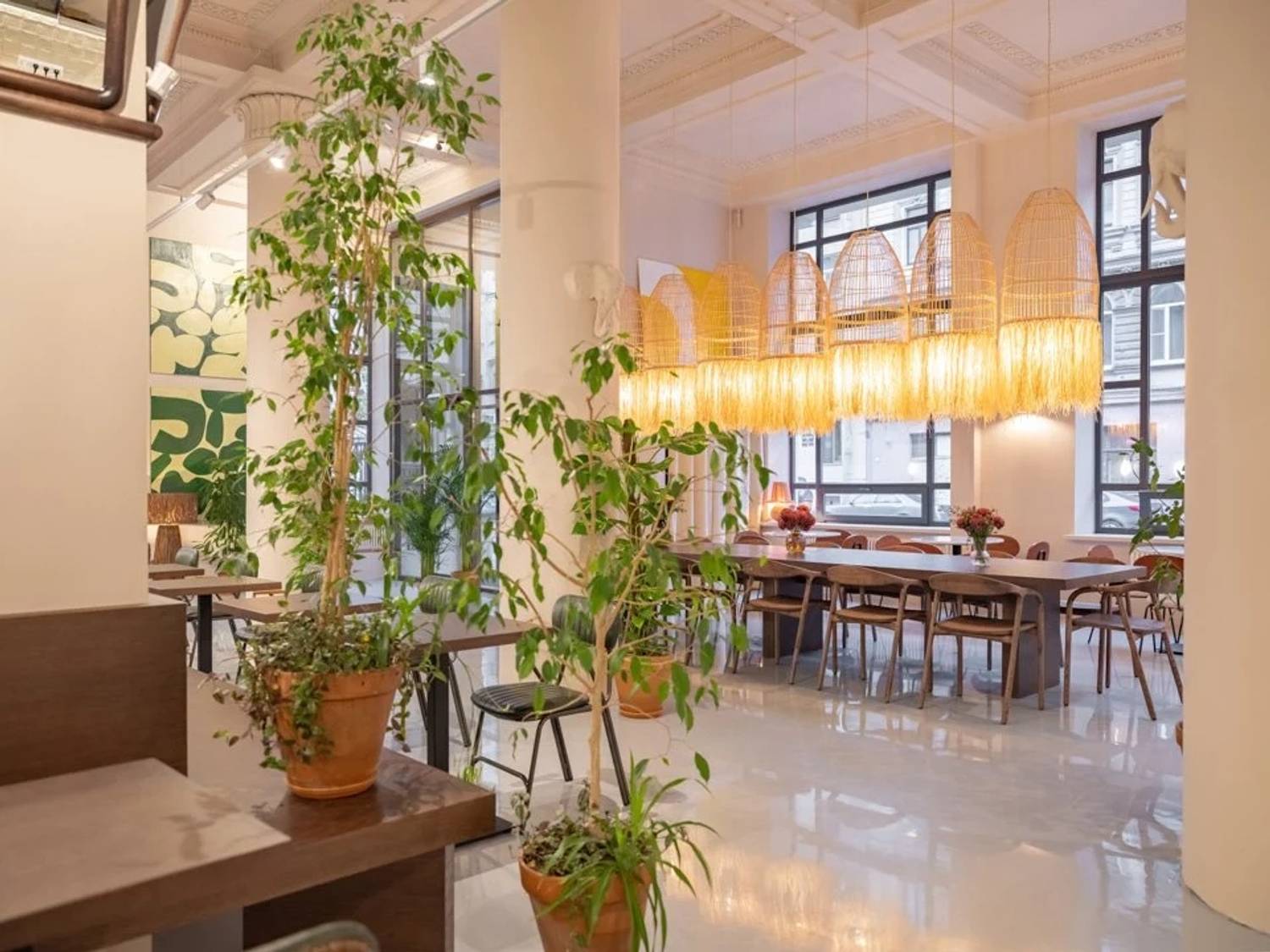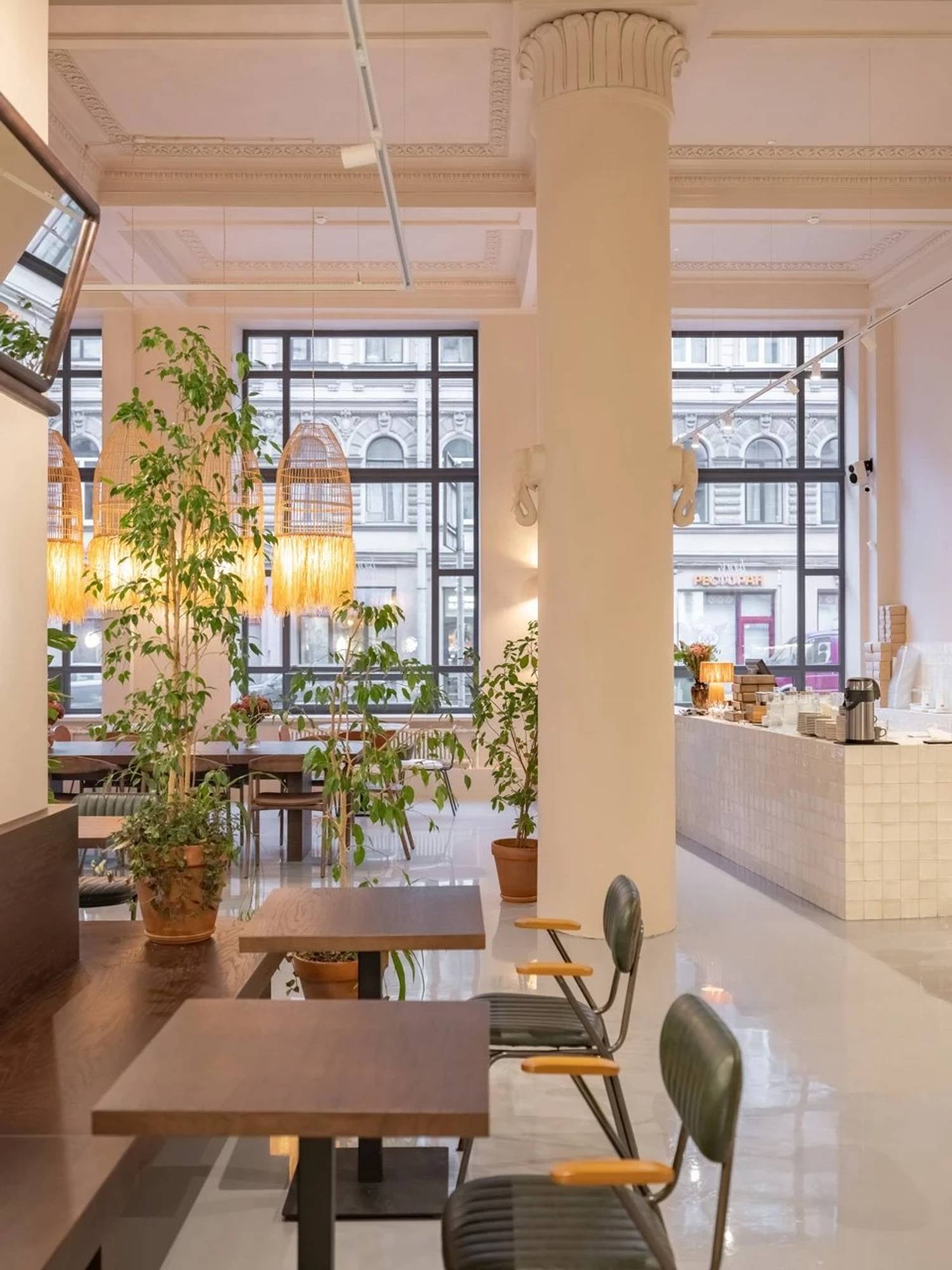 Атмосфера. Пространство получилось легким и оригинальным: высокие потолки, панорамная входная группа, монументальные колонны с барельефами животных. Интерьер оформлен в пастельных тонах с живыми растениями, ротанговыми светильниками и абажурами, мраморными столиками у окон.