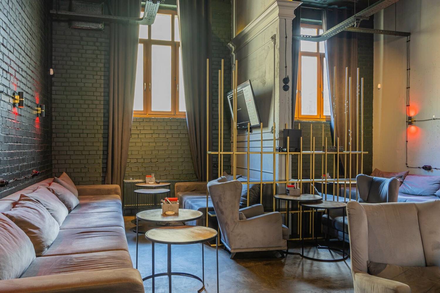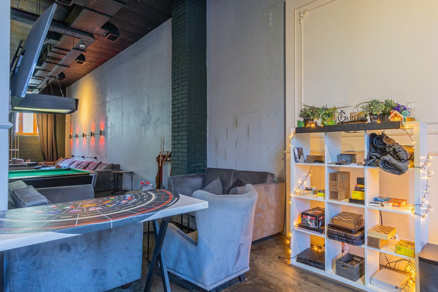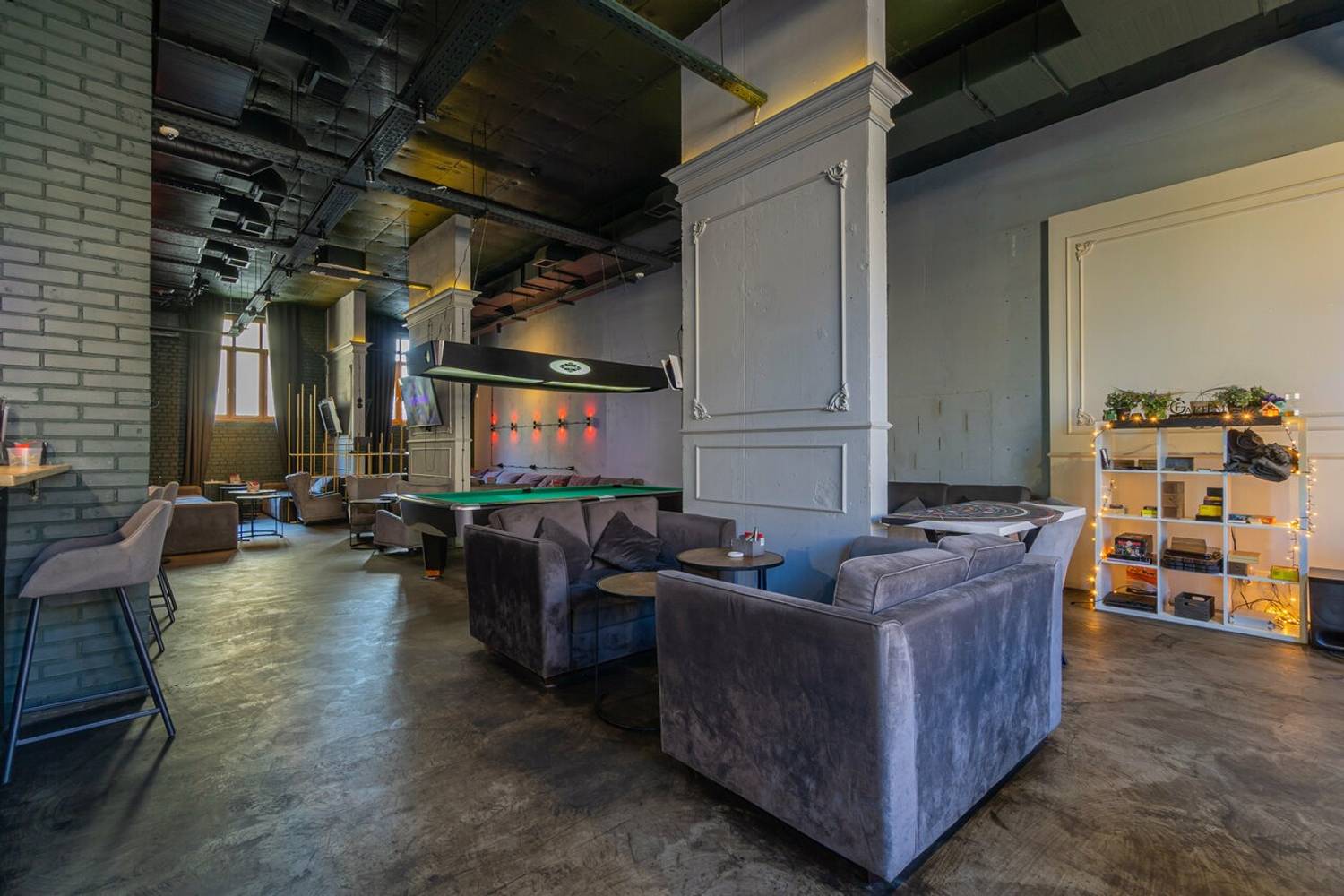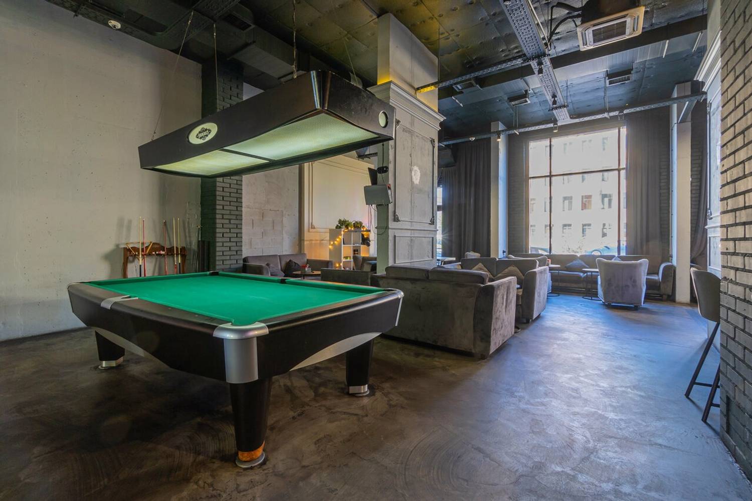 Атмосфера. Пространство с 4-метровыми потолками и панорамными окнами в темной палитре с серой кирпичной стойкой. Есть зона для активного отдыха с бильярдом, настольными играми и приставками.