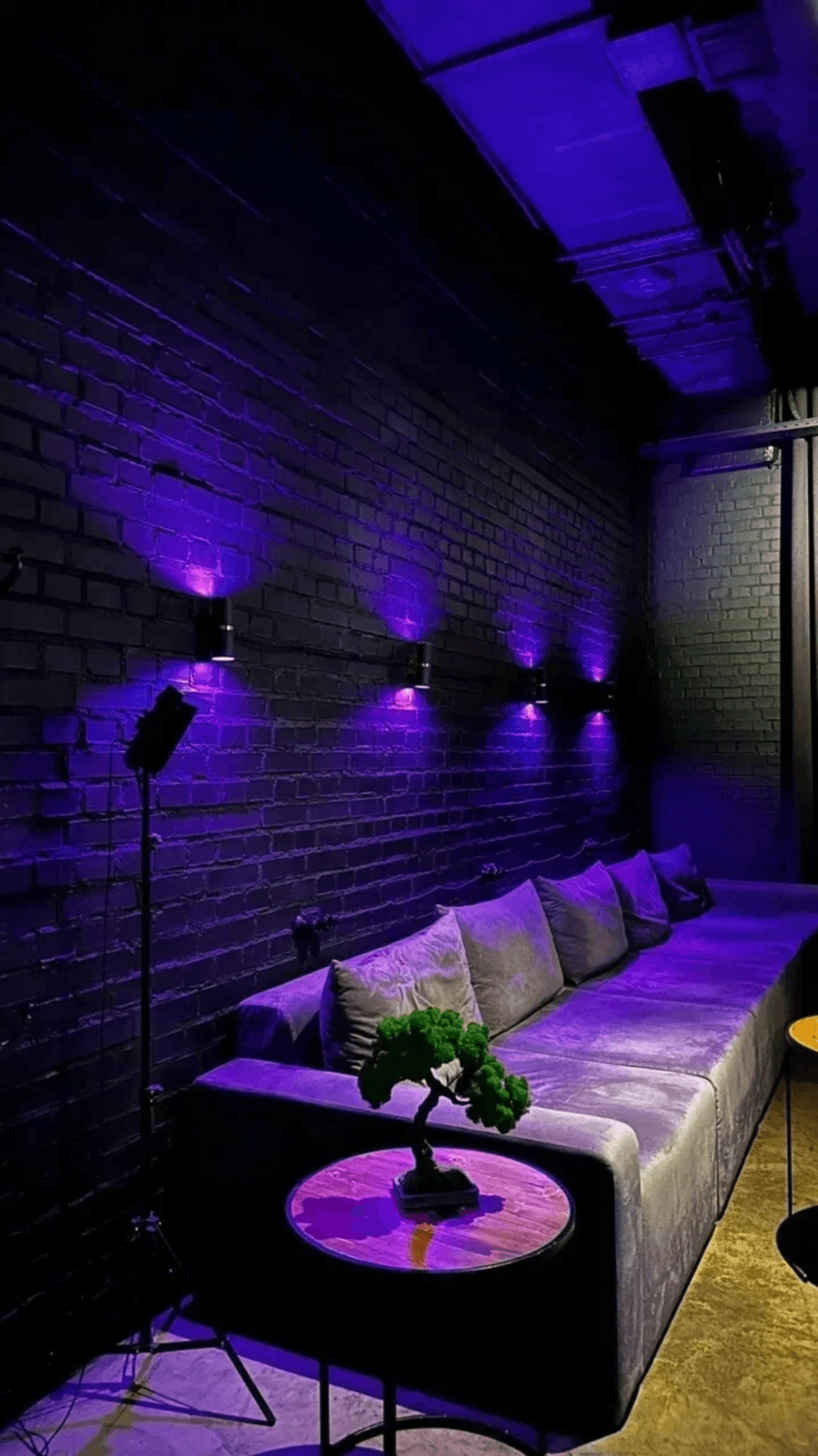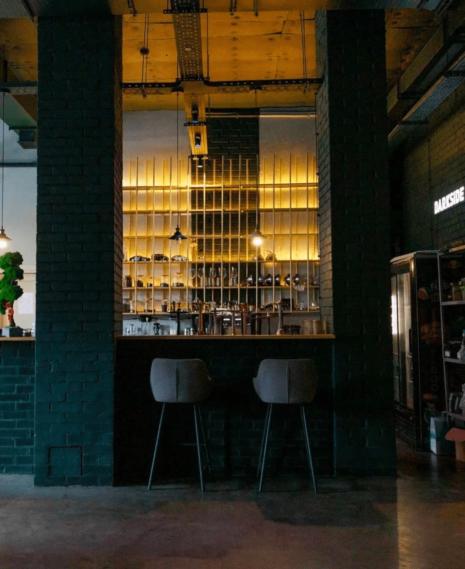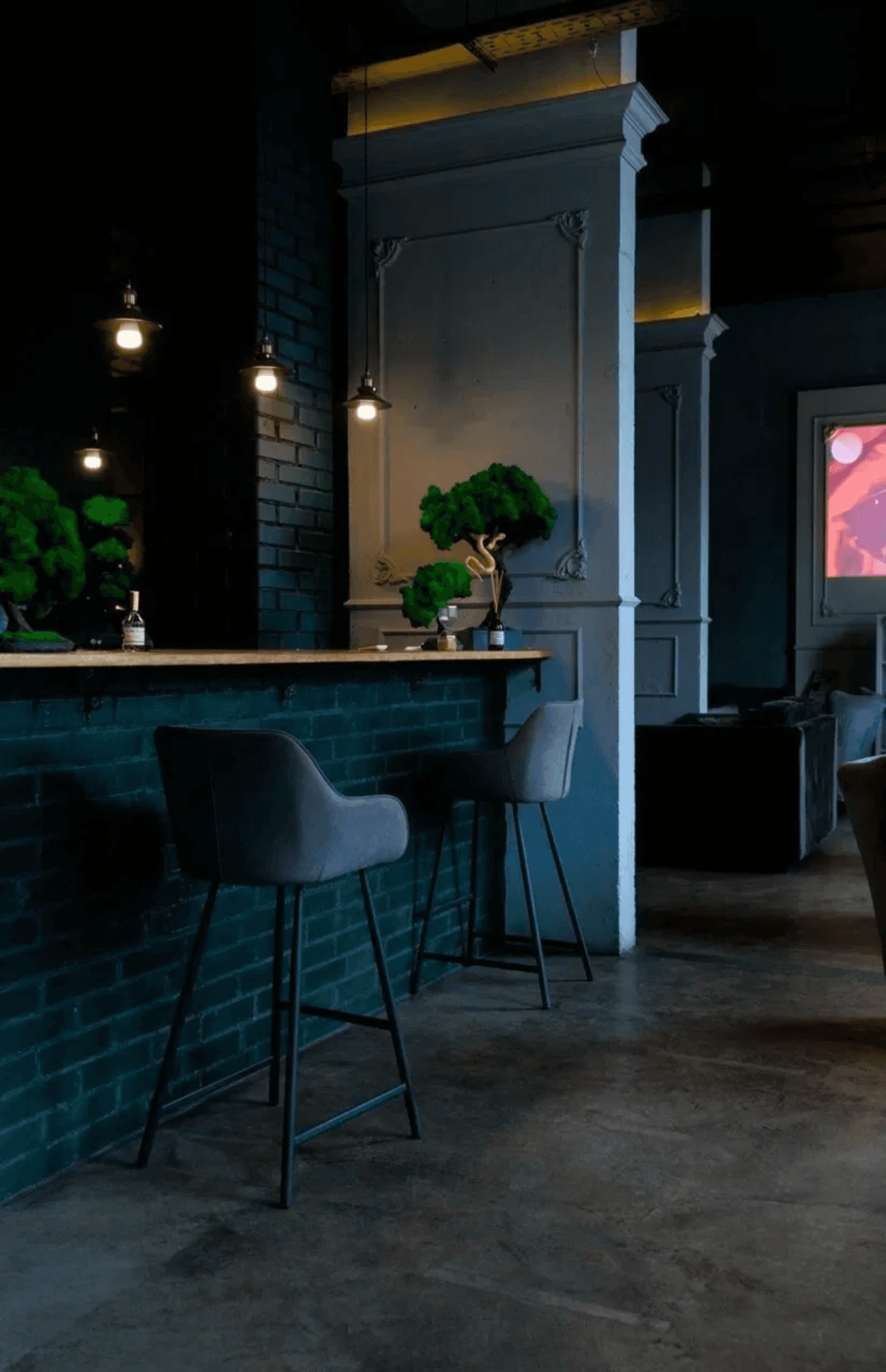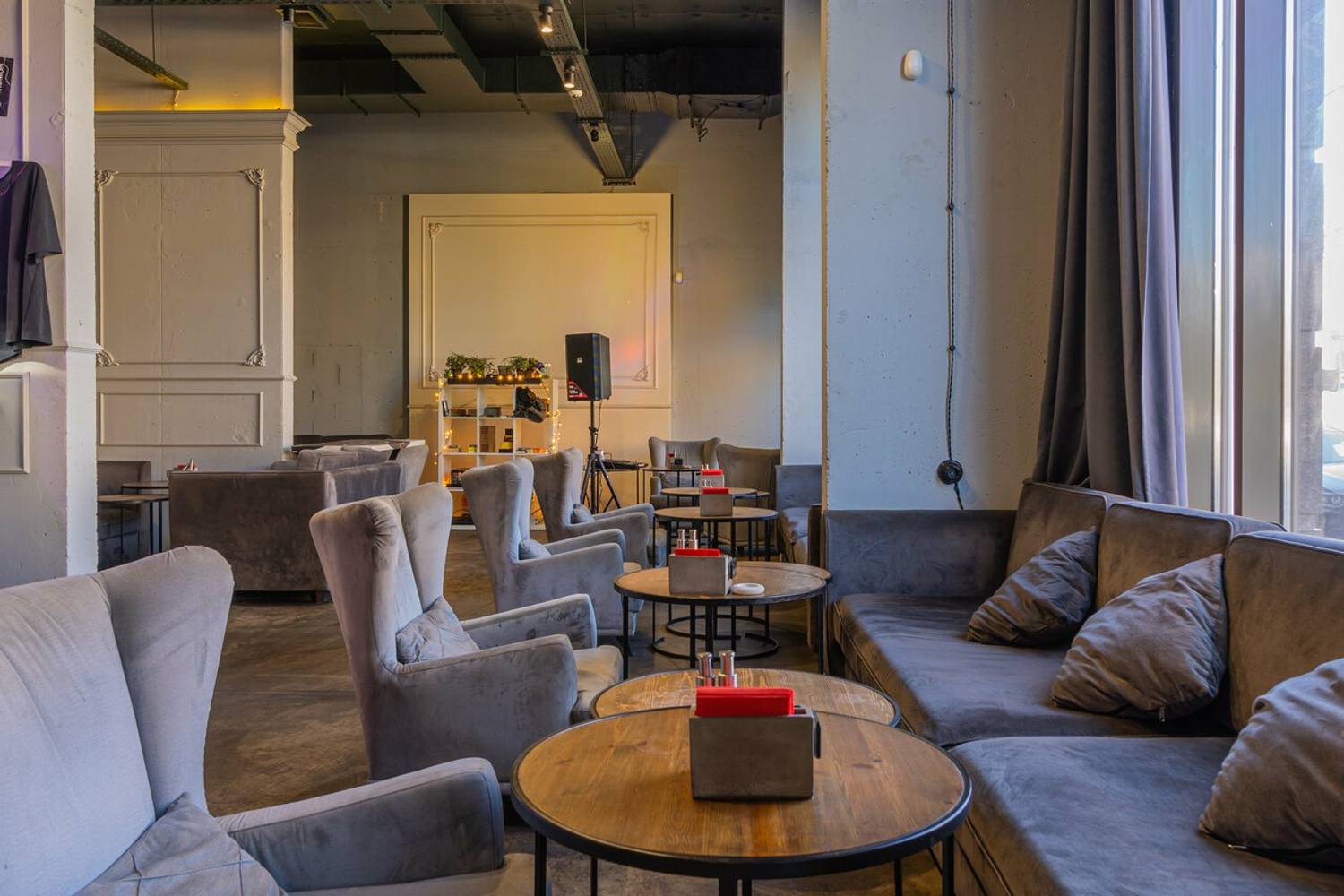 Атмосфера. Пространство с 4-метровыми потолками и панорамными окнами в темной палитре с серой кирпичной стойкой. Есть зона для активного отдыха с бильярдом, настольными играми и приставками.