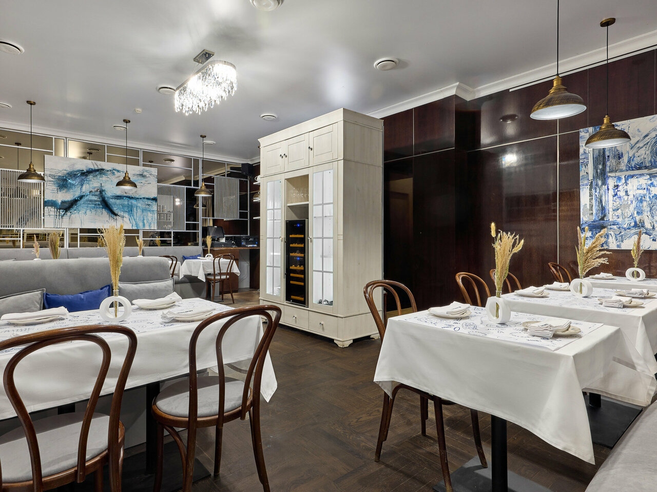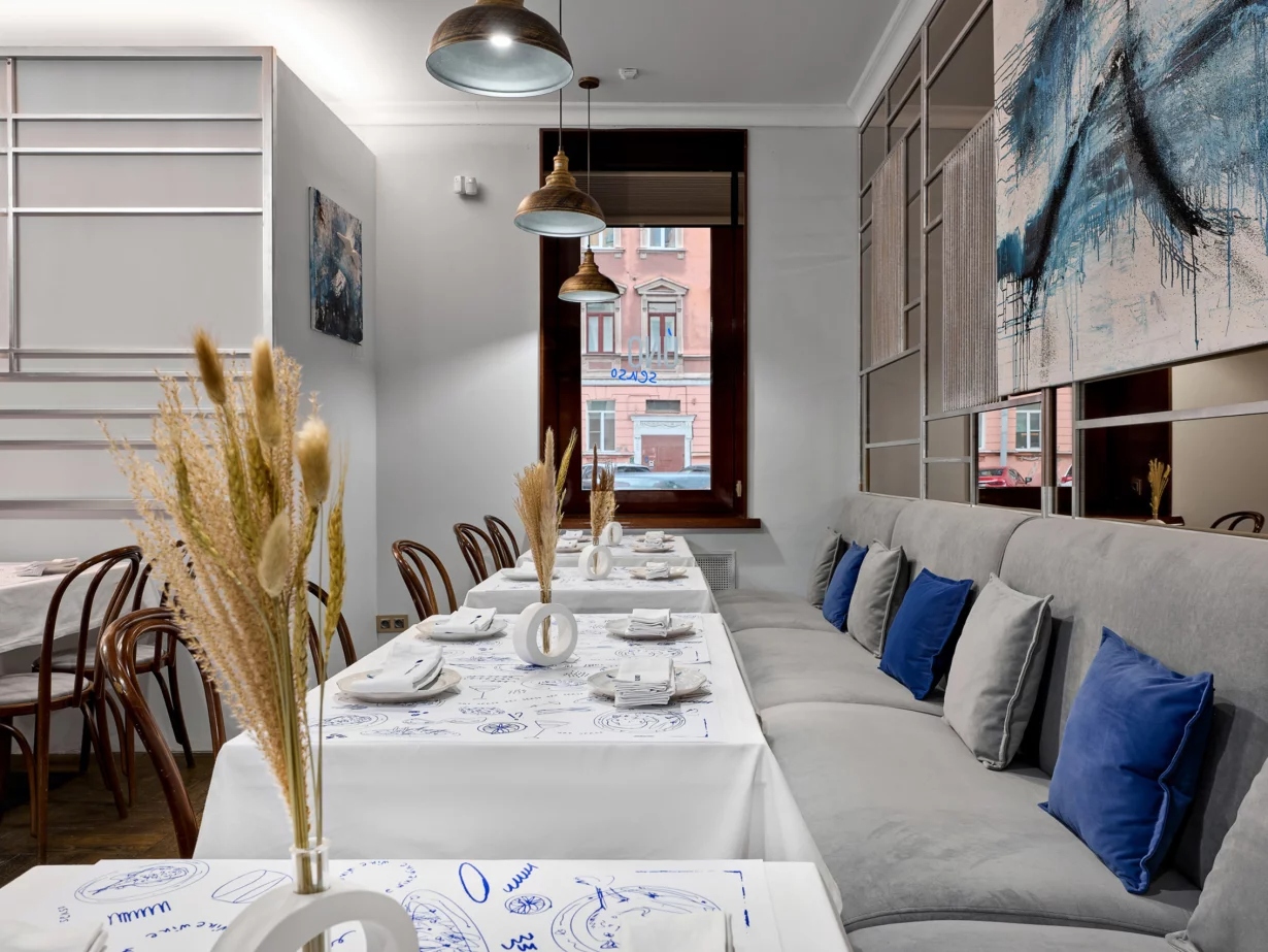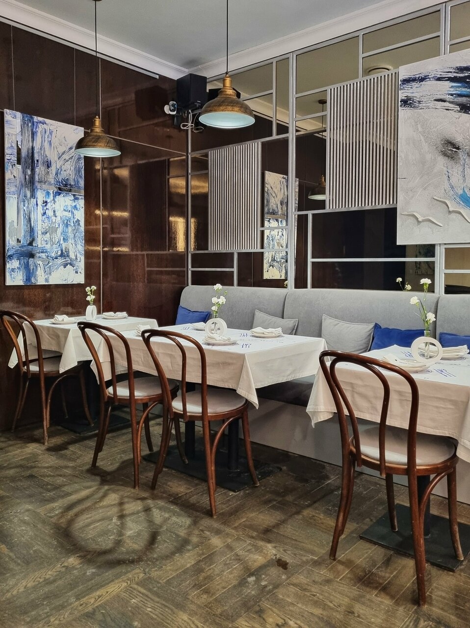 Атмосфера. Пространство здесь наполнено воздушностью и элегантностью: белоснежные скатерти контрастируют с темным деревом, а морская тема угадывается в голубых акцентах и акварелях. Легкость интерьера и тихое расположение между Таврическим садом и Смольным создают ощущение уединенного уголка где-то в Южной Европе.