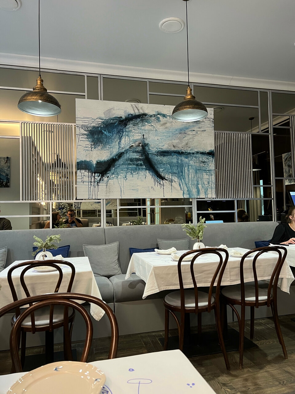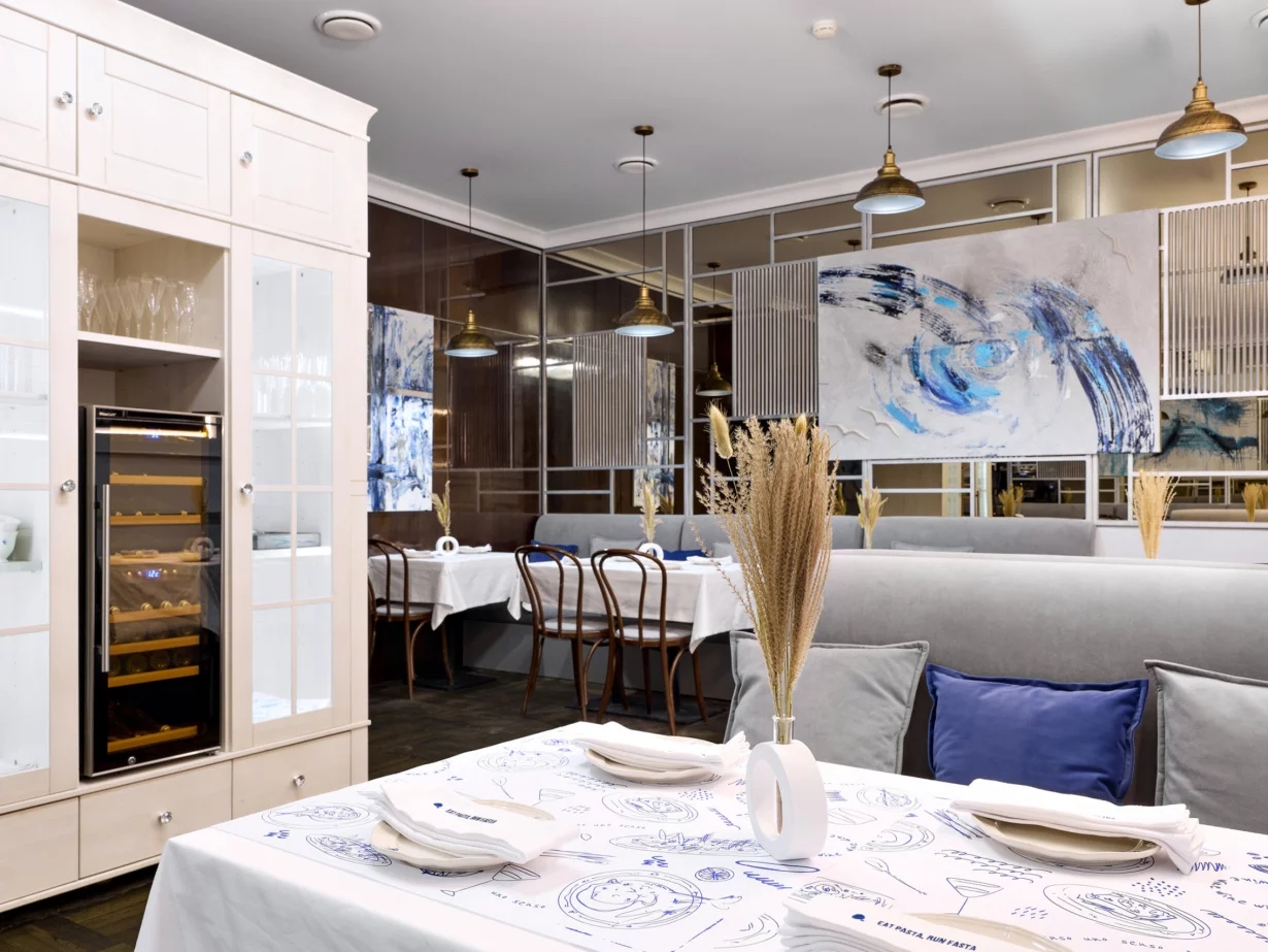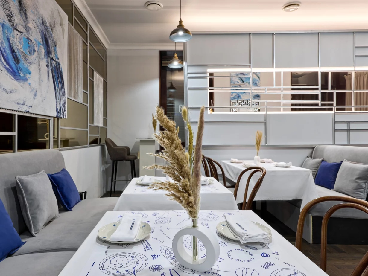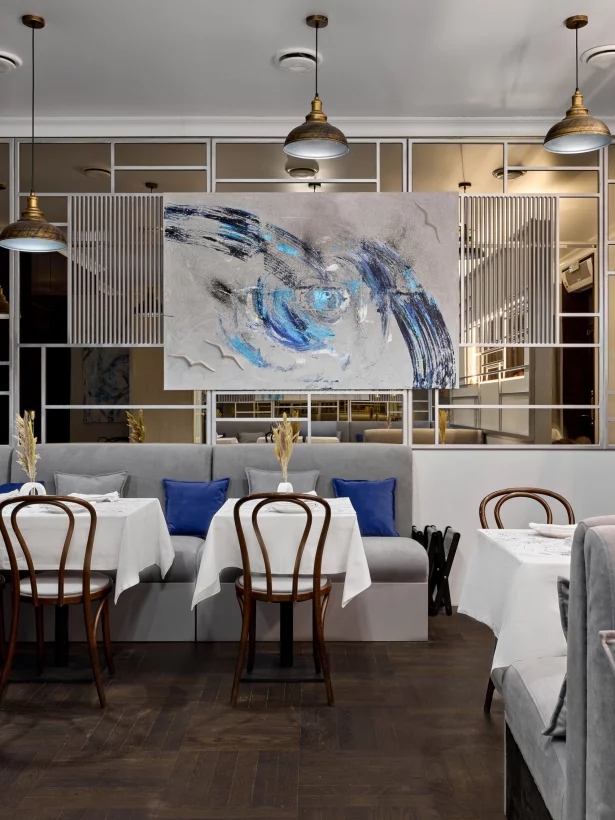 Атмосфера. Пространство здесь наполнено воздушностью и элегантностью: белоснежные скатерти контрастируют с темным деревом, а морская тема угадывается в голубых акцентах и акварелях. Легкость интерьера и тихое расположение между Таврическим садом и Смольным создают ощущение уединенного уголка где-то в Южной Европе.