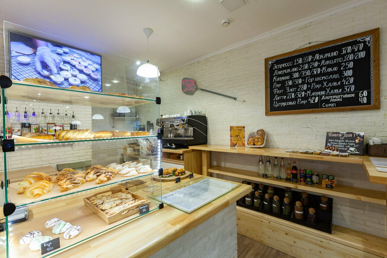 Атмосфера. Лаконичный интерьер: черно-белые картины в строгих рамах, и настенные часы создают ощущение европейской кафетерии. На стеклянных витринах выкладывают десерты и выпечку.