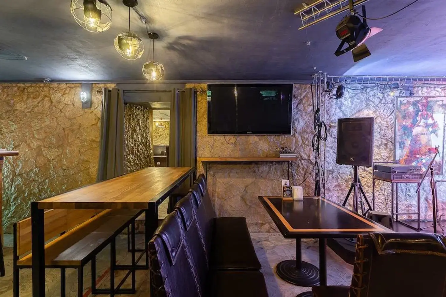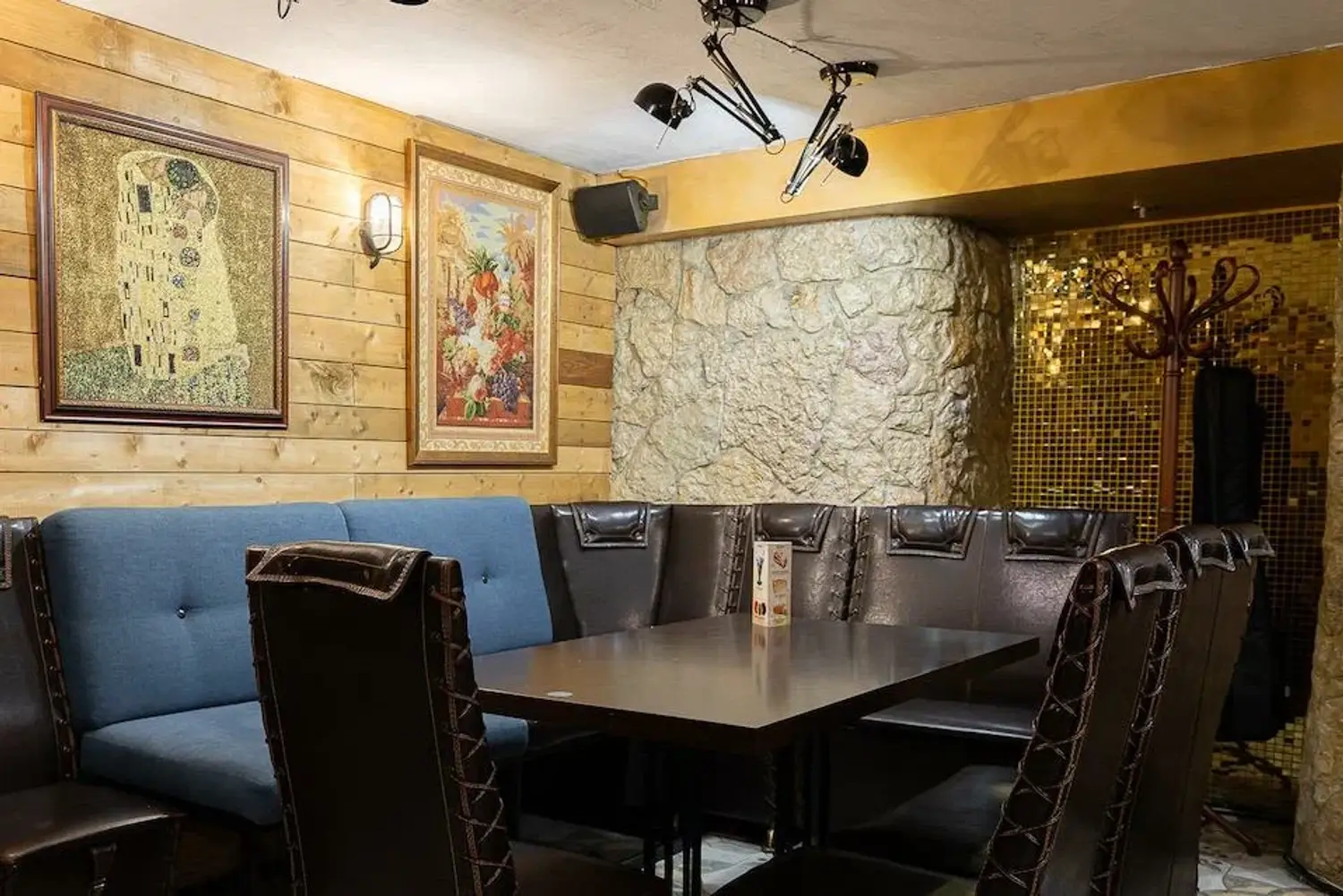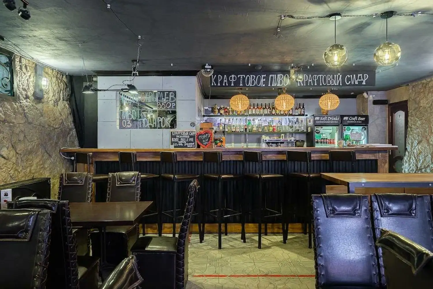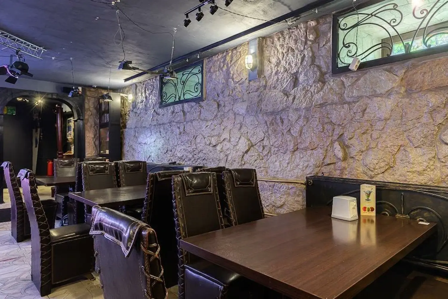 Атмосфера. Каменные стены, массивные деревянные столы и кожаные диваны создают атмосферу европейского паба, а кованые элементы и приглушенное освещение добавляют пространству брутальный характер. Зонирование позволяет одновременно проводить концерты, стендапы и спортивные трансляции.