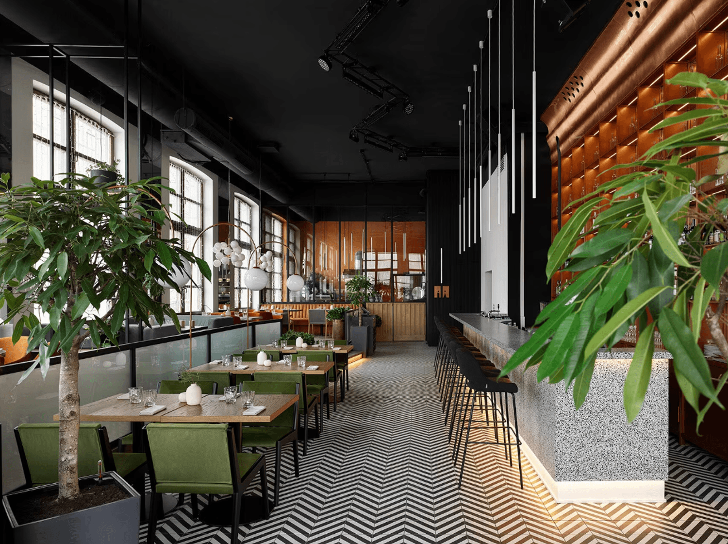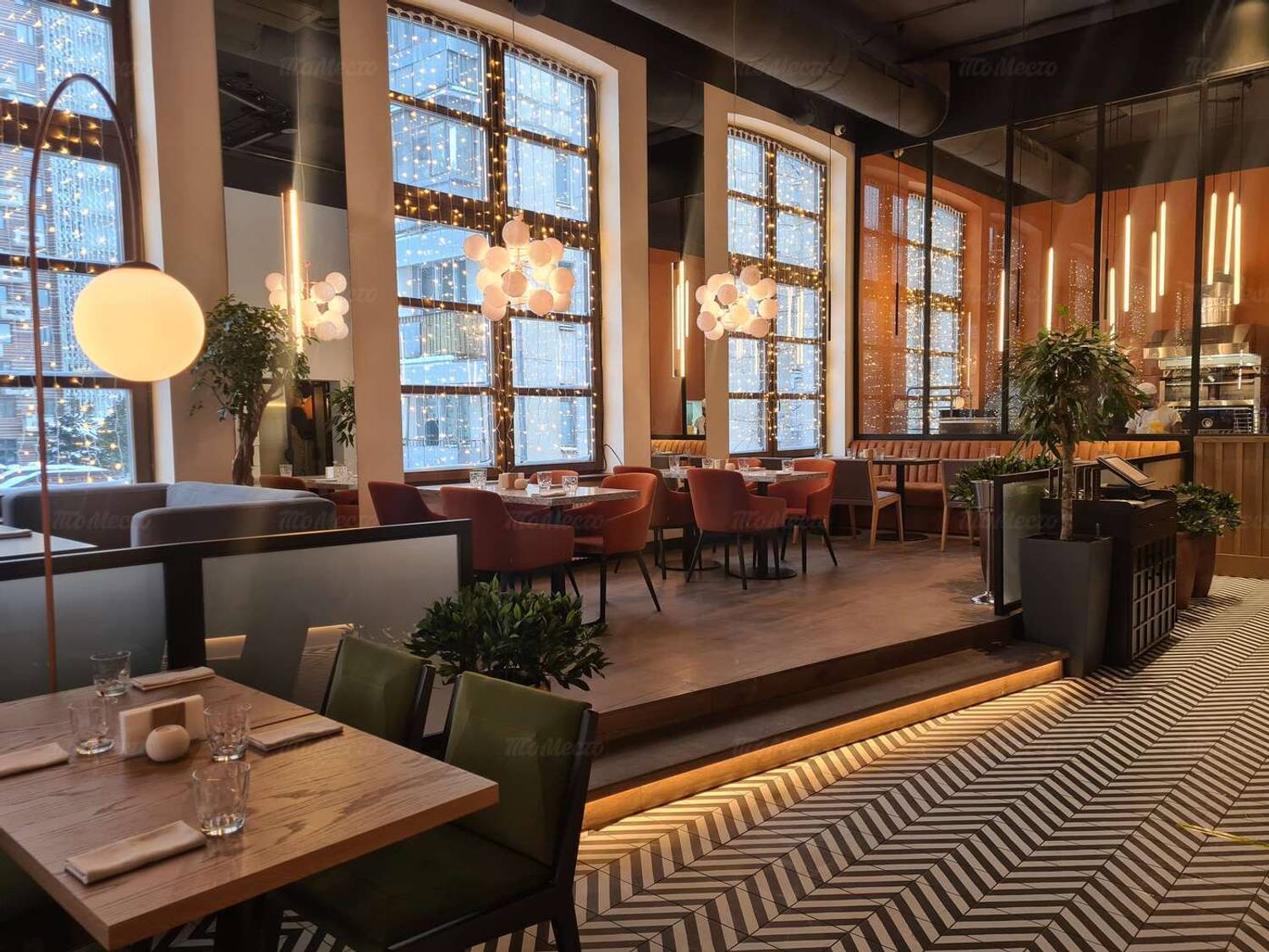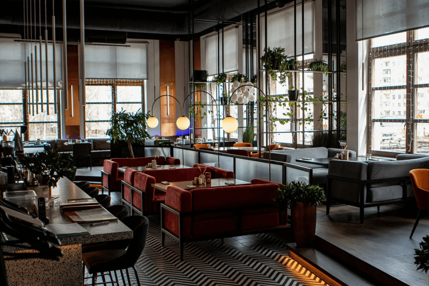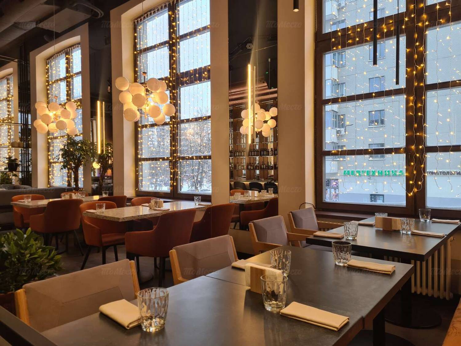 Атмосфера. Пространство в теплых тонах итальянского юга — терракотовых, оливковых и оранжевых — разделено на несколько зон: уютные диваны у панорамных окон, мраморная барная стойка и камерный зал с приглушенным светом. Оливковые деревья в кадках и оригинальные светильники в форме дисков дополняют ощущение солнечной Италии.