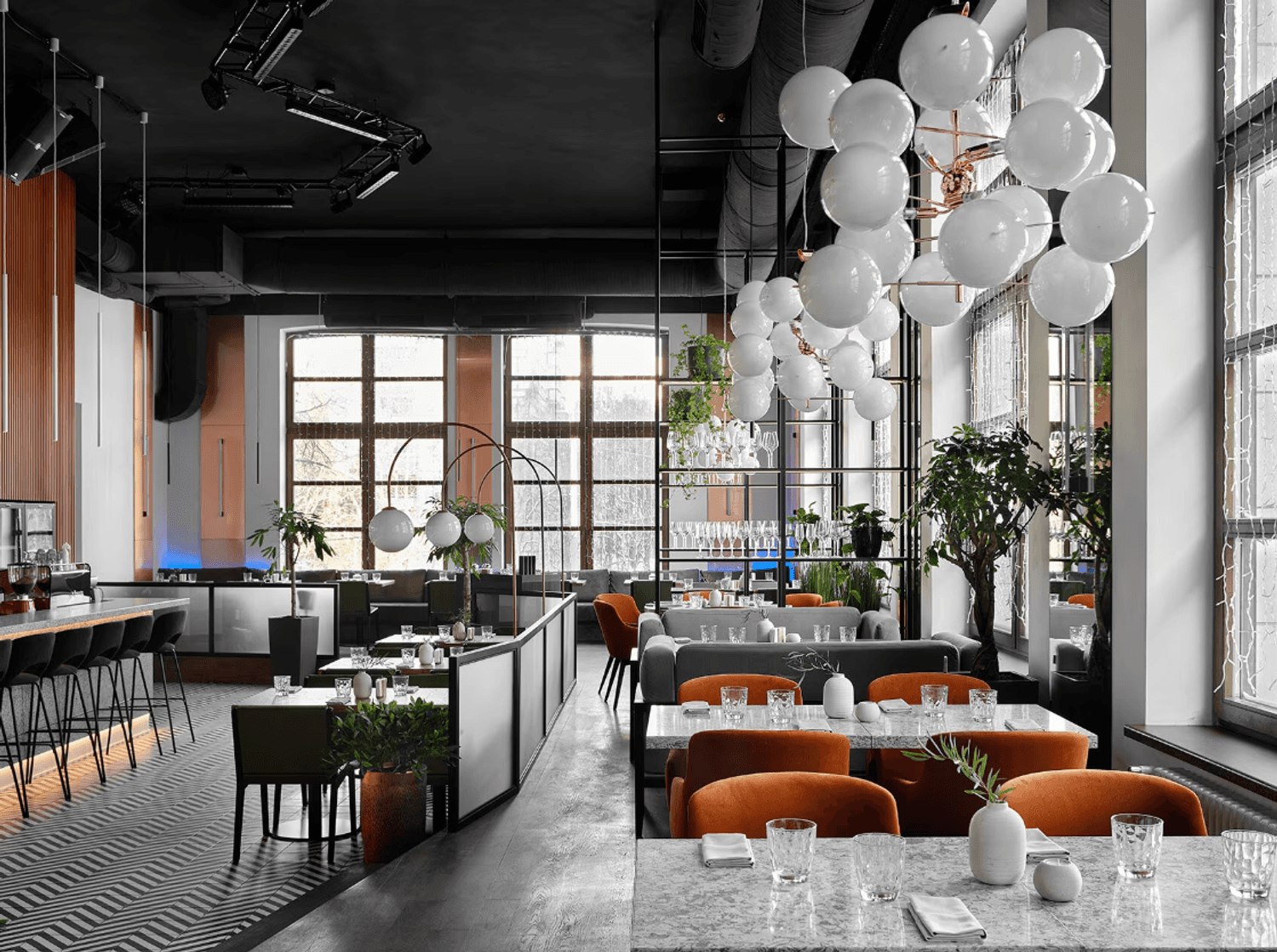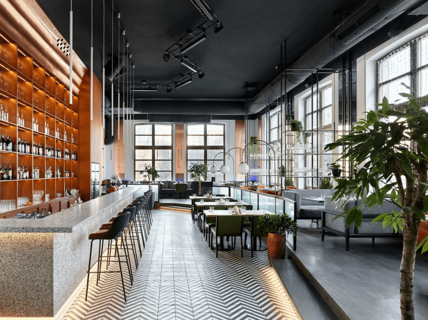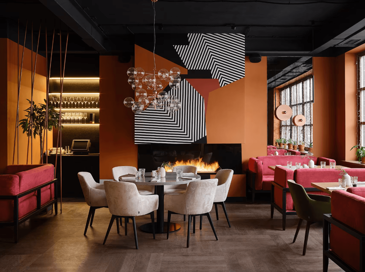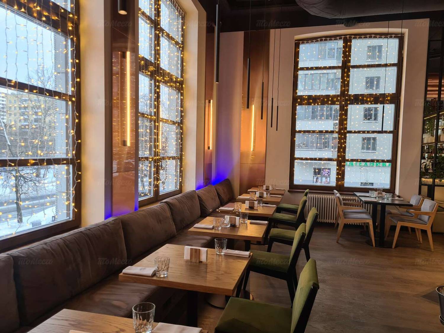 Атмосфера. Пространство в теплых тонах итальянского юга — терракотовых, оливковых и оранжевых — разделено на несколько зон: уютные диваны у панорамных окон, мраморная барная стойка и камерный зал с приглушенным светом. Оливковые деревья в кадках и оригинальные светильники в форме дисков дополняют ощущение солнечной Италии.