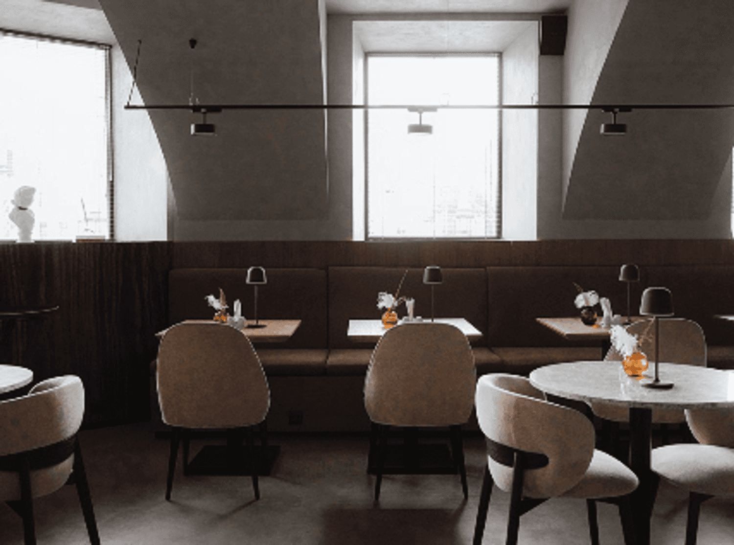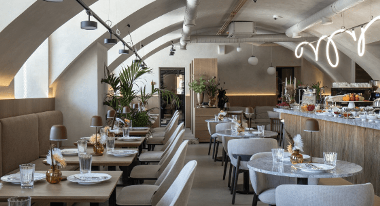 Интерьер ресторана — стильный и сдержанный, выполнен в теплых бежевых оттенках с добавлением живых растений. На завтрак здесь подают традиционные блинчики с икрой, каши на молоке или растительном молоке, скрэмбл с пармезаном и креветками, а также оригинальные блюда, такие как зеленая гречка с белыми грибами.