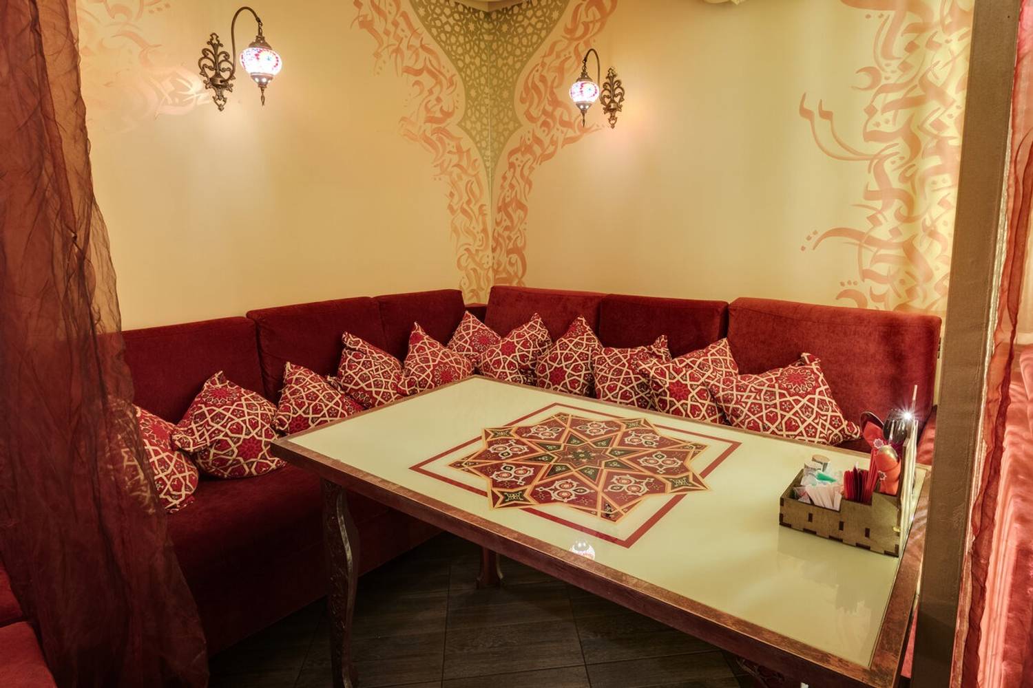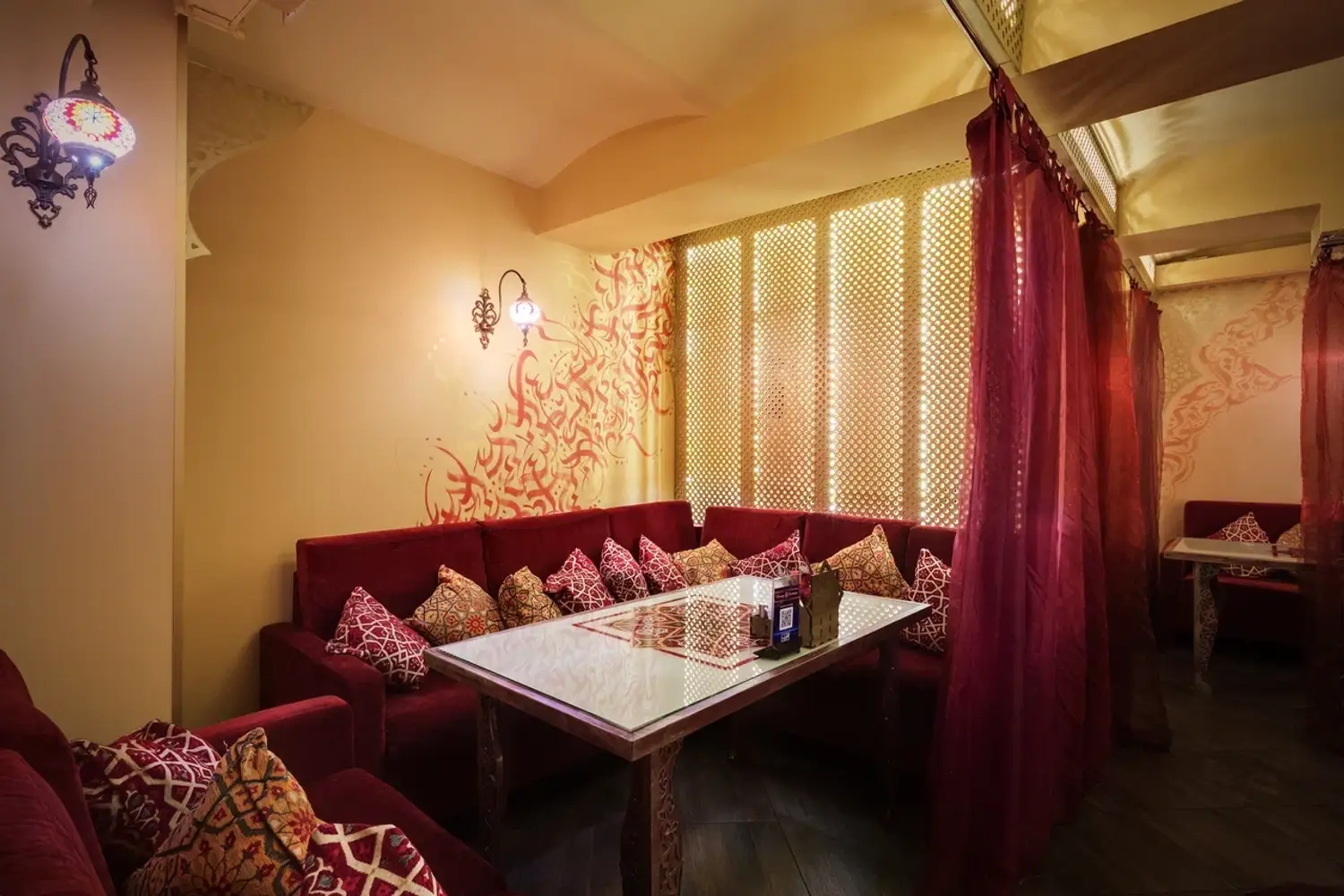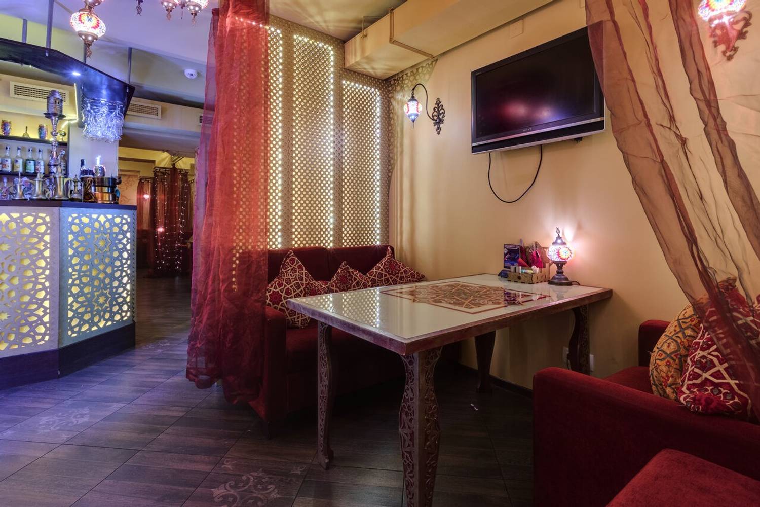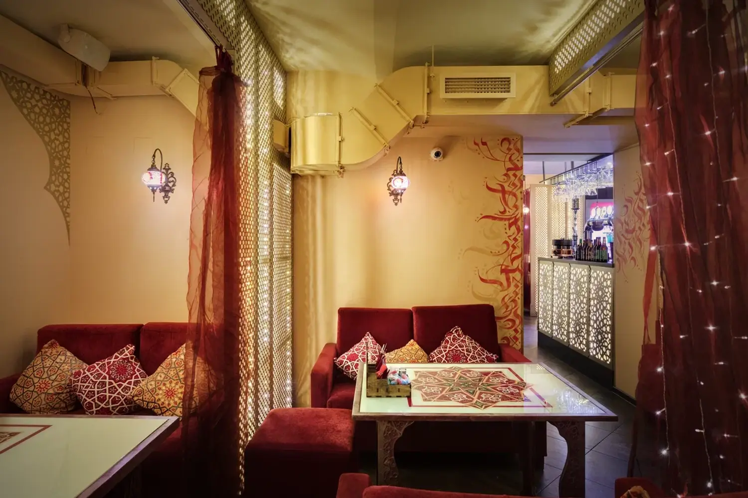 Атмосфера. Дизайн в стиле восточной сказки: ажурные люстры с цветными стеклами отбрасывают причудливые узоры, а алые ковры с традиционными орнаментами создают ощущение уюта шатра. Резная барная стойка с восточными мотивами и полупрозрачные перегородки из красной тюли обеспечивают обстановку для отдыха компанией.