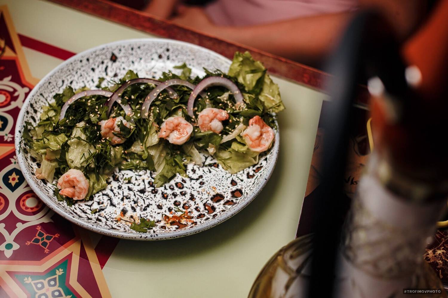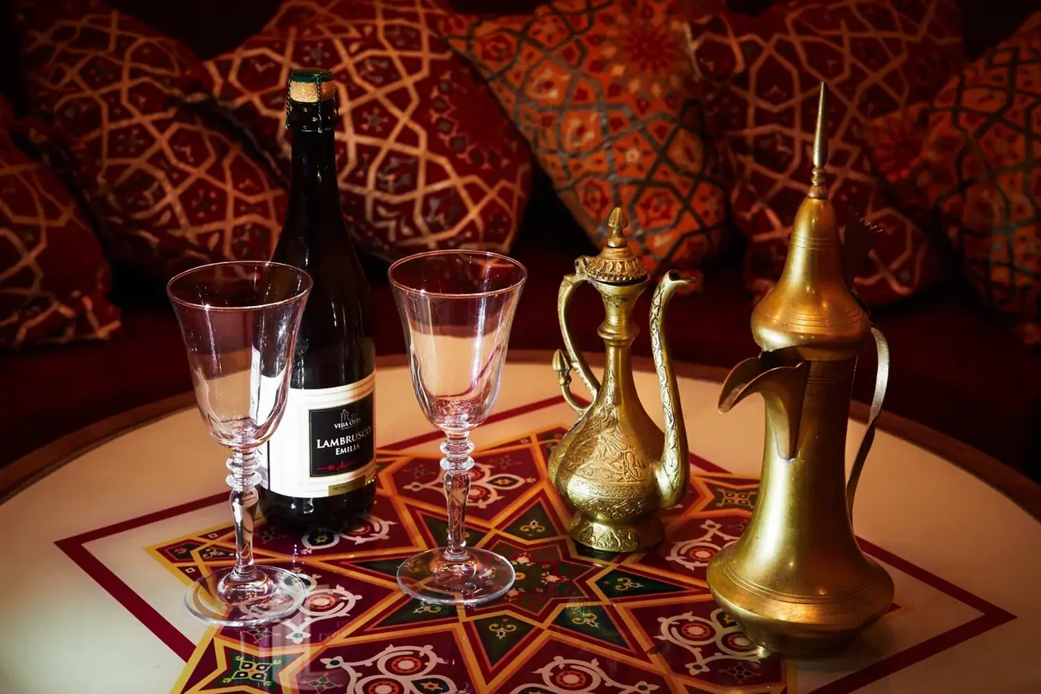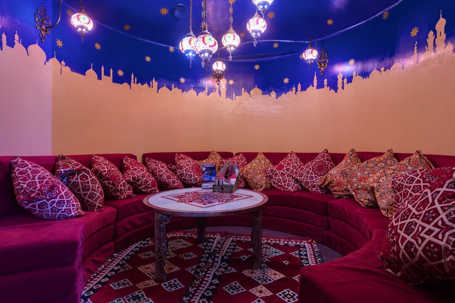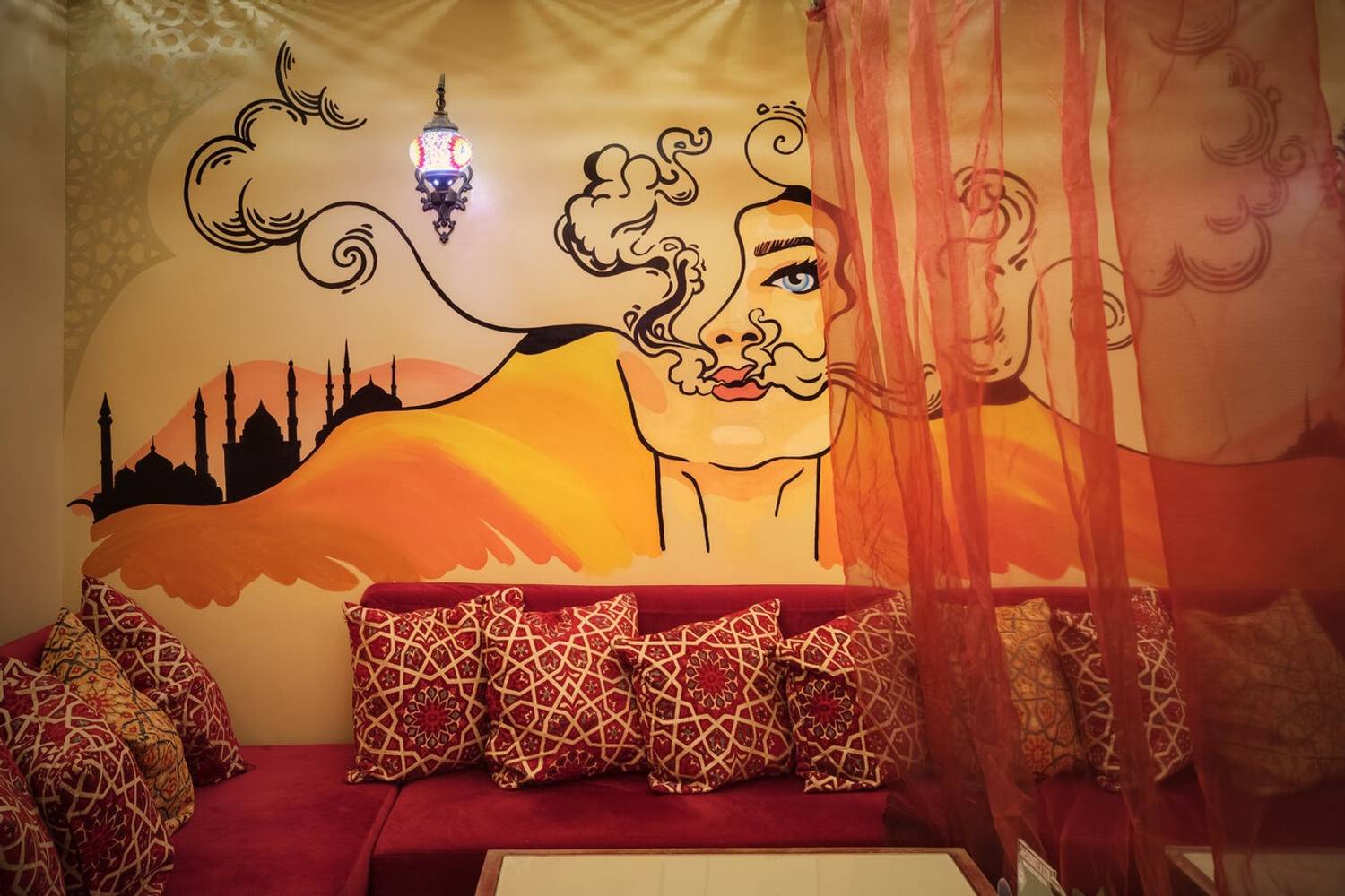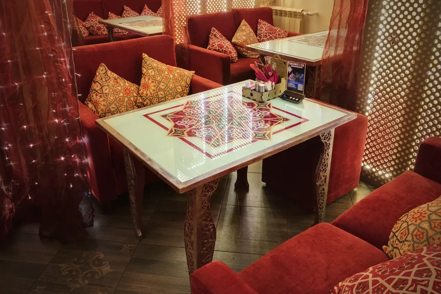 Атмосфера. Дизайн в стиле восточной сказки: ажурные люстры с цветными стеклами отбрасывают причудливые узоры, а алые ковры с традиционными орнаментами создают ощущение уюта шатра. Резная барная стойка с восточными мотивами и полупрозрачные перегородки из красной тюли обеспечивают обстановку для отдыха компанией.