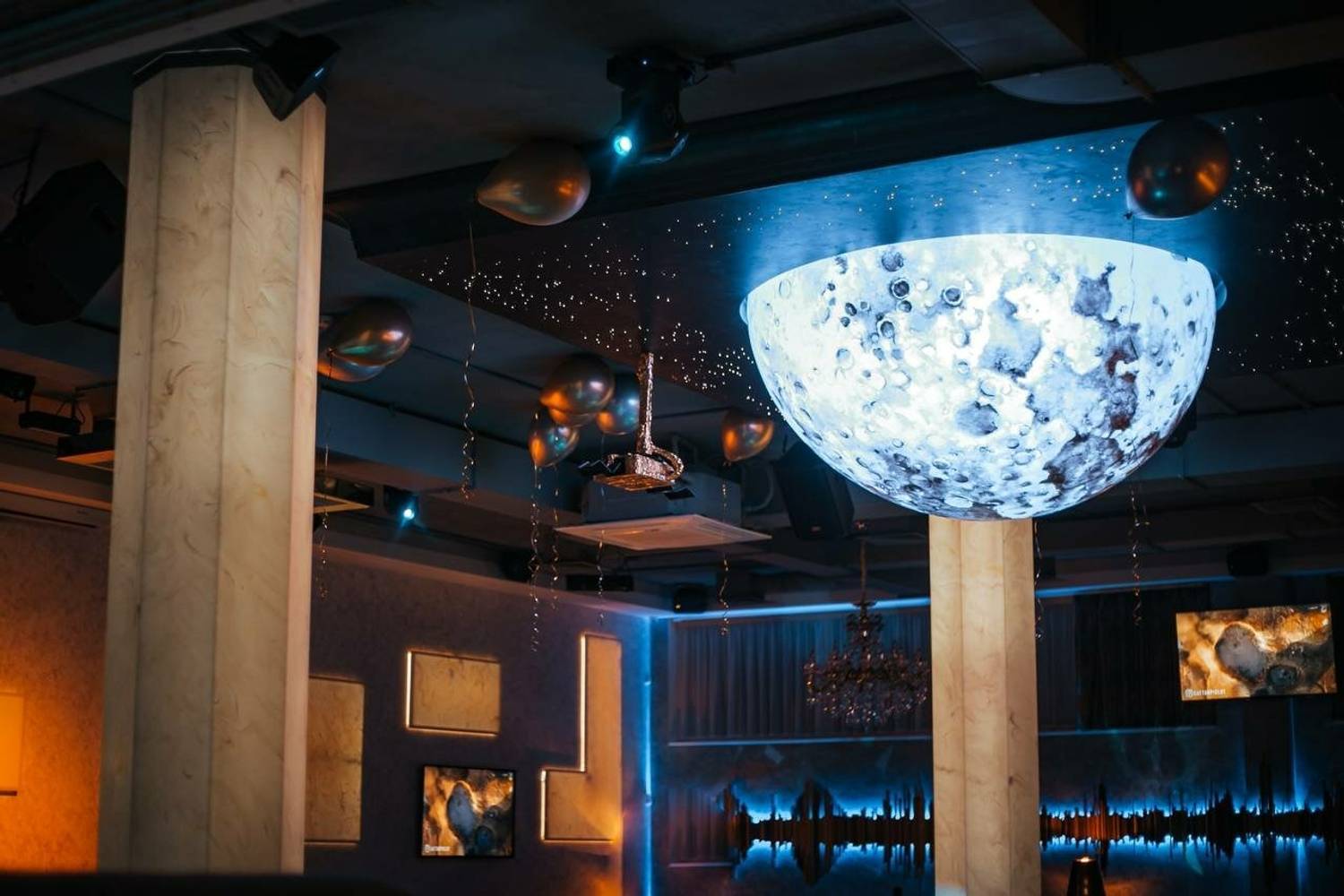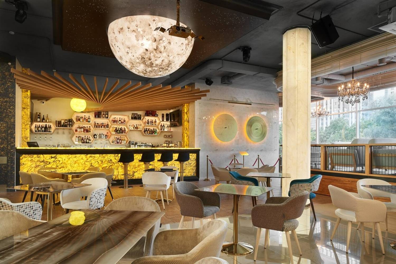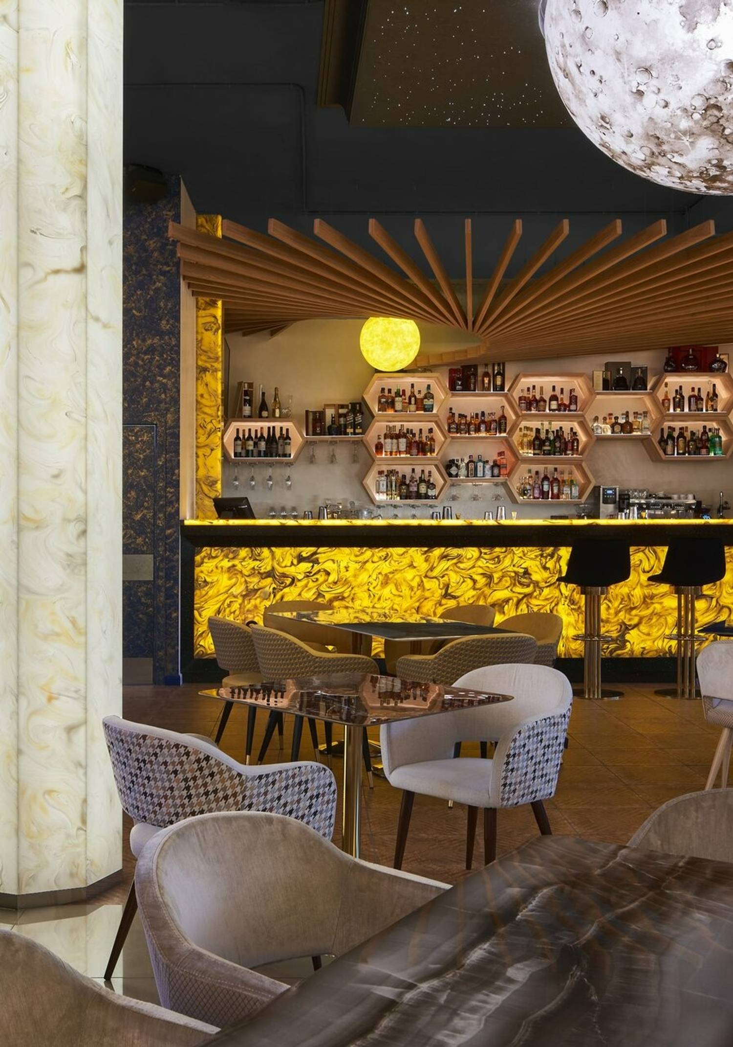 Атмосфера. Дизайн в концепции современного лаунжа с подвесной лампой в форме луны и белой светящейся колонной. Барная стойка с золотистой подсветкой дополнена полками-сотами с коллекцией алкоголя.