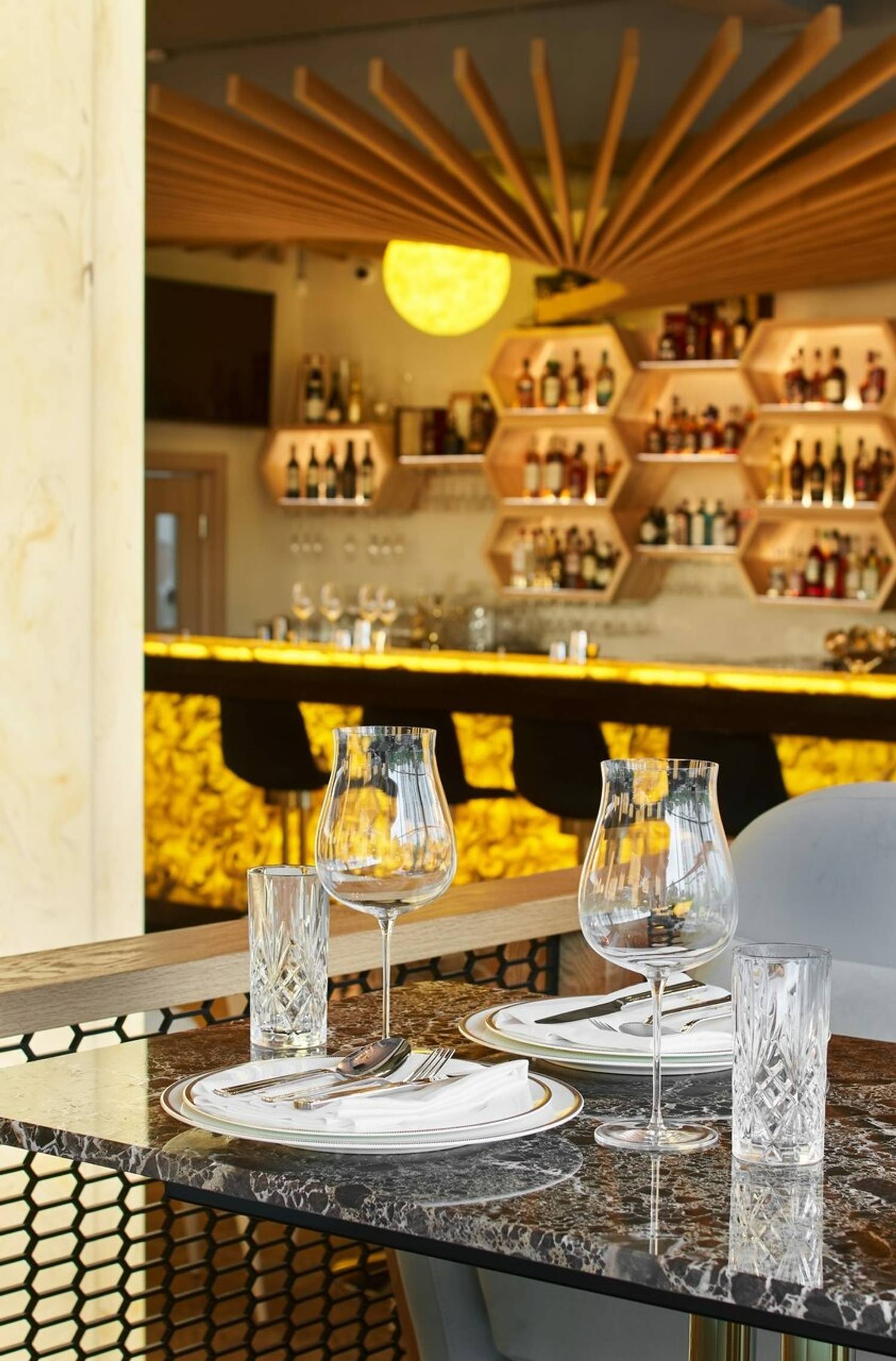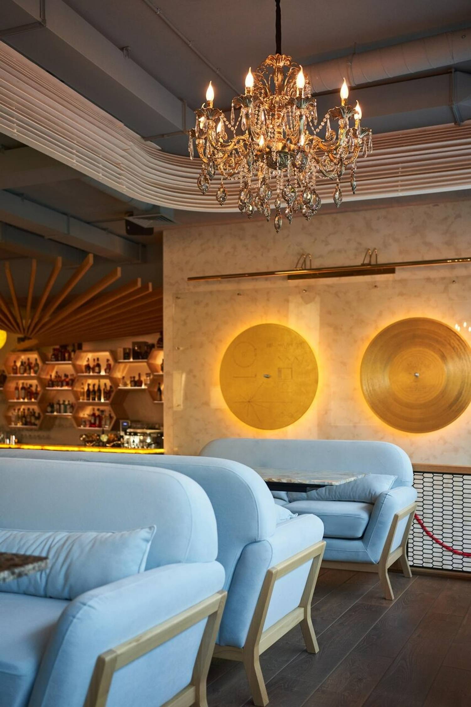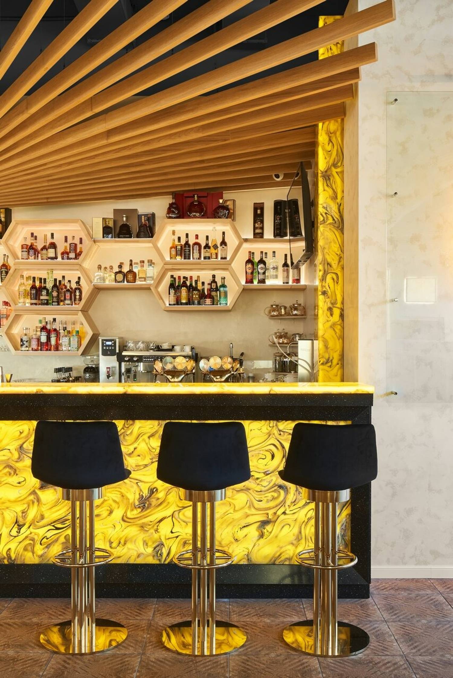 Атмосфера. Дизайн в концепции современного лаунжа с подвесной лампой в форме луны и белой светящейся колонной. Барная стойка с золотистой подсветкой дополнена полками-сотами с коллекцией алкоголя.