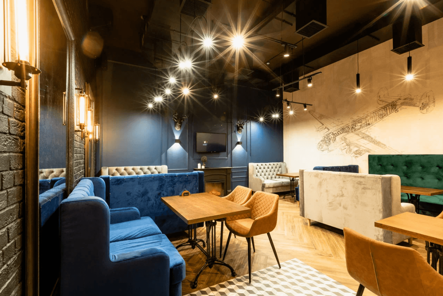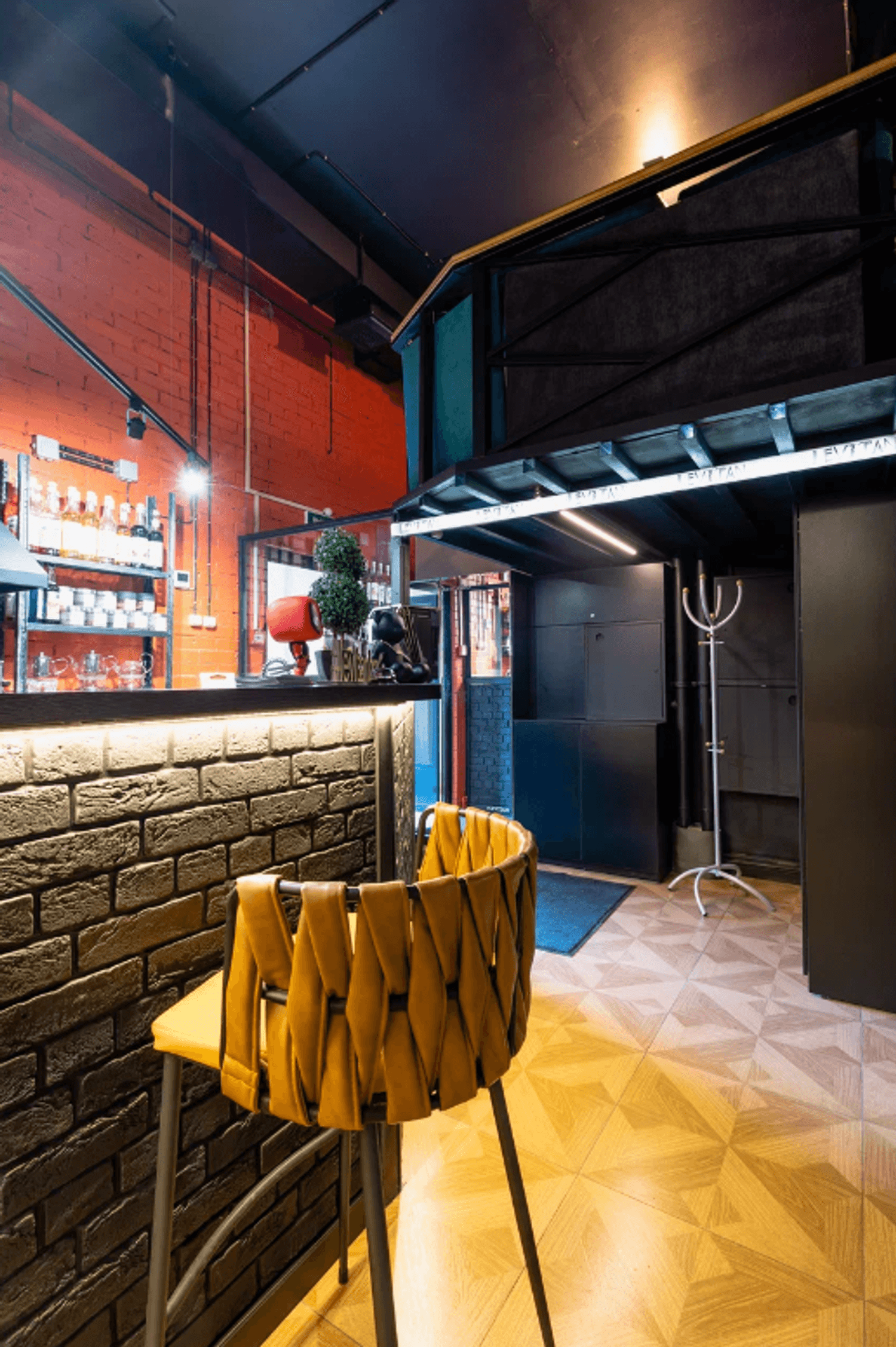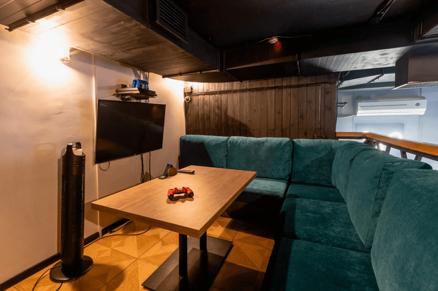 Атмосфера. Интерьер в синих и серых тонах с яркими терракотовыми акцентами создает камерную и уютную атмосферу. Здесь можно не только поесть и покурить кальян, но и поиграть в настольные игры или провести время за игровой приставкой.