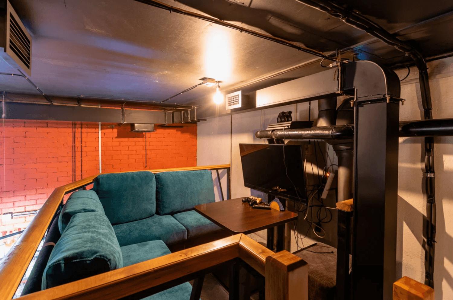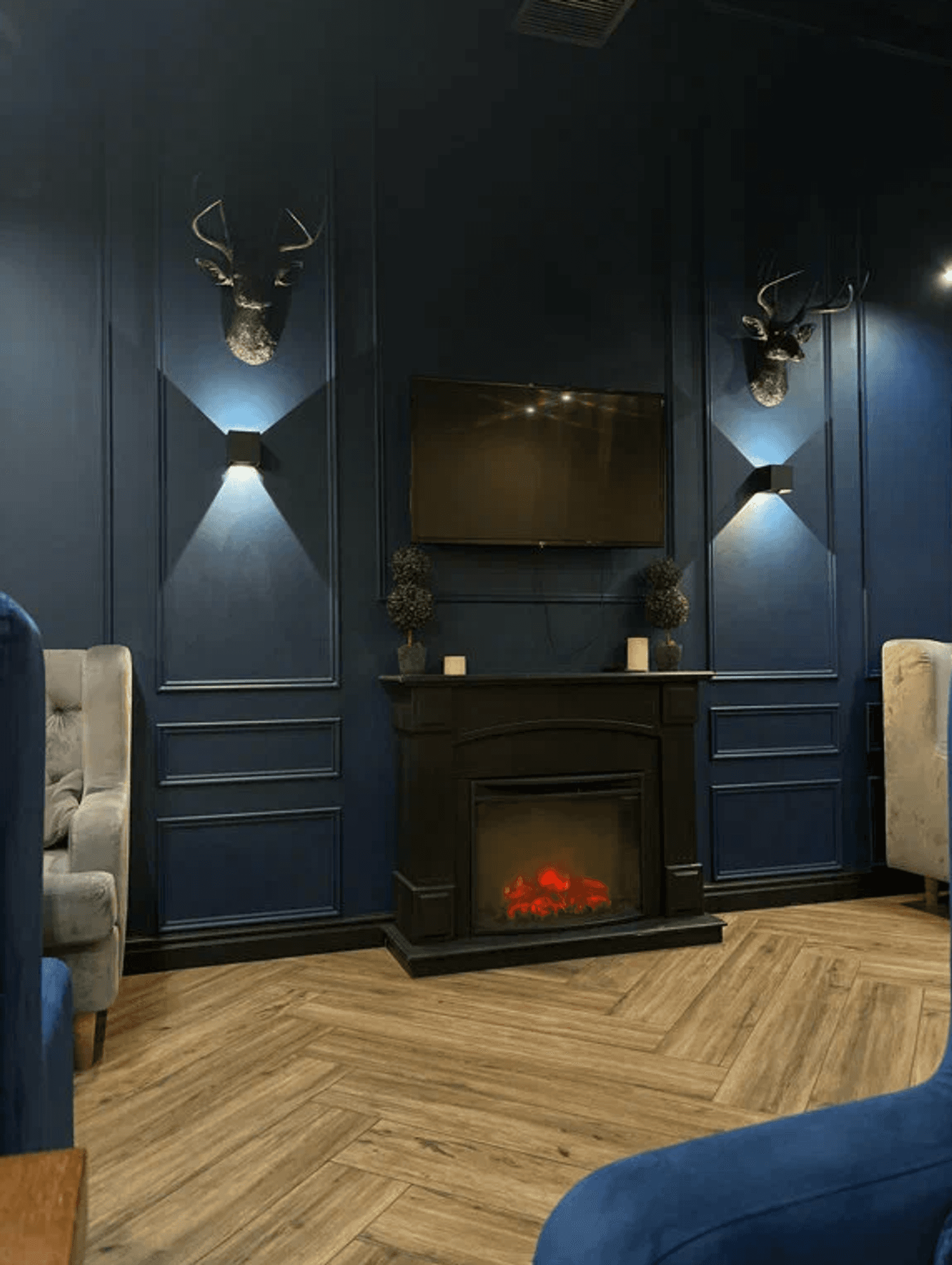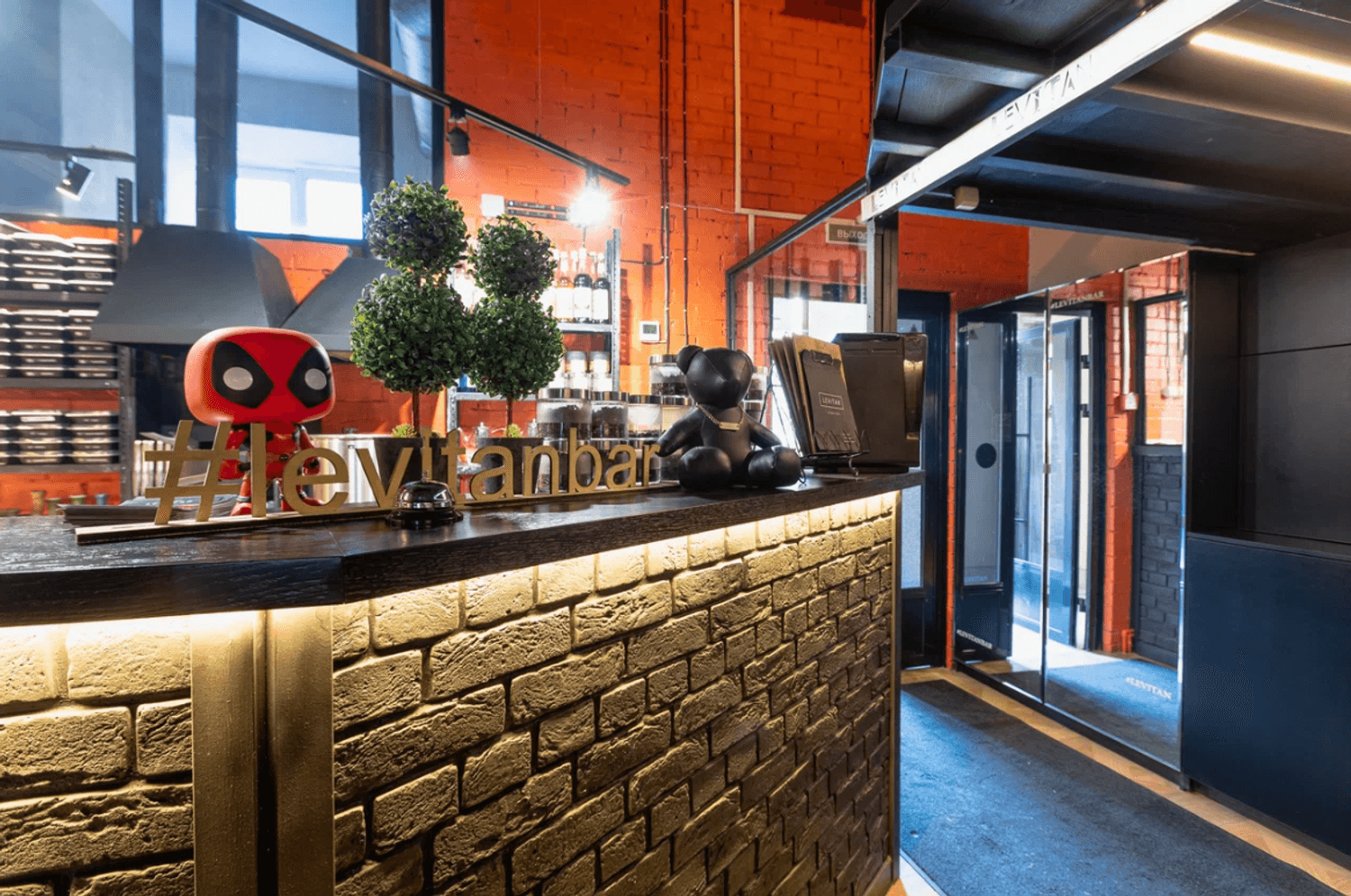 Атмосфера. Интерьер в синих и серых тонах с яркими терракотовыми акцентами создает камерную и уютную атмосферу. Здесь можно не только поесть и покурить кальян, но и поиграть в настольные игры или провести время за игровой приставкой.