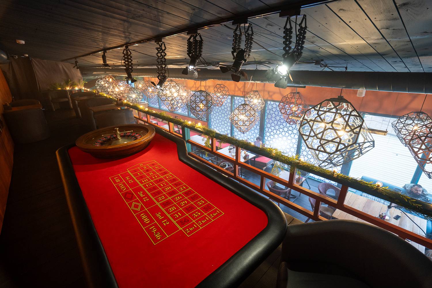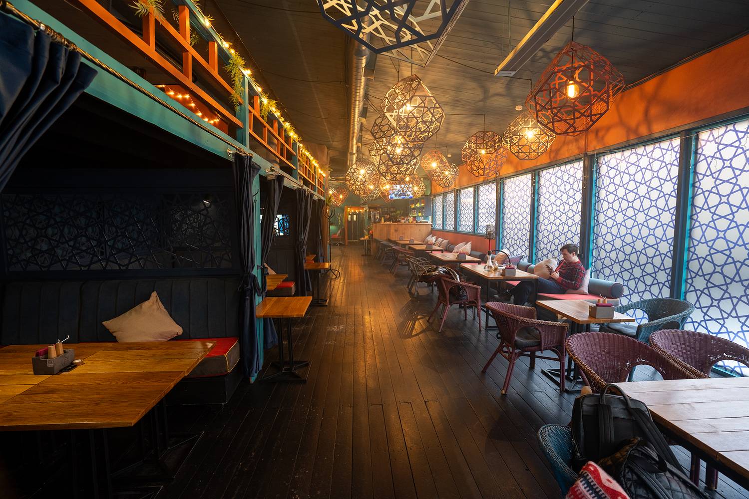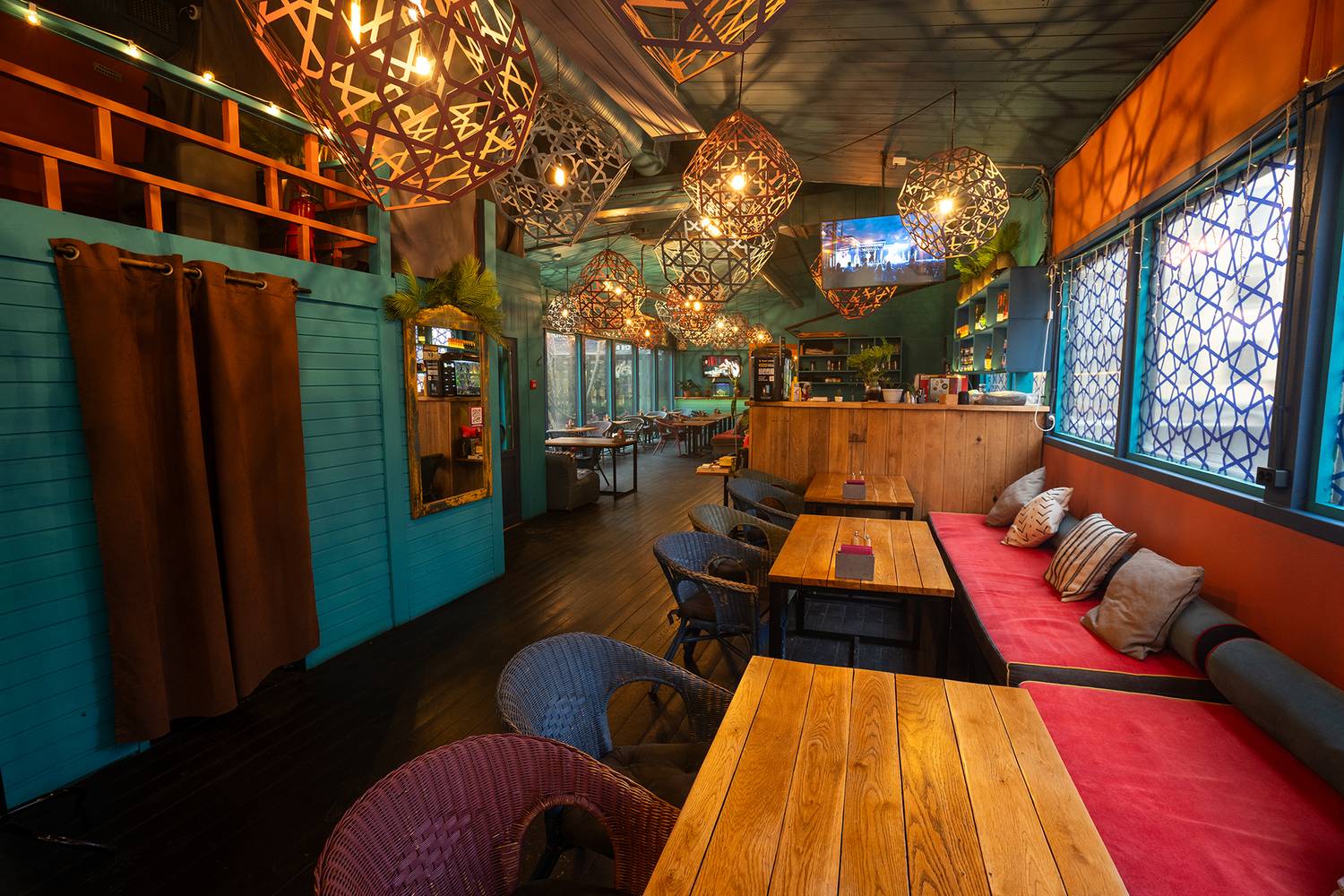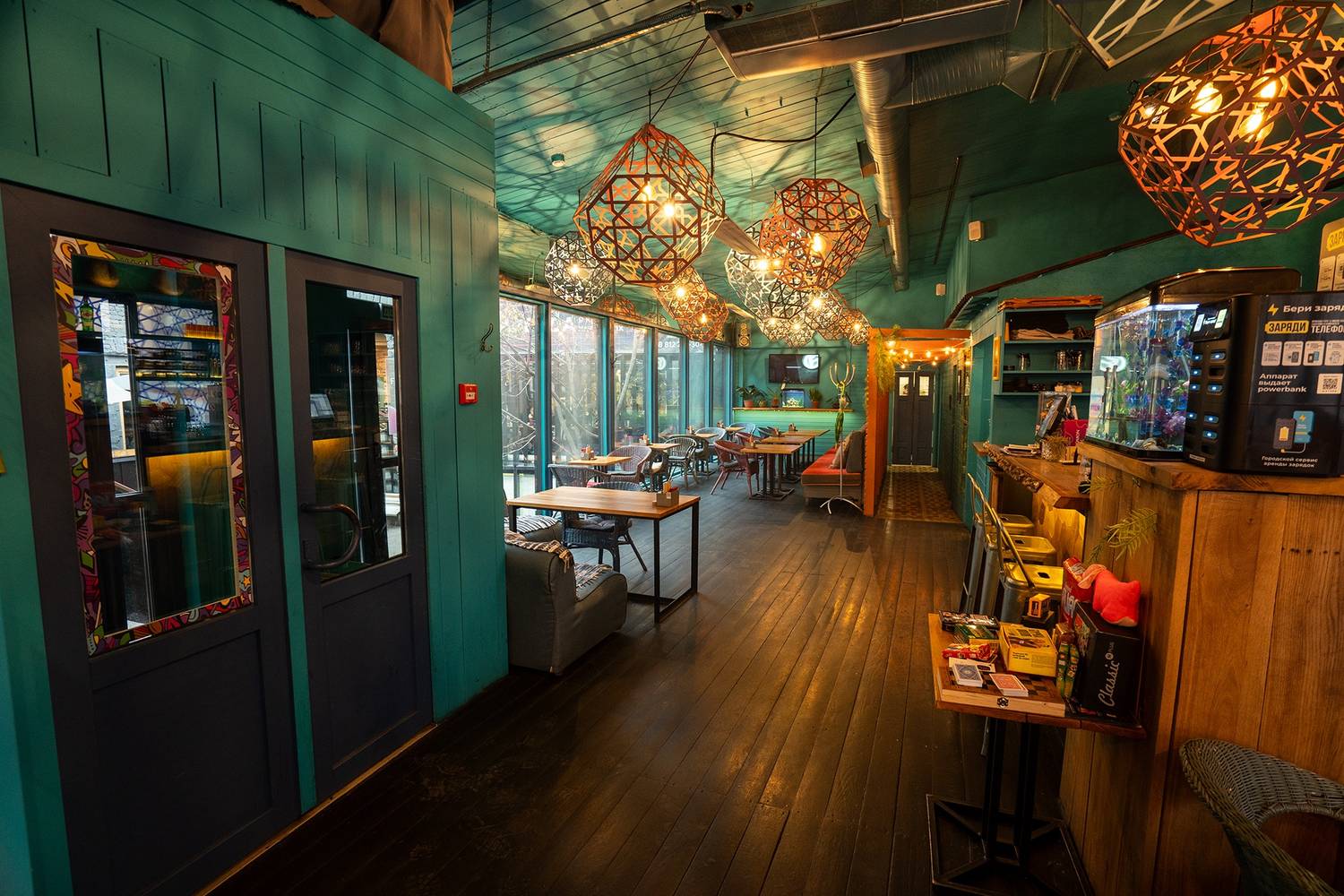 Атмосфера. Двухэтажный лаунж с кубинским колоритом: стены в оранжево-синей гамме, плетеная мебель, портрет Че Гевары и люстры с геометрическими узорами. Беседкообразные столы с перегородками, панорамные окна и летняя терраса с мягкими креслами предлагают разные сценариев отдыха.